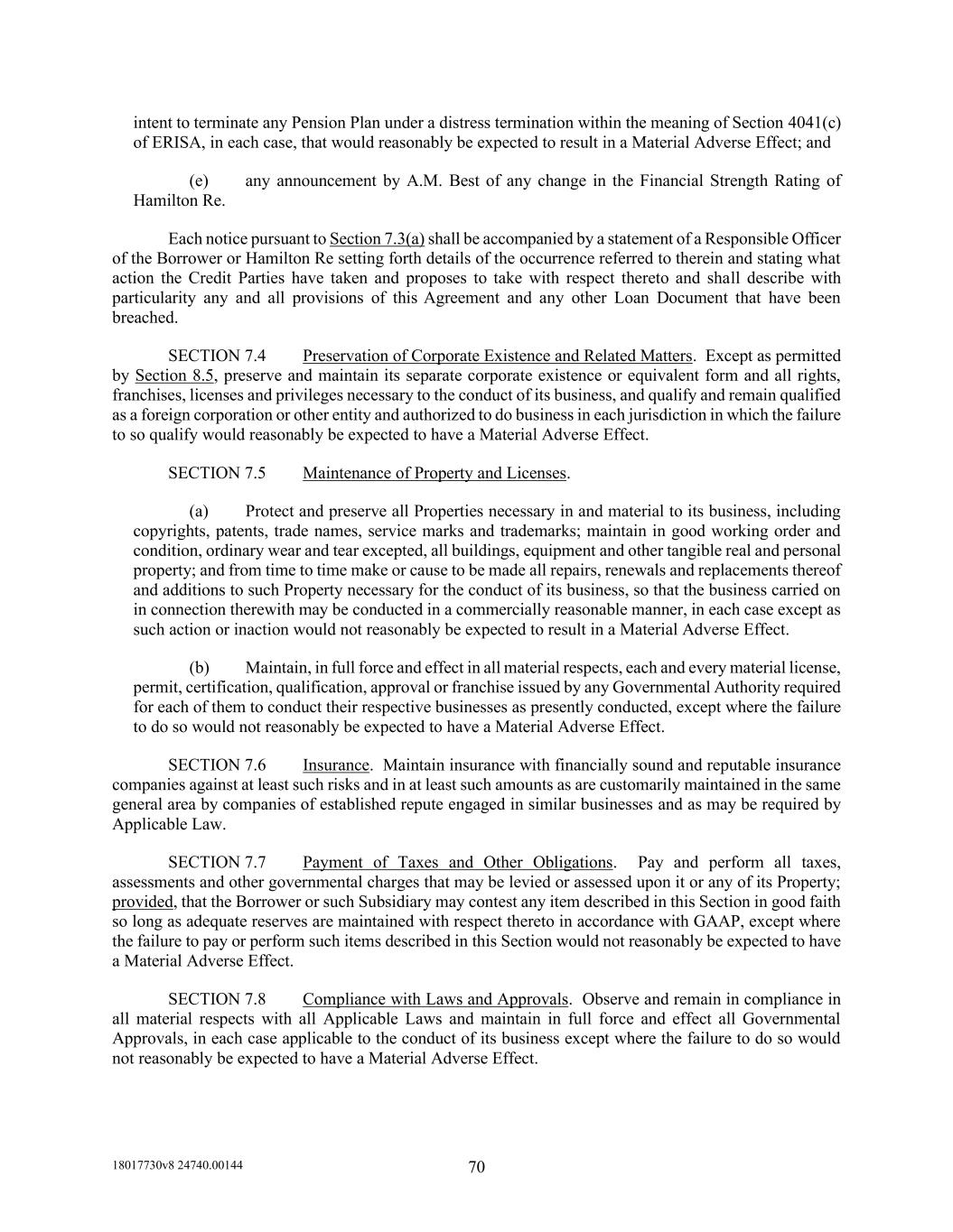 18017730v8 24740.00144 70 intent to terminate any Pension Plan under a distress termination within the meaning of Section 4041(c) of ERISA, in each case, that would reasonably be expected to result in a Material Adverse Effect; and (e) any announcement by A.M. Best of any change in the Financial Strength Rating of Hamilton Re. Each notice pursuant to Section 7.3(a) shall be accompanied by a statement of a Responsible Officer of the Borrower or Hamilton Re setting forth details of the occurrence referred to therein and stating what action the Credit Parties have taken and proposes to take with respect thereto and shall describe with particularity any and all provisions of this Agreement and any other Loan Document that have been breached. SECTION 7.4 Preservation of Corporate Existence and Related Matters. Except as permitted by Section 8.5, preserve and maintain its separate corporate existence or equivalent form and all rights, franchises, licenses and privileges necessary to the conduct of its business, and qualify and remain qualified as a foreign corporation or other entity and authorized to do business in each jurisdiction in which the failure to so qualify would reasonably be expected to have a Material Adverse Effect. SECTION 7.5 Maintenance of Property and Licenses. (a) Protect and preserve all Properties necessary in and material to its business, including copyrights, patents, trade names, service marks and trademarks; maintain in good working order and condition, ordinary wear and tear excepted, all buildings, equipment and other tangible real and personal property; and from time to time make or cause to be made all repairs, renewals and replacements thereof and additions to such Property necessary for the conduct of its business, so that the business carried on in connection therewith may be conducted in a commercially reasonable manner, in each case except as such action or inaction would not reasonably be expected to result in a Material Adverse Effect. (b) Maintain, in full force and effect in all material respects, each and every material license, permit, certification, qualification, approval or franchise issued by any Governmental Authority required for each of them to conduct their respective businesses as presently conducted, except where the failure to do so would not reasonably be expected to have a Material Adverse Effect. SECTION 7.6 Insurance. Maintain insurance with financially sound and reputable insurance companies against at least such risks and in at least such amounts as are customarily maintained in the same general area by companies of established repute engaged in similar businesses and as may be required by Applicable Law. SECTION 7.7 Payment of Taxes and Other Obligations. Pay and perform all taxes, assessments and other governmental charges that may be levied or assessed upon it or any of its Property; provided, that the Borrower or such Subsidiary may contest any item described in this Section in good faith so long as adequate reserves are maintained with respect thereto in accordance with GAAP, except where the failure to pay or perform such items described in this Section would not reasonably be expected to have a Material Adverse Effect. SECTION 7.8 Compliance with Laws and Approvals. Observe and remain in compliance in all material respects with all Applicable Laws and maintain in full force and effect all Governmental Approvals, in each case applicable to the conduct of its business except where the failure to do so would not reasonably be expected to have a Material Adverse Effect.