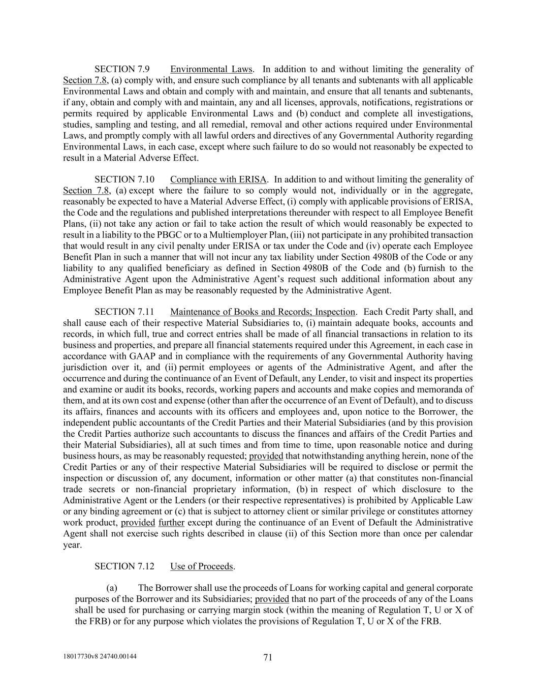 18017730v8 24740.00144 71 SECTION 7.9 Environmental Laws. In addition to and without limiting the generality of Section 7.8, (a) comply with, and ensure such compliance by all tenants and subtenants with all applicable Environmental Laws and obtain and comply with and maintain, and ensure that all tenants and subtenants, if any, obtain and comply with and maintain, any and all licenses, approvals, notifications, registrations or permits required by applicable Environmental Laws and (b) conduct and complete all investigations, studies, sampling and testing, and all remedial, removal and other actions required under Environmental Laws, and promptly comply with all lawful orders and directives of any Governmental Authority regarding Environmental Laws, in each case, except where such failure to do so would not reasonably be expected to result in a Material Adverse Effect. SECTION 7.10 Compliance with ERISA. In addition to and without limiting the generality of Section 7.8, (a) except where the failure to so comply would not, individually or in the aggregate, reasonably be expected to have a Material Adverse Effect, (i) comply with applicable provisions of ERISA, the Code and the regulations and published interpretations thereunder with respect to all Employee Benefit Plans, (ii) not take any action or fail to take action the result of which would reasonably be expected to result in a liability to the PBGC or to a Multiemployer Plan, (iii) not participate in any prohibited transaction that would result in any civil penalty under ERISA or tax under the Code and (iv) operate each Employee Benefit Plan in such a manner that will not incur any tax liability under Section 4980B of the Code or any liability to any qualified beneficiary as defined in Section 4980B of the Code and (b) furnish to the Administrative Agent upon the Administrative Agent’s request such additional information about any Employee Benefit Plan as may be reasonably requested by the Administrative Agent. SECTION 7.11 Maintenance of Books and Records; Inspection. Each Credit Party shall, and shall cause each of their respective Material Subsidiaries to, (i) maintain adequate books, accounts and records, in which full, true and correct entries shall be made of all financial transactions in relation to its business and properties, and prepare all financial statements required under this Agreement, in each case in accordance with GAAP and in compliance with the requirements of any Governmental Authority having jurisdiction over it, and (ii) permit employees or agents of the Administrative Agent, and after the occurrence and during the continuance of an Event of Default, any Lender, to visit and inspect its properties and examine or audit its books, records, working papers and accounts and make copies and memoranda of them, and at its own cost and expense (other than after the occurrence of an Event of Default), and to discuss its affairs, finances and accounts with its officers and employees and, upon notice to the Borrower, the independent public accountants of the Credit Parties and their Material Subsidiaries (and by this provision the Credit Parties authorize such accountants to discuss the finances and affairs of the Credit Parties and their Material Subsidiaries), all at such times and from time to time, upon reasonable notice and during business hours, as may be reasonably requested; provided that notwithstanding anything herein, none of the Credit Parties or any of their respective Material Subsidiaries will be required to disclose or permit the inspection or discussion of, any document, information or other matter (a) that constitutes non-financial trade secrets or non-financial proprietary information, (b) in respect of which disclosure to the Administrative Agent or the Lenders (or their respective representatives) is prohibited by Applicable Law or any binding agreement or (c) that is subject to attorney client or similar privilege or constitutes attorney work product, provided further except during the continuance of an Event of Default the Administrative Agent shall not exercise such rights described in clause (ii) of this Section more than once per calendar year. SECTION 7.12 Use of Proceeds. (a) The Borrower shall use the proceeds of Loans for working capital and general corporate purposes of the Borrower and its Subsidiaries; provided that no part of the proceeds of any of the Loans shall be used for purchasing or carrying margin stock (within the meaning of Regulation T, U or X of the FRB) or for any purpose which violates the provisions of Regulation T, U or X of the FRB.