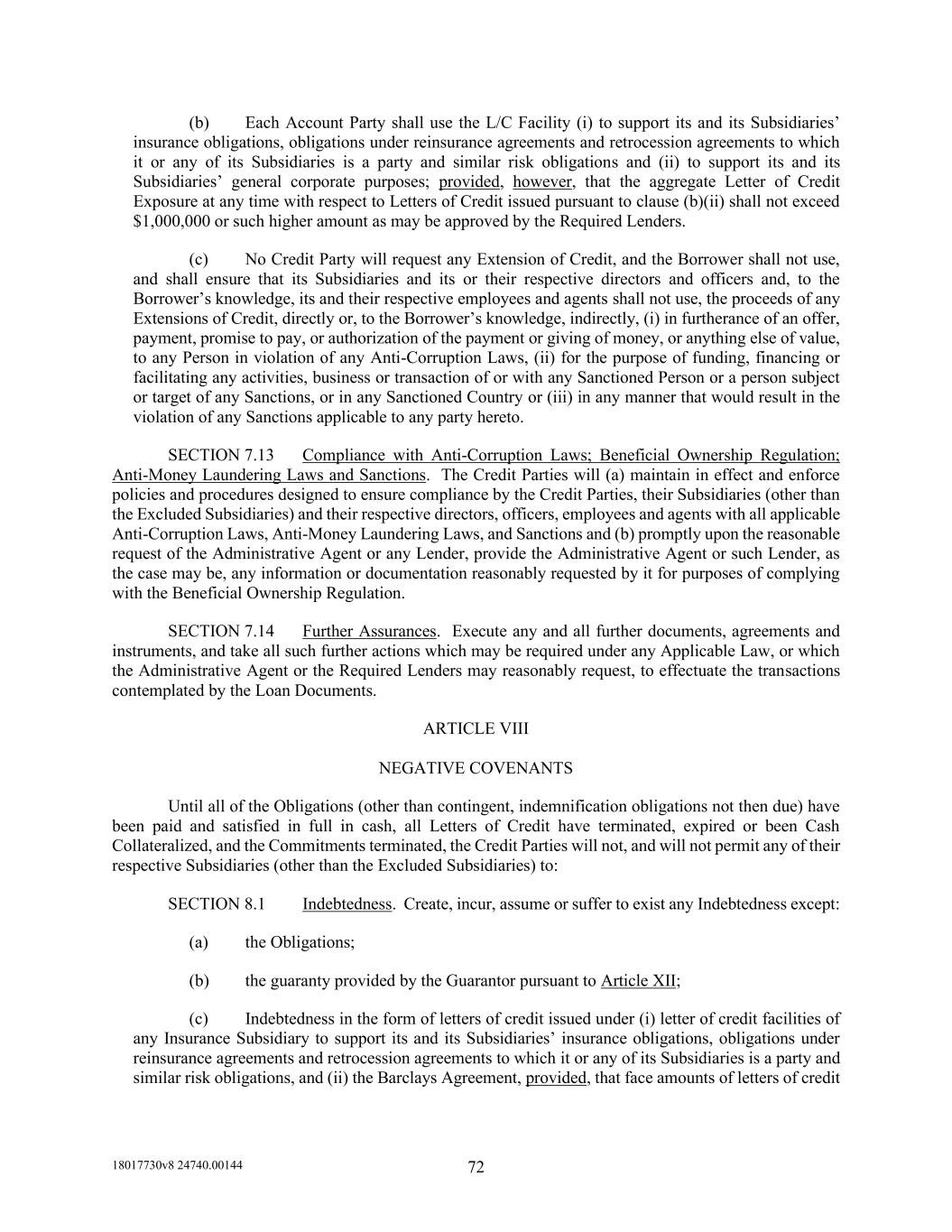 18017730v8 24740.00144 72 (b) Each Account Party shall use the L/C Facility (i) to support its and its Subsidiaries’ insurance obligations, obligations under reinsurance agreements and retrocession agreements to which it or any of its Subsidiaries is a party and similar risk obligations and (ii) to support its and its Subsidiaries’ general corporate purposes; provided, however, that the aggregate Letter of Credit Exposure at any time with respect to Letters of Credit issued pursuant to clause (b)(ii) shall not exceed $1,000,000 or such higher amount as may be approved by the Required Lenders. (c) No Credit Party will request any Extension of Credit, and the Borrower shall not use, and shall ensure that its Subsidiaries and its or their respective directors and officers and, to the Borrower’s knowledge, its and their respective employees and agents shall not use, the proceeds of any Extensions of Credit, directly or, to the Borrower’s knowledge, indirectly, (i) in furtherance of an offer, payment, promise to pay, or authorization of the payment or giving of money, or anything else of value, to any Person in violation of any Anti-Corruption Laws, (ii) for the purpose of funding, financing or facilitating any activities, business or transaction of or with any Sanctioned Person or a person subject or target of any Sanctions, or in any Sanctioned Country or (iii) in any manner that would result in the violation of any Sanctions applicable to any party hereto. SECTION 7.13 Compliance with Anti-Corruption Laws; Beneficial Ownership Regulation; Anti-Money Laundering Laws and Sanctions. The Credit Parties will (a) maintain in effect and enforce policies and procedures designed to ensure compliance by the Credit Parties, their Subsidiaries (other than the Excluded Subsidiaries) and their respective directors, officers, employees and agents with all applicable Anti-Corruption Laws, Anti-Money Laundering Laws, and Sanctions and (b) promptly upon the reasonable request of the Administrative Agent or any Lender, provide the Administrative Agent or such Lender, as the case may be, any information or documentation reasonably requested by it for purposes of complying with the Beneficial Ownership Regulation. SECTION 7.14 Further Assurances. Execute any and all further documents, agreements and instruments, and take all such further actions which may be required under any Applicable Law, or which the Administrative Agent or the Required Lenders may reasonably request, to effectuate the transactions contemplated by the Loan Documents. ARTICLE VIII NEGATIVE COVENANTS Until all of the Obligations (other than contingent, indemnification obligations not then due) have been paid and satisfied in full in cash, all Letters of Credit have terminated, expired or been Cash Collateralized, and the Commitments terminated, the Credit Parties will not, and will not permit any of their respective Subsidiaries (other than the Excluded Subsidiaries) to: SECTION 8.1 Indebtedness. Create, incur, assume or suffer to exist any Indebtedness except: (a) the Obligations; (b) the guaranty provided by the Guarantor pursuant to Article XII; (c) Indebtedness in the form of letters of credit issued under (i) letter of credit facilities of any Insurance Subsidiary to support its and its Subsidiaries’ insurance obligations, obligations under reinsurance agreements and retrocession agreements to which it or any of its Subsidiaries is a party and similar risk obligations, and (ii) the Barclays Agreement, provided, that face amounts of letters of credit