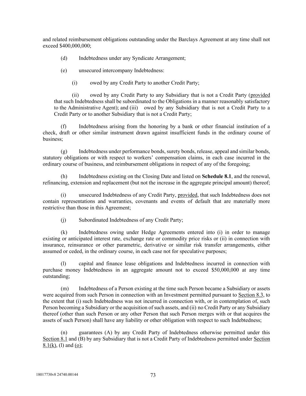 18017730v8 24740.00144 73 and related reimbursement obligations outstanding under the Barclays Agreement at any time shall not exceed $400,000,000; (d) Indebtedness under any Syndicate Arrangement; (e) unsecured intercompany Indebtedness: (i) owed by any Credit Party to another Credit Party; (ii) owed by any Credit Party to any Subsidiary that is not a Credit Party (provided that such Indebtedness shall be subordinated to the Obligations in a manner reasonably satisfactory to the Administrative Agent); and (iii) owed by any Subsidiary that is not a Credit Party to a Credit Party or to another Subsidiary that is not a Credit Party; (f) Indebtedness arising from the honoring by a bank or other financial institution of a check, draft or other similar instrument drawn against insufficient funds in the ordinary course of business; (g) Indebtedness under performance bonds, surety bonds, release, appeal and similar bonds, statutory obligations or with respect to workers’ compensation claims, in each case incurred in the ordinary course of business, and reimbursement obligations in respect of any of the foregoing; (h) Indebtedness existing on the Closing Date and listed on Schedule 8.1, and the renewal, refinancing, extension and replacement (but not the increase in the aggregate principal amount) thereof; (i) unsecured Indebtedness of any Credit Party, provided, that such Indebtedness does not contain representations and warranties, covenants and events of default that are materially more restrictive than those in this Agreement; (j) Subordinated Indebtedness of any Credit Party; (k) Indebtedness owing under Hedge Agreements entered into (i) in order to manage existing or anticipated interest rate, exchange rate or commodity price risks or (ii) in connection with insurance, reinsurance or other parametric, derivative or similar risk transfer arrangements, either assumed or ceded, in the ordinary course, in each case not for speculative purposes; (l) capital and finance lease obligations and Indebtedness incurred in connection with purchase money Indebtedness in an aggregate amount not to exceed $50,000,000 at any time outstanding; (m) Indebtedness of a Person existing at the time such Person became a Subsidiary or assets were acquired from such Person in connection with an Investment permitted pursuant to Section 8.3, to the extent that (i) such Indebtedness was not incurred in connection with, or in contemplation of, such Person becoming a Subsidiary or the acquisition of such assets, and (ii) no Credit Party or any Subsidiary thereof (other than such Person or any other Person that such Person merges with or that acquires the assets of such Person) shall have any liability or other obligation with respect to such Indebtedness; (n) guarantees (A) by any Credit Party of Indebtedness otherwise permitted under this Section 8.1 and (B) by any Subsidiary that is not a Credit Party of Indebtedness permitted under Section 8.1(k), (l) and (o);