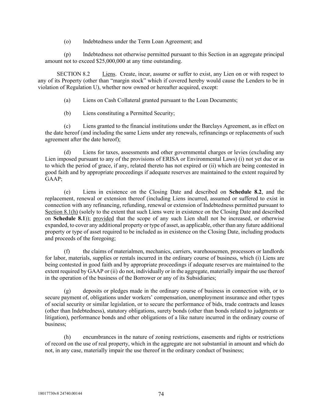 18017730v8 24740.00144 74 (o) Indebtedness under the Term Loan Agreement; and (p) Indebtedness not otherwise permitted pursuant to this Section in an aggregate principal amount not to exceed $25,000,000 at any time outstanding. SECTION 8.2 Liens. Create, incur, assume or suffer to exist, any Lien on or with respect to any of its Property (other than “margin stock” which if covered hereby would cause the Lenders to be in violation of Regulation U), whether now owned or hereafter acquired, except: (a) Liens on Cash Collateral granted pursuant to the Loan Documents; (b) Liens constituting a Permitted Security; (c) Liens granted to the financial institutions under the Barclays Agreement, as in effect on the date hereof (and including the same Liens under any renewals, refinancings or replacements of such agreement after the date hereof); (d) Liens for taxes, assessments and other governmental charges or levies (excluding any Lien imposed pursuant to any of the provisions of ERISA or Environmental Laws) (i) not yet due or as to which the period of grace, if any, related thereto has not expired or (ii) which are being contested in good faith and by appropriate proceedings if adequate reserves are maintained to the extent required by GAAP; (e) Liens in existence on the Closing Date and described on Schedule 8.2, and the replacement, renewal or extension thereof (including Liens incurred, assumed or suffered to exist in connection with any refinancing, refunding, renewal or extension of Indebtedness permitted pursuant to Section 8.1(h) (solely to the extent that such Liens were in existence on the Closing Date and described on Schedule 8.1)); provided that the scope of any such Lien shall not be increased, or otherwise expanded, to cover any additional property or type of asset, as applicable, other than any future additional property or type of asset required to be included as in existence on the Closing Date, including products and proceeds of the foregoing; (f) the claims of materialmen, mechanics, carriers, warehousemen, processors or landlords for labor, materials, supplies or rentals incurred in the ordinary course of business, which (i) Liens are being contested in good faith and by appropriate proceedings if adequate reserves are maintained to the extent required by GAAP or (ii) do not, individually or in the aggregate, materially impair the use thereof in the operation of the business of the Borrower or any of its Subsidiaries; (g) deposits or pledges made in the ordinary course of business in connection with, or to secure payment of, obligations under workers’ compensation, unemployment insurance and other types of social security or similar legislation, or to secure the performance of bids, trade contracts and leases (other than Indebtedness), statutory obligations, surety bonds (other than bonds related to judgments or litigation), performance bonds and other obligations of a like nature incurred in the ordinary course of business; (h) encumbrances in the nature of zoning restrictions, easements and rights or restrictions of record on the use of real property, which in the aggregate are not substantial in amount and which do not, in any case, materially impair the use thereof in the ordinary conduct of business;