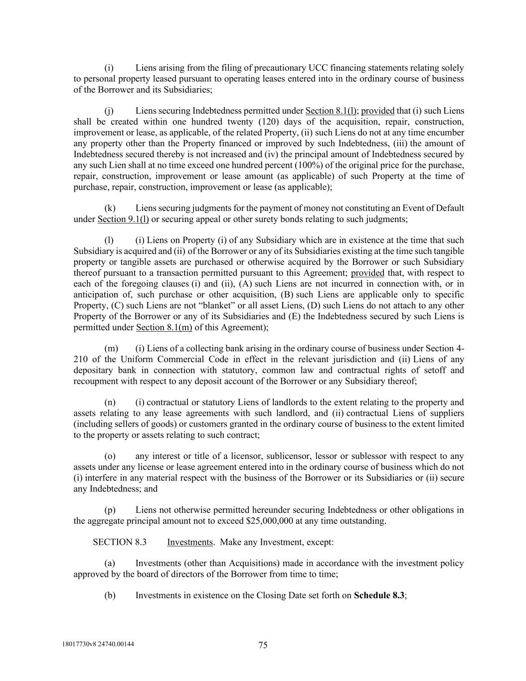 18017730v8 24740.00144 75 (i) Liens arising from the filing of precautionary UCC financing statements relating solely to personal property leased pursuant to operating leases entered into in the ordinary course of business of the Borrower and its Subsidiaries; (j) Liens securing Indebtedness permitted under Section 8.1(l); provided that (i) such Liens shall be created within one hundred twenty (120) days of the acquisition, repair, construction, improvement or lease, as applicable, of the related Property, (ii) such Liens do not at any time encumber any property other than the Property financed or improved by such Indebtedness, (iii) the amount of Indebtedness secured thereby is not increased and (iv) the principal amount of Indebtedness secured by any such Lien shall at no time exceed one hundred percent (100%) of the original price for the purchase, repair, construction, improvement or lease amount (as applicable) of such Property at the time of purchase, repair, construction, improvement or lease (as applicable); (k) Liens securing judgments for the payment of money not constituting an Event of Default under Section 9.1(l) or securing appeal or other surety bonds relating to such judgments; (l) (i) Liens on Property (i) of any Subsidiary which are in existence at the time that such Subsidiary is acquired and (ii) of the Borrower or any of its Subsidiaries existing at the time such tangible property or tangible assets are purchased or otherwise acquired by the Borrower or such Subsidiary thereof pursuant to a transaction permitted pursuant to this Agreement; provided that, with respect to each of the foregoing clauses (i) and (ii), (A) such Liens are not incurred in connection with, or in anticipation of, such purchase or other acquisition, (B) such Liens are applicable only to specific Property, (C) such Liens are not “blanket” or all asset Liens, (D) such Liens do not attach to any other Property of the Borrower or any of its Subsidiaries and (E) the Indebtedness secured by such Liens is permitted under Section 8.1(m) of this Agreement); (m) (i) Liens of a collecting bank arising in the ordinary course of business under Section 4- 210 of the Uniform Commercial Code in effect in the relevant jurisdiction and (ii) Liens of any depositary bank in connection with statutory, common law and contractual rights of setoff and recoupment with respect to any deposit account of the Borrower or any Subsidiary thereof; (n) (i) contractual or statutory Liens of landlords to the extent relating to the property and assets relating to any lease agreements with such landlord, and (ii) contractual Liens of suppliers (including sellers of goods) or customers granted in the ordinary course of business to the extent limited to the property or assets relating to such contract; (o) any interest or title of a licensor, sublicensor, lessor or sublessor with respect to any assets under any license or lease agreement entered into in the ordinary course of business which do not (i) interfere in any material respect with the business of the Borrower or its Subsidiaries or (ii) secure any Indebtedness; and (p) Liens not otherwise permitted hereunder securing Indebtedness or other obligations in the aggregate principal amount not to exceed $25,000,000 at any time outstanding. SECTION 8.3 Investments. Make any Investment, except: (a) Investments (other than Acquisitions) made in accordance with the investment policy approved by the board of directors of the Borrower from time to time; (b) Investments in existence on the Closing Date set forth on Schedule 8.3;