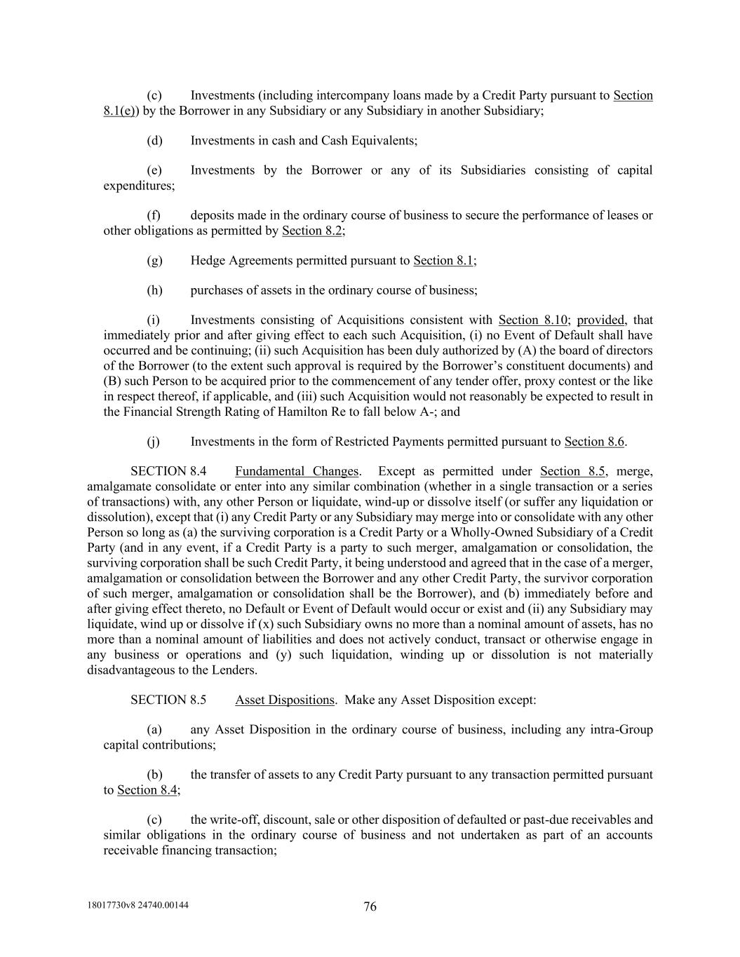 18017730v8 24740.00144 76 (c) Investments (including intercompany loans made by a Credit Party pursuant to Section 8.1(e)) by the Borrower in any Subsidiary or any Subsidiary in another Subsidiary; (d) Investments in cash and Cash Equivalents; (e) Investments by the Borrower or any of its Subsidiaries consisting of capital expenditures; (f) deposits made in the ordinary course of business to secure the performance of leases or other obligations as permitted by Section 8.2; (g) Hedge Agreements permitted pursuant to Section 8.1; (h) purchases of assets in the ordinary course of business; (i) Investments consisting of Acquisitions consistent with Section 8.10; provided, that immediately prior and after giving effect to each such Acquisition, (i) no Event of Default shall have occurred and be continuing; (ii) such Acquisition has been duly authorized by (A) the board of directors of the Borrower (to the extent such approval is required by the Borrower’s constituent documents) and (B) such Person to be acquired prior to the commencement of any tender offer, proxy contest or the like in respect thereof, if applicable, and (iii) such Acquisition would not reasonably be expected to result in the Financial Strength Rating of Hamilton Re to fall below A-; and (j) Investments in the form of Restricted Payments permitted pursuant to Section 8.6. SECTION 8.4 Fundamental Changes. Except as permitted under Section 8.5, merge, amalgamate consolidate or enter into any similar combination (whether in a single transaction or a series of transactions) with, any other Person or liquidate, wind-up or dissolve itself (or suffer any liquidation or dissolution), except that (i) any Credit Party or any Subsidiary may merge into or consolidate with any other Person so long as (a) the surviving corporation is a Credit Party or a Wholly-Owned Subsidiary of a Credit Party (and in any event, if a Credit Party is a party to such merger, amalgamation or consolidation, the surviving corporation shall be such Credit Party, it being understood and agreed that in the case of a merger, amalgamation or consolidation between the Borrower and any other Credit Party, the survivor corporation of such merger, amalgamation or consolidation shall be the Borrower), and (b) immediately before and after giving effect thereto, no Default or Event of Default would occur or exist and (ii) any Subsidiary may liquidate, wind up or dissolve if (x) such Subsidiary owns no more than a nominal amount of assets, has no more than a nominal amount of liabilities and does not actively conduct, transact or otherwise engage in any business or operations and (y) such liquidation, winding up or dissolution is not materially disadvantageous to the Lenders. SECTION 8.5 Asset Dispositions. Make any Asset Disposition except: (a) any Asset Disposition in the ordinary course of business, including any intra-Group capital contributions; (b) the transfer of assets to any Credit Party pursuant to any transaction permitted pursuant to Section 8.4; (c) the write-off, discount, sale or other disposition of defaulted or past-due receivables and similar obligations in the ordinary course of business and not undertaken as part of an accounts receivable financing transaction;