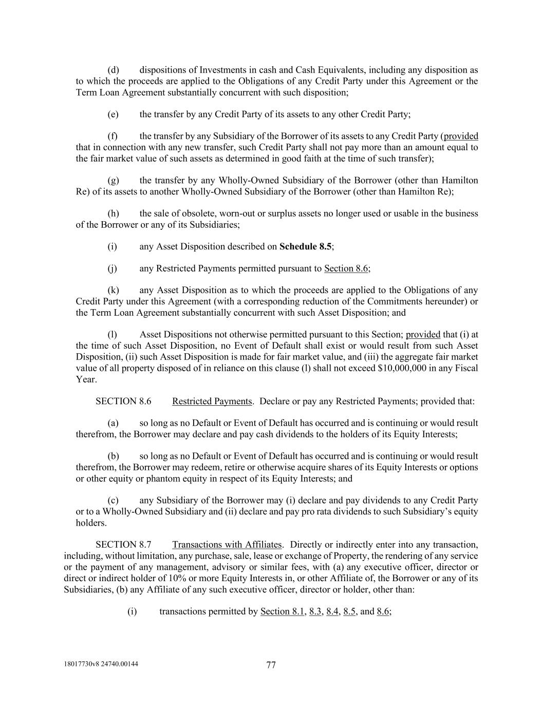 18017730v8 24740.00144 77 (d) dispositions of Investments in cash and Cash Equivalents, including any disposition as to which the proceeds are applied to the Obligations of any Credit Party under this Agreement or the Term Loan Agreement substantially concurrent with such disposition; (e) the transfer by any Credit Party of its assets to any other Credit Party; (f) the transfer by any Subsidiary of the Borrower of its assets to any Credit Party (provided that in connection with any new transfer, such Credit Party shall not pay more than an amount equal to the fair market value of such assets as determined in good faith at the time of such transfer); (g) the transfer by any Wholly-Owned Subsidiary of the Borrower (other than Hamilton Re) of its assets to another Wholly-Owned Subsidiary of the Borrower (other than Hamilton Re); (h) the sale of obsolete, worn-out or surplus assets no longer used or usable in the business of the Borrower or any of its Subsidiaries; (i) any Asset Disposition described on Schedule 8.5; (j) any Restricted Payments permitted pursuant to Section 8.6; (k) any Asset Disposition as to which the proceeds are applied to the Obligations of any Credit Party under this Agreement (with a corresponding reduction of the Commitments hereunder) or the Term Loan Agreement substantially concurrent with such Asset Disposition; and (l) Asset Dispositions not otherwise permitted pursuant to this Section; provided that (i) at the time of such Asset Disposition, no Event of Default shall exist or would result from such Asset Disposition, (ii) such Asset Disposition is made for fair market value, and (iii) the aggregate fair market value of all property disposed of in reliance on this clause (l) shall not exceed $10,000,000 in any Fiscal Year. SECTION 8.6 Restricted Payments. Declare or pay any Restricted Payments; provided that: (a) so long as no Default or Event of Default has occurred and is continuing or would result therefrom, the Borrower may declare and pay cash dividends to the holders of its Equity Interests; (b) so long as no Default or Event of Default has occurred and is continuing or would result therefrom, the Borrower may redeem, retire or otherwise acquire shares of its Equity Interests or options or other equity or phantom equity in respect of its Equity Interests; and (c) any Subsidiary of the Borrower may (i) declare and pay dividends to any Credit Party or to a Wholly-Owned Subsidiary and (ii) declare and pay pro rata dividends to such Subsidiary’s equity holders. SECTION 8.7 Transactions with Affiliates. Directly or indirectly enter into any transaction, including, without limitation, any purchase, sale, lease or exchange of Property, the rendering of any service or the payment of any management, advisory or similar fees, with (a) any executive officer, director or direct or indirect holder of 10% or more Equity Interests in, or other Affiliate of, the Borrower or any of its Subsidiaries, (b) any Affiliate of any such executive officer, director or holder, other than: (i) transactions permitted by Section 8.1, 8.3, 8.4, 8.5, and 8.6;