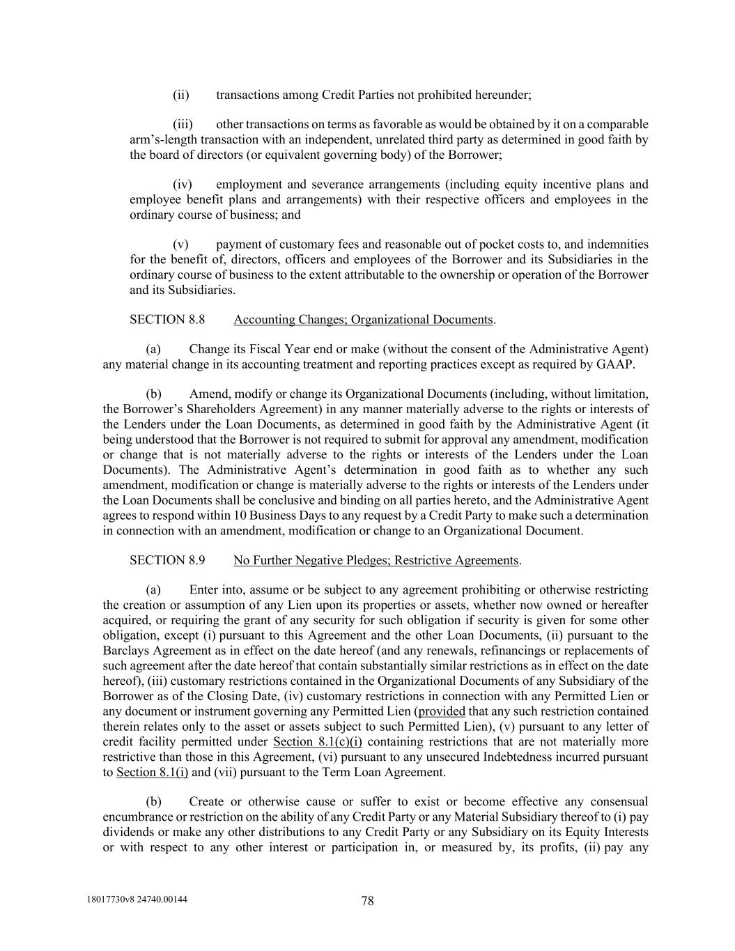 18017730v8 24740.00144 78 (ii) transactions among Credit Parties not prohibited hereunder; (iii) other transactions on terms as favorable as would be obtained by it on a comparable arm’s-length transaction with an independent, unrelated third party as determined in good faith by the board of directors (or equivalent governing body) of the Borrower; (iv) employment and severance arrangements (including equity incentive plans and employee benefit plans and arrangements) with their respective officers and employees in the ordinary course of business; and (v) payment of customary fees and reasonable out of pocket costs to, and indemnities for the benefit of, directors, officers and employees of the Borrower and its Subsidiaries in the ordinary course of business to the extent attributable to the ownership or operation of the Borrower and its Subsidiaries. SECTION 8.8 Accounting Changes; Organizational Documents. (a) Change its Fiscal Year end or make (without the consent of the Administrative Agent) any material change in its accounting treatment and reporting practices except as required by GAAP. (b) Amend, modify or change its Organizational Documents (including, without limitation, the Borrower’s Shareholders Agreement) in any manner materially adverse to the rights or interests of the Lenders under the Loan Documents, as determined in good faith by the Administrative Agent (it being understood that the Borrower is not required to submit for approval any amendment, modification or change that is not materially adverse to the rights or interests of the Lenders under the Loan Documents). The Administrative Agent’s determination in good faith as to whether any such amendment, modification or change is materially adverse to the rights or interests of the Lenders under the Loan Documents shall be conclusive and binding on all parties hereto, and the Administrative Agent agrees to respond within 10 Business Days to any request by a Credit Party to make such a determination in connection with an amendment, modification or change to an Organizational Document. SECTION 8.9 No Further Negative Pledges; Restrictive Agreements. (a) Enter into, assume or be subject to any agreement prohibiting or otherwise restricting the creation or assumption of any Lien upon its properties or assets, whether now owned or hereafter acquired, or requiring the grant of any security for such obligation if security is given for some other obligation, except (i) pursuant to this Agreement and the other Loan Documents, (ii) pursuant to the Barclays Agreement as in effect on the date hereof (and any renewals, refinancings or replacements of such agreement after the date hereof that contain substantially similar restrictions as in effect on the date hereof), (iii) customary restrictions contained in the Organizational Documents of any Subsidiary of the Borrower as of the Closing Date, (iv) customary restrictions in connection with any Permitted Lien or any document or instrument governing any Permitted Lien (provided that any such restriction contained therein relates only to the asset or assets subject to such Permitted Lien), (v) pursuant to any letter of credit facility permitted under Section 8.1(c)(i) containing restrictions that are not materially more restrictive than those in this Agreement, (vi) pursuant to any unsecured Indebtedness incurred pursuant to Section 8.1(i) and (vii) pursuant to the Term Loan Agreement. (b) Create or otherwise cause or suffer to exist or become effective any consensual encumbrance or restriction on the ability of any Credit Party or any Material Subsidiary thereof to (i) pay dividends or make any other distributions to any Credit Party or any Subsidiary on its Equity Interests or with respect to any other interest or participation in, or measured by, its profits, (ii) pay any