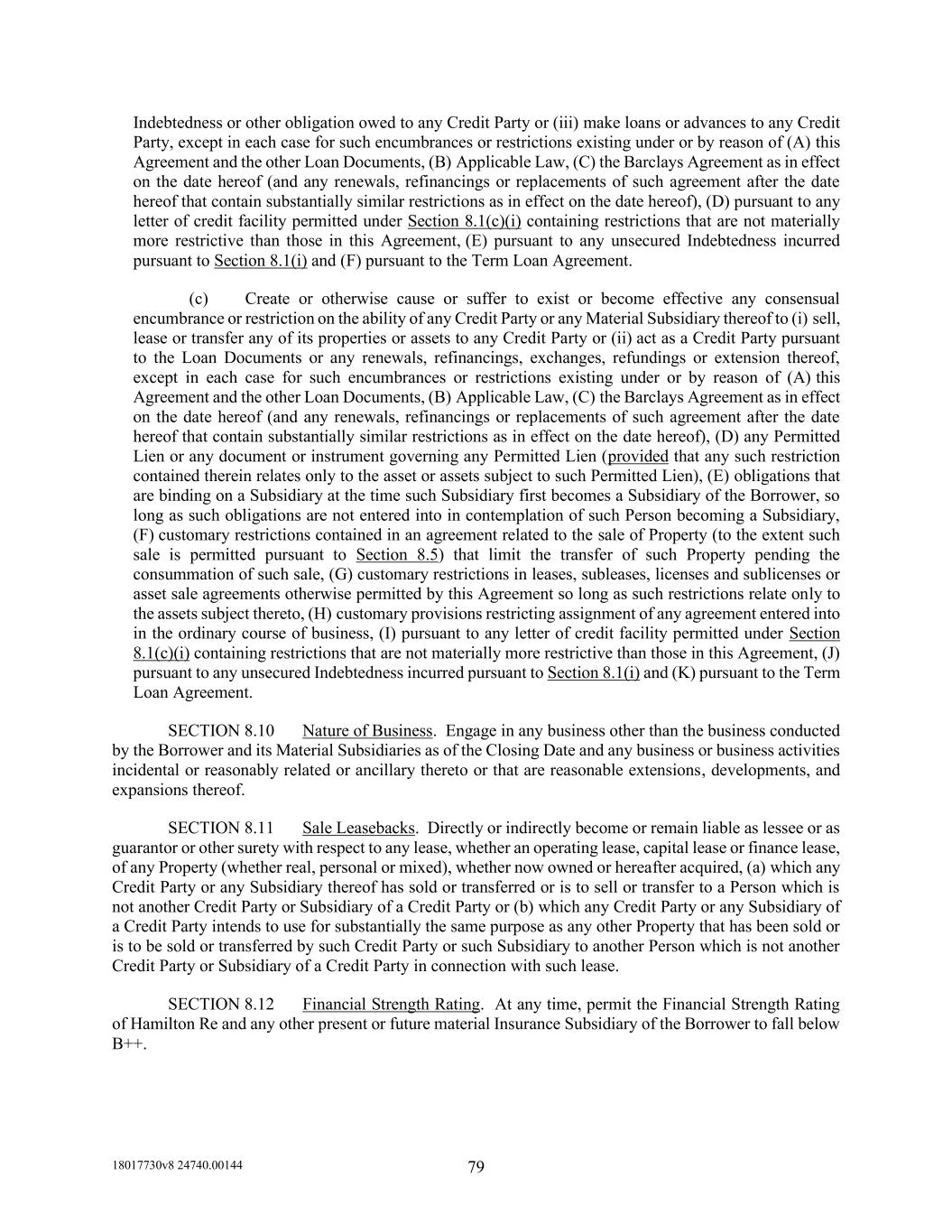 18017730v8 24740.00144 79 Indebtedness or other obligation owed to any Credit Party or (iii) make loans or advances to any Credit Party, except in each case for such encumbrances or restrictions existing under or by reason of (A) this Agreement and the other Loan Documents, (B) Applicable Law, (C) the Barclays Agreement as in effect on the date hereof (and any renewals, refinancings or replacements of such agreement after the date hereof that contain substantially similar restrictions as in effect on the date hereof), (D) pursuant to any letter of credit facility permitted under Section 8.1(c)(i) containing restrictions that are not materially more restrictive than those in this Agreement, (E) pursuant to any unsecured Indebtedness incurred pursuant to Section 8.1(i) and (F) pursuant to the Term Loan Agreement. (c) Create or otherwise cause or suffer to exist or become effective any consensual encumbrance or restriction on the ability of any Credit Party or any Material Subsidiary thereof to (i) sell, lease or transfer any of its properties or assets to any Credit Party or (ii) act as a Credit Party pursuant to the Loan Documents or any renewals, refinancings, exchanges, refundings or extension thereof, except in each case for such encumbrances or restrictions existing under or by reason of (A) this Agreement and the other Loan Documents, (B) Applicable Law, (C) the Barclays Agreement as in effect on the date hereof (and any renewals, refinancings or replacements of such agreement after the date hereof that contain substantially similar restrictions as in effect on the date hereof), (D) any Permitted Lien or any document or instrument governing any Permitted Lien (provided that any such restriction contained therein relates only to the asset or assets subject to such Permitted Lien), (E) obligations that are binding on a Subsidiary at the time such Subsidiary first becomes a Subsidiary of the Borrower, so long as such obligations are not entered into in contemplation of such Person becoming a Subsidiary, (F) customary restrictions contained in an agreement related to the sale of Property (to the extent such sale is permitted pursuant to Section 8.5) that limit the transfer of such Property pending the consummation of such sale, (G) customary restrictions in leases, subleases, licenses and sublicenses or asset sale agreements otherwise permitted by this Agreement so long as such restrictions relate only to the assets subject thereto, (H) customary provisions restricting assignment of any agreement entered into in the ordinary course of business, (I) pursuant to any letter of credit facility permitted under Section 8.1(c)(i) containing restrictions that are not materially more restrictive than those in this Agreement, (J) pursuant to any unsecured Indebtedness incurred pursuant to Section 8.1(i) and (K) pursuant to the Term Loan Agreement. SECTION 8.10 Nature of Business. Engage in any business other than the business conducted by the Borrower and its Material Subsidiaries as of the Closing Date and any business or business activities incidental or reasonably related or ancillary thereto or that are reasonable extensions, developments, and expansions thereof. SECTION 8.11 Sale Leasebacks. Directly or indirectly become or remain liable as lessee or as guarantor or other surety with respect to any lease, whether an operating lease, capital lease or finance lease, of any Property (whether real, personal or mixed), whether now owned or hereafter acquired, (a) which any Credit Party or any Subsidiary thereof has sold or transferred or is to sell or transfer to a Person which is not another Credit Party or Subsidiary of a Credit Party or (b) which any Credit Party or any Subsidiary of a Credit Party intends to use for substantially the same purpose as any other Property that has been sold or is to be sold or transferred by such Credit Party or such Subsidiary to another Person which is not another Credit Party or Subsidiary of a Credit Party in connection with such lease. SECTION 8.12 Financial Strength Rating. At any time, permit the Financial Strength Rating of Hamilton Re and any other present or future material Insurance Subsidiary of the Borrower to fall below B++.