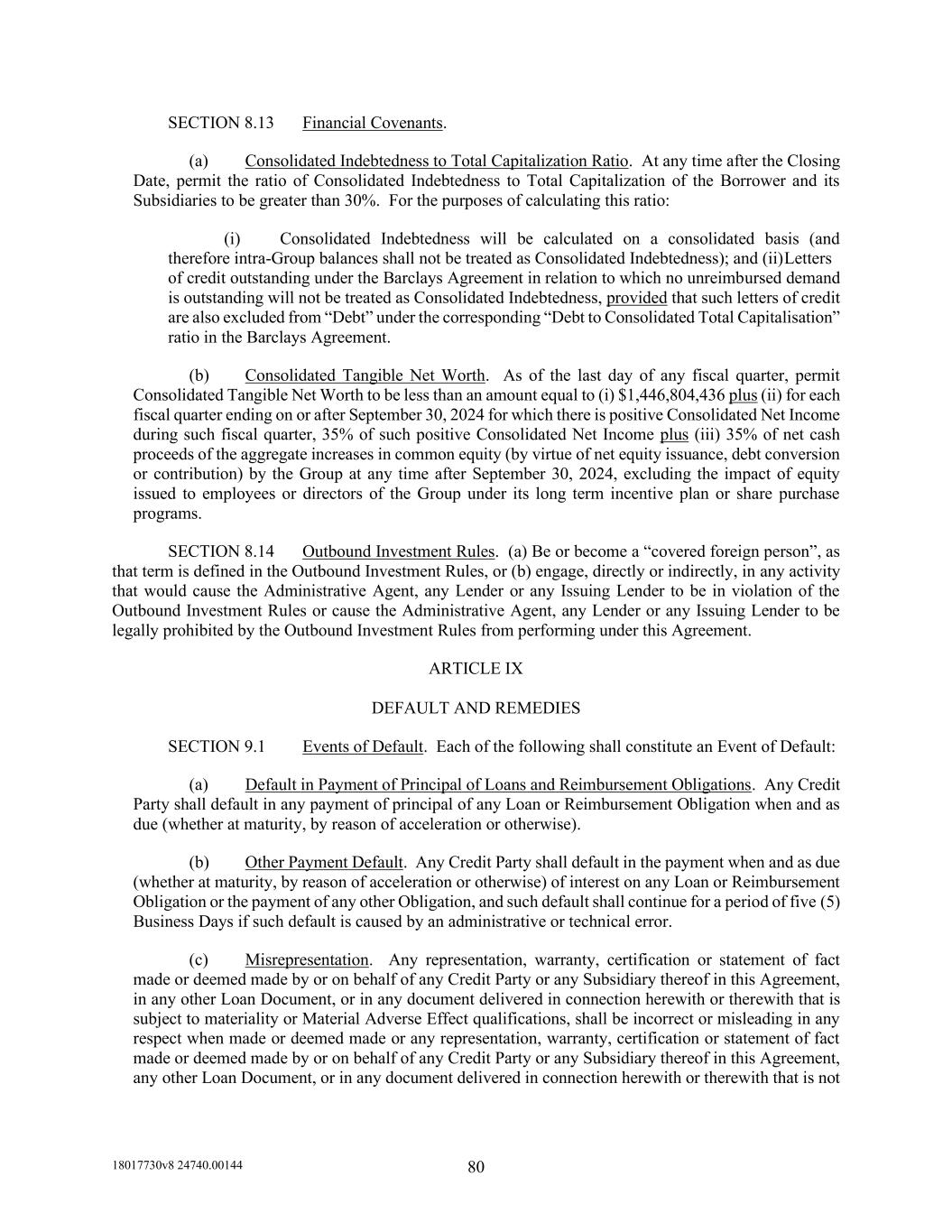 18017730v8 24740.00144 80 SECTION 8.13 Financial Covenants. (a) Consolidated Indebtedness to Total Capitalization Ratio. At any time after the Closing Date, permit the ratio of Consolidated Indebtedness to Total Capitalization of the Borrower and its Subsidiaries to be greater than 30%. For the purposes of calculating this ratio: (i) Consolidated Indebtedness will be calculated on a consolidated basis (and therefore intra-Group balances shall not be treated as Consolidated Indebtedness); and (ii) Letters of credit outstanding under the Barclays Agreement in relation to which no unreimbursed demand is outstanding will not be treated as Consolidated Indebtedness, provided that such letters of credit are also excluded from “Debt” under the corresponding “Debt to Consolidated Total Capitalisation” ratio in the Barclays Agreement. (b) Consolidated Tangible Net Worth. As of the last day of any fiscal quarter, permit Consolidated Tangible Net Worth to be less than an amount equal to (i) $1,446,804,436 plus (ii) for each fiscal quarter ending on or after September 30, 2024 for which there is positive Consolidated Net Income during such fiscal quarter, 35% of such positive Consolidated Net Income plus (iii) 35% of net cash proceeds of the aggregate increases in common equity (by virtue of net equity issuance, debt conversion or contribution) by the Group at any time after September 30, 2024, excluding the impact of equity issued to employees or directors of the Group under its long term incentive plan or share purchase programs. SECTION 8.14 Outbound Investment Rules. (a) Be or become a “covered foreign person”, as that term is defined in the Outbound Investment Rules, or (b) engage, directly or indirectly, in any activity that would cause the Administrative Agent, any Lender or any Issuing Lender to be in violation of the Outbound Investment Rules or cause the Administrative Agent, any Lender or any Issuing Lender to be legally prohibited by the Outbound Investment Rules from performing under this Agreement. ARTICLE IX DEFAULT AND REMEDIES SECTION 9.1 Events of Default. Each of the following shall constitute an Event of Default: (a) Default in Payment of Principal of Loans and Reimbursement Obligations. Any Credit Party shall default in any payment of principal of any Loan or Reimbursement Obligation when and as due (whether at maturity, by reason of acceleration or otherwise). (b) Other Payment Default. Any Credit Party shall default in the payment when and as due (whether at maturity, by reason of acceleration or otherwise) of interest on any Loan or Reimbursement Obligation or the payment of any other Obligation, and such default shall continue for a period of five (5) Business Days if such default is caused by an administrative or technical error. (c) Misrepresentation. Any representation, warranty, certification or statement of fact made or deemed made by or on behalf of any Credit Party or any Subsidiary thereof in this Agreement, in any other Loan Document, or in any document delivered in connection herewith or therewith that is subject to materiality or Material Adverse Effect qualifications, shall be incorrect or misleading in any respect when made or deemed made or any representation, warranty, certification or statement of fact made or deemed made by or on behalf of any Credit Party or any Subsidiary thereof in this Agreement, any other Loan Document, or in any document delivered in connection herewith or therewith that is not