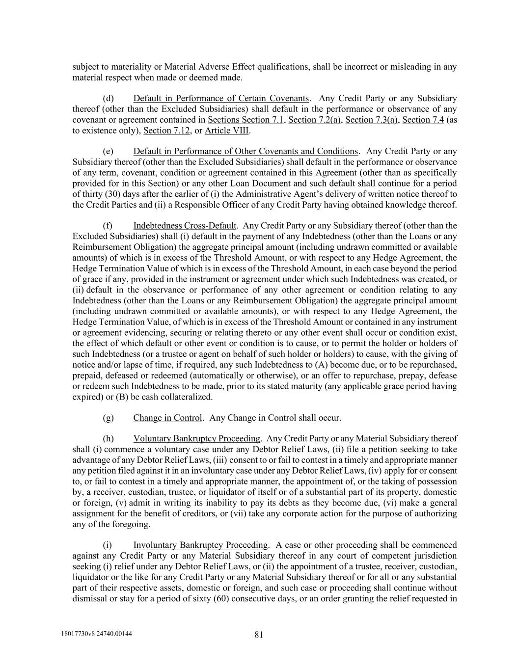 18017730v8 24740.00144 81 subject to materiality or Material Adverse Effect qualifications, shall be incorrect or misleading in any material respect when made or deemed made. (d) Default in Performance of Certain Covenants. Any Credit Party or any Subsidiary thereof (other than the Excluded Subsidiaries) shall default in the performance or observance of any covenant or agreement contained in Sections Section 7.1, Section 7.2(a), Section 7.3(a), Section 7.4 (as to existence only), Section 7.12, or Article VIII. (e) Default in Performance of Other Covenants and Conditions. Any Credit Party or any Subsidiary thereof (other than the Excluded Subsidiaries) shall default in the performance or observance of any term, covenant, condition or agreement contained in this Agreement (other than as specifically provided for in this Section) or any other Loan Document and such default shall continue for a period of thirty (30) days after the earlier of (i) the Administrative Agent’s delivery of written notice thereof to the Credit Parties and (ii) a Responsible Officer of any Credit Party having obtained knowledge thereof. (f) Indebtedness Cross-Default. Any Credit Party or any Subsidiary thereof (other than the Excluded Subsidiaries) shall (i) default in the payment of any Indebtedness (other than the Loans or any Reimbursement Obligation) the aggregate principal amount (including undrawn committed or available amounts) of which is in excess of the Threshold Amount, or with respect to any Hedge Agreement, the Hedge Termination Value of which is in excess of the Threshold Amount, in each case beyond the period of grace if any, provided in the instrument or agreement under which such Indebtedness was created, or (ii) default in the observance or performance of any other agreement or condition relating to any Indebtedness (other than the Loans or any Reimbursement Obligation) the aggregate principal amount (including undrawn committed or available amounts), or with respect to any Hedge Agreement, the Hedge Termination Value, of which is in excess of the Threshold Amount or contained in any instrument or agreement evidencing, securing or relating thereto or any other event shall occur or condition exist, the effect of which default or other event or condition is to cause, or to permit the holder or holders of such Indebtedness (or a trustee or agent on behalf of such holder or holders) to cause, with the giving of notice and/or lapse of time, if required, any such Indebtedness to (A) become due, or to be repurchased, prepaid, defeased or redeemed (automatically or otherwise), or an offer to repurchase, prepay, defease or redeem such Indebtedness to be made, prior to its stated maturity (any applicable grace period having expired) or (B) be cash collateralized. (g) Change in Control. Any Change in Control shall occur. (h) Voluntary Bankruptcy Proceeding. Any Credit Party or any Material Subsidiary thereof shall (i) commence a voluntary case under any Debtor Relief Laws, (ii) file a petition seeking to take advantage of any Debtor Relief Laws, (iii) consent to or fail to contest in a timely and appropriate manner any petition filed against it in an involuntary case under any Debtor Relief Laws, (iv) apply for or consent to, or fail to contest in a timely and appropriate manner, the appointment of, or the taking of possession by, a receiver, custodian, trustee, or liquidator of itself or of a substantial part of its property, domestic or foreign, (v) admit in writing its inability to pay its debts as they become due, (vi) make a general assignment for the benefit of creditors, or (vii) take any corporate action for the purpose of authorizing any of the foregoing. (i) Involuntary Bankruptcy Proceeding. A case or other proceeding shall be commenced against any Credit Party or any Material Subsidiary thereof in any court of competent jurisdiction seeking (i) relief under any Debtor Relief Laws, or (ii) the appointment of a trustee, receiver, custodian, liquidator or the like for any Credit Party or any Material Subsidiary thereof or for all or any substantial part of their respective assets, domestic or foreign, and such case or proceeding shall continue without dismissal or stay for a period of sixty (60) consecutive days, or an order granting the relief requested in