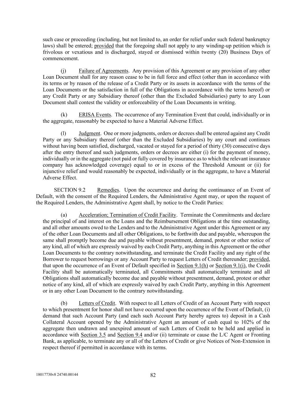 18017730v8 24740.00144 82 such case or proceeding (including, but not limited to, an order for relief under such federal bankruptcy laws) shall be entered; provided that the foregoing shall not apply to any winding-up petition which is frivolous or vexatious and is discharged, stayed or dismissed within twenty (20) Business Days of commencement. (j) Failure of Agreements. Any provision of this Agreement or any provision of any other Loan Document shall for any reason cease to be in full force and effect (other than in accordance with its terms or by reason of the release of a Credit Party or its assets in accordance with the terms of the Loan Documents or the satisfaction in full of the Obligations in accordance with the terms hereof) or any Credit Party or any Subsidiary thereof (other than the Excluded Subsidiaries) party to any Loan Document shall contest the validity or enforceability of the Loan Documents in writing. (k) ERISA Events. The occurrence of any Termination Event that could, individually or in the aggregate, reasonably be expected to have a Material Adverse Effect. (l) Judgment. One or more judgments, orders or decrees shall be entered against any Credit Party or any Subsidiary thereof (other than the Excluded Subsidiaries) by any court and continues without having been satisfied, discharged, vacated or stayed for a period of thirty (30) consecutive days after the entry thereof and such judgments, orders or decrees are either (i) for the payment of money, individually or in the aggregate (not paid or fully covered by insurance as to which the relevant insurance company has acknowledged coverage) equal to or in excess of the Threshold Amount or (ii) for injunctive relief and would reasonably be expected, individually or in the aggregate, to have a Material Adverse Effect. SECTION 9.2 Remedies. Upon the occurrence and during the continuance of an Event of Default, with the consent of the Required Lenders, the Administrative Agent may, or upon the request of the Required Lenders, the Administrative Agent shall, by notice to the Credit Parties: (a) Acceleration; Termination of Credit Facility. Terminate the Commitments and declare the principal of and interest on the Loans and the Reimbursement Obligations at the time outstanding, and all other amounts owed to the Lenders and to the Administrative Agent under this Agreement or any of the other Loan Documents and all other Obligations, to be forthwith due and payable, whereupon the same shall promptly become due and payable without presentment, demand, protest or other notice of any kind, all of which are expressly waived by each Credit Party, anything in this Agreement or the other Loan Documents to the contrary notwithstanding, and terminate the Credit Facility and any right of the Borrower to request borrowings or any Account Party to request Letters of Credit thereunder; provided, that upon the occurrence of an Event of Default specified in Section 9.1(h) or Section 9.1(i), the Credit Facility shall be automatically terminated, all Commitments shall automatically terminate and all Obligations shall automatically become due and payable without presentment, demand, protest or other notice of any kind, all of which are expressly waived by each Credit Party, anything in this Agreement or in any other Loan Document to the contrary notwithstanding. (b) Letters of Credit. With respect to all Letters of Credit of an Account Party with respect to which presentment for honor shall not have occurred upon the occurrence of the Event of Default, (i) demand that such Account Party (and each such Account Party hereby agrees to) deposit in a Cash Collateral Account opened by the Administrative Agent an amount of cash equal to 102% of the aggregate then undrawn and unexpired amount of such Letters of Credit to be held and applied in accordance with Section 3.5 and Section 9.4 and/or (ii) terminate or cause the L/C Agent or Fronting Bank, as applicable, to terminate any or all of the Letters of Credit or give Notices of Non-Extension in respect thereof if permitted in accordance with its terms.