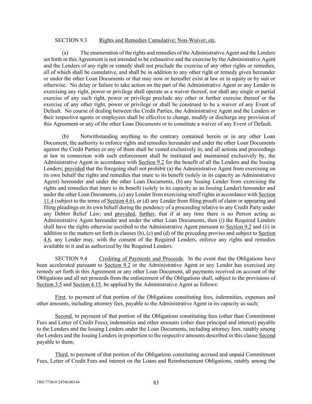 18017730v8 24740.00144 83 SECTION 9.3 Rights and Remedies Cumulative; Non-Waiver; etc. (a) The enumeration of the rights and remedies of the Administrative Agent and the Lenders set forth in this Agreement is not intended to be exhaustive and the exercise by the Administrative Agent and the Lenders of any right or remedy shall not preclude the exercise of any other rights or remedies, all of which shall be cumulative, and shall be in addition to any other right or remedy given hereunder or under the other Loan Documents or that may now or hereafter exist at law or in equity or by suit or otherwise. No delay or failure to take action on the part of the Administrative Agent or any Lender in exercising any right, power or privilege shall operate as a waiver thereof, nor shall any single or partial exercise of any such right, power or privilege preclude any other or further exercise thereof or the exercise of any other right, power or privilege or shall be construed to be a waiver of any Event of Default. No course of dealing between the Credit Parties, the Administrative Agent and the Lenders or their respective agents or employees shall be effective to change, modify or discharge any provision of this Agreement or any of the other Loan Documents or to constitute a waiver of any Event of Default. (b) Notwithstanding anything to the contrary contained herein or in any other Loan Document, the authority to enforce rights and remedies hereunder and under the other Loan Documents against the Credit Parties or any of them shall be vested exclusively in, and all actions and proceedings at law in connection with such enforcement shall be instituted and maintained exclusively by, the Administrative Agent in accordance with Section 9.2 for the benefit of all the Lenders and the Issuing Lenders; provided that the foregoing shall not prohibit (a) the Administrative Agent from exercising on its own behalf the rights and remedies that inure to its benefit (solely in its capacity as Administrative Agent) hereunder and under the other Loan Documents, (b) any Issuing Lender from exercising the rights and remedies that inure to its benefit (solely in its capacity as an Issuing Lender) hereunder and under the other Loan Documents, (c) any Lender from exercising setoff rights in accordance with Section 11.4 (subject to the terms of Section 4.6), or (d) any Lender from filing proofs of claim or appearing and filing pleadings on its own behalf during the pendency of a proceeding relative to any Credit Party under any Debtor Relief Law; and provided, further, that if at any time there is no Person acting as Administrative Agent hereunder and under the other Loan Documents, then (i) the Required Lenders shall have the rights otherwise ascribed to the Administrative Agent pursuant to Section 9.2 and (ii) in addition to the matters set forth in clauses (b), (c) and (d) of the preceding proviso and subject to Section 4.6, any Lender may, with the consent of the Required Lenders, enforce any rights and remedies available to it and as authorized by the Required Lenders. SECTION 9.4 Crediting of Payments and Proceeds. In the event that the Obligations have been accelerated pursuant to Section 9.2 or the Administrative Agent or any Lender has exercised any remedy set forth in this Agreement or any other Loan Document, all payments received on account of the Obligations and all net proceeds from the enforcement of the Obligations shall, subject to the provisions of Section 3.5 and Section 4.15, be applied by the Administrative Agent as follows: First, to payment of that portion of the Obligations constituting fees, indemnities, expenses and other amounts, including attorney fees, payable to the Administrative Agent in its capacity as such; Second, to payment of that portion of the Obligations constituting fees (other than Commitment Fees and Letter of Credit Fees), indemnities and other amounts (other than principal and interest) payable to the Lenders and the Issuing Lenders under the Loan Documents, including attorney fees, ratably among the Lenders and the Issuing Lenders in proportion to the respective amounts described in this clause Second payable to them; Third, to payment of that portion of the Obligations constituting accrued and unpaid Commitment Fees, Letter of Credit Fees and interest on the Loans and Reimbursement Obligations, ratably among the