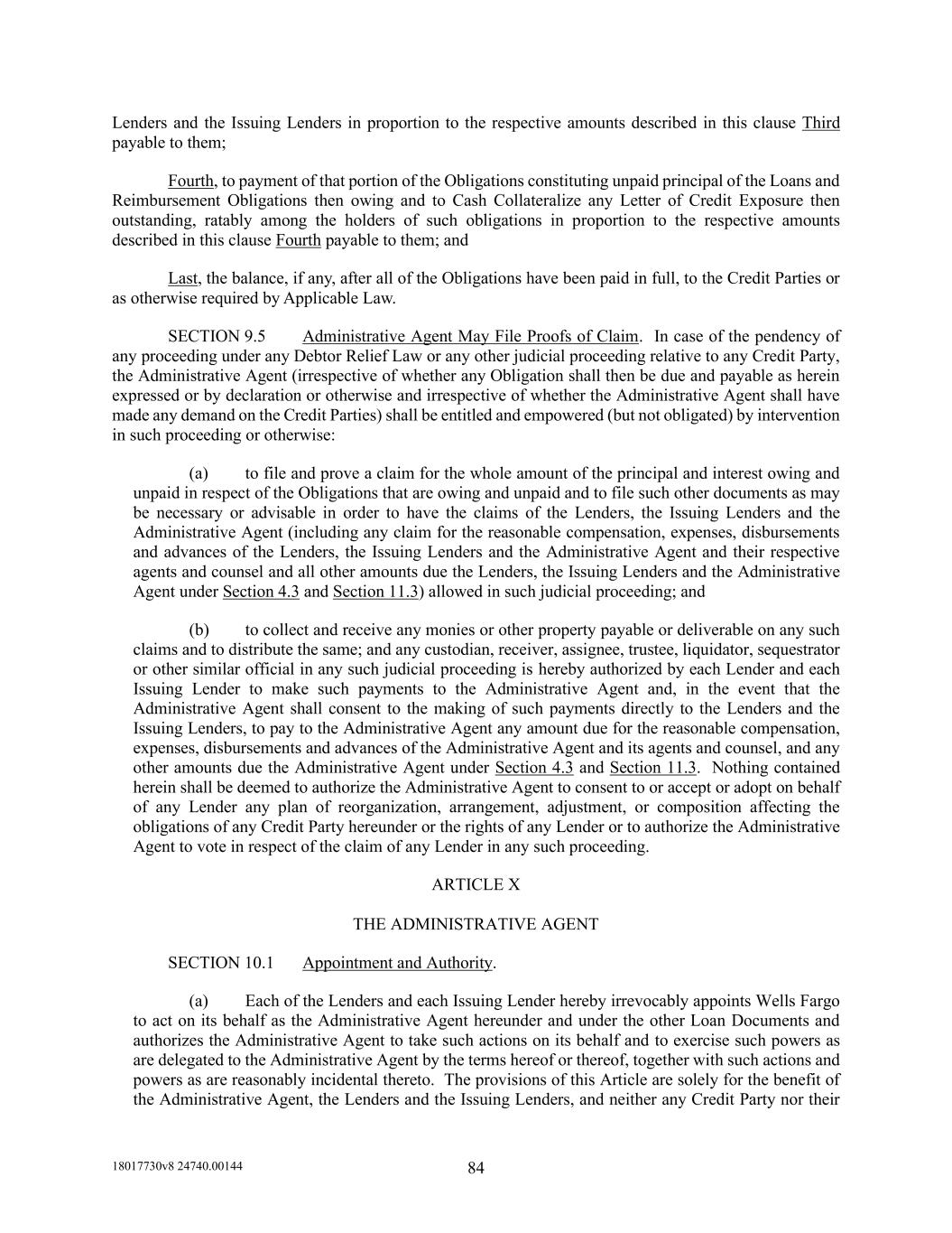 18017730v8 24740.00144 84 Lenders and the Issuing Lenders in proportion to the respective amounts described in this clause Third payable to them; Fourth, to payment of that portion of the Obligations constituting unpaid principal of the Loans and Reimbursement Obligations then owing and to Cash Collateralize any Letter of Credit Exposure then outstanding, ratably among the holders of such obligations in proportion to the respective amounts described in this clause Fourth payable to them; and Last, the balance, if any, after all of the Obligations have been paid in full, to the Credit Parties or as otherwise required by Applicable Law. SECTION 9.5 Administrative Agent May File Proofs of Claim. In case of the pendency of any proceeding under any Debtor Relief Law or any other judicial proceeding relative to any Credit Party, the Administrative Agent (irrespective of whether any Obligation shall then be due and payable as herein expressed or by declaration or otherwise and irrespective of whether the Administrative Agent shall have made any demand on the Credit Parties) shall be entitled and empowered (but not obligated) by intervention in such proceeding or otherwise: (a) to file and prove a claim for the whole amount of the principal and interest owing and unpaid in respect of the Obligations that are owing and unpaid and to file such other documents as may be necessary or advisable in order to have the claims of the Lenders, the Issuing Lenders and the Administrative Agent (including any claim for the reasonable compensation, expenses, disbursements and advances of the Lenders, the Issuing Lenders and the Administrative Agent and their respective agents and counsel and all other amounts due the Lenders, the Issuing Lenders and the Administrative Agent under Section 4.3 and Section 11.3) allowed in such judicial proceeding; and (b) to collect and receive any monies or other property payable or deliverable on any such claims and to distribute the same; and any custodian, receiver, assignee, trustee, liquidator, sequestrator or other similar official in any such judicial proceeding is hereby authorized by each Lender and each Issuing Lender to make such payments to the Administrative Agent and, in the event that the Administrative Agent shall consent to the making of such payments directly to the Lenders and the Issuing Lenders, to pay to the Administrative Agent any amount due for the reasonable compensation, expenses, disbursements and advances of the Administrative Agent and its agents and counsel, and any other amounts due the Administrative Agent under Section 4.3 and Section 11.3. Nothing contained herein shall be deemed to authorize the Administrative Agent to consent to or accept or adopt on behalf of any Lender any plan of reorganization, arrangement, adjustment, or composition affecting the obligations of any Credit Party hereunder or the rights of any Lender or to authorize the Administrative Agent to vote in respect of the claim of any Lender in any such proceeding. ARTICLE X THE ADMINISTRATIVE AGENT SECTION 10.1 Appointment and Authority. (a) Each of the Lenders and each Issuing Lender hereby irrevocably appoints Wells Fargo to act on its behalf as the Administrative Agent hereunder and under the other Loan Documents and authorizes the Administrative Agent to take such actions on its behalf and to exercise such powers as are delegated to the Administrative Agent by the terms hereof or thereof, together with such actions and powers as are reasonably incidental thereto. The provisions of this Article are solely for the benefit of the Administrative Agent, the Lenders and the Issuing Lenders, and neither any Credit Party nor their