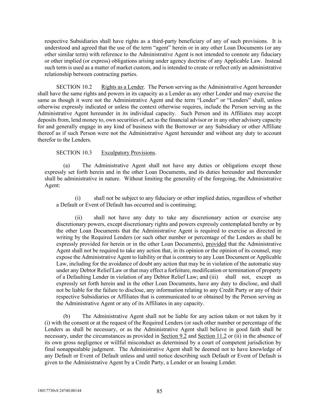 18017730v8 24740.00144 85 respective Subsidiaries shall have rights as a third-party beneficiary of any of such provisions. It is understood and agreed that the use of the term “agent” herein or in any other Loan Documents (or any other similar term) with reference to the Administrative Agent is not intended to connote any fiduciary or other implied (or express) obligations arising under agency doctrine of any Applicable Law. Instead such term is used as a matter of market custom, and is intended to create or reflect only an administrative relationship between contracting parties. SECTION 10.2 Rights as a Lender. The Person serving as the Administrative Agent hereunder shall have the same rights and powers in its capacity as a Lender as any other Lender and may exercise the same as though it were not the Administrative Agent and the term “Lender” or “Lenders” shall, unless otherwise expressly indicated or unless the context otherwise requires, include the Person serving as the Administrative Agent hereunder in its individual capacity. Such Person and its Affiliates may accept deposits from, lend money to, own securities of, act as the financial advisor or in any other advisory capacity for and generally engage in any kind of business with the Borrower or any Subsidiary or other Affiliate thereof as if such Person were not the Administrative Agent hereunder and without any duty to account therefor to the Lenders. SECTION 10.3 Exculpatory Provisions. (a) The Administrative Agent shall not have any duties or obligations except those expressly set forth herein and in the other Loan Documents, and its duties hereunder and thereunder shall be administrative in nature. Without limiting the generality of the foregoing, the Administrative Agent: (i) shall not be subject to any fiduciary or other implied duties, regardless of whether a Default or Event of Default has occurred and is continuing; (ii) shall not have any duty to take any discretionary action or exercise any discretionary powers, except discretionary rights and powers expressly contemplated hereby or by the other Loan Documents that the Administrative Agent is required to exercise as directed in writing by the Required Lenders (or such other number or percentage of the Lenders as shall be expressly provided for herein or in the other Loan Documents), provided that the Administrative Agent shall not be required to take any action that, in its opinion or the opinion of its counsel, may expose the Administrative Agent to liability or that is contrary to any Loan Document or Applicable Law, including for the avoidance of doubt any action that may be in violation of the automatic stay under any Debtor Relief Law or that may effect a forfeiture, modification or termination of property of a Defaulting Lender in violation of any Debtor Relief Law; and (iii) shall not, except as expressly set forth herein and in the other Loan Documents, have any duty to disclose, and shall not be liable for the failure to disclose, any information relating to any Credit Party or any of their respective Subsidiaries or Affiliates that is communicated to or obtained by the Person serving as the Administrative Agent or any of its Affiliates in any capacity. (b) The Administrative Agent shall not be liable for any action taken or not taken by it (i) with the consent or at the request of the Required Lenders (or such other number or percentage of the Lenders as shall be necessary, or as the Administrative Agent shall believe in good faith shall be necessary, under the circumstances as provided in Section 9.2 and Section 11.2 or (ii) in the absence of its own gross negligence or willful misconduct as determined by a court of competent jurisdiction by final nonappealable judgment. The Administrative Agent shall be deemed not to have knowledge of any Default or Event of Default unless and until notice describing such Default or Event of Default is given to the Administrative Agent by a Credit Party, a Lender or an Issuing Lender.
