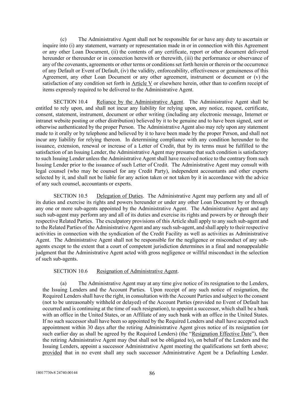 18017730v8 24740.00144 86 (c) The Administrative Agent shall not be responsible for or have any duty to ascertain or inquire into (i) any statement, warranty or representation made in or in connection with this Agreement or any other Loan Document, (ii) the contents of any certificate, report or other document delivered hereunder or thereunder or in connection herewith or therewith, (iii) the performance or observance of any of the covenants, agreements or other terms or conditions set forth herein or therein or the occurrence of any Default or Event of Default, (iv) the validity, enforceability, effectiveness or genuineness of this Agreement, any other Loan Document or any other agreement, instrument or document or (v) the satisfaction of any condition set forth in Article V or elsewhere herein, other than to confirm receipt of items expressly required to be delivered to the Administrative Agent. SECTION 10.4 Reliance by the Administrative Agent. The Administrative Agent shall be entitled to rely upon, and shall not incur any liability for relying upon, any notice, request, certificate, consent, statement, instrument, document or other writing (including any electronic message, Internet or intranet website posting or other distribution) believed by it to be genuine and to have been signed, sent or otherwise authenticated by the proper Person. The Administrative Agent also may rely upon any statement made to it orally or by telephone and believed by it to have been made by the proper Person, and shall not incur any liability for relying thereon. In determining compliance with any condition hereunder to the issuance, extension, renewal or increase of a Letter of Credit, that by its terms must be fulfilled to the satisfaction of an Issuing Lender, the Administrative Agent may presume that such condition is satisfactory to such Issuing Lender unless the Administrative Agent shall have received notice to the contrary from such Issuing Lender prior to the issuance of such Letter of Credit. The Administrative Agent may consult with legal counsel (who may be counsel for any Credit Party), independent accountants and other experts selected by it, and shall not be liable for any action taken or not taken by it in accordance with the advice of any such counsel, accountants or experts. SECTION 10.5 Delegation of Duties. The Administrative Agent may perform any and all of its duties and exercise its rights and powers hereunder or under any other Loan Document by or through any one or more sub-agents appointed by the Administrative Agent. The Administrative Agent and any such sub-agent may perform any and all of its duties and exercise its rights and powers by or through their respective Related Parties. The exculpatory provisions of this Article shall apply to any such sub-agent and to the Related Parties of the Administrative Agent and any such sub-agent, and shall apply to their respective activities in connection with the syndication of the Credit Facility as well as activities as Administrative Agent. The Administrative Agent shall not be responsible for the negligence or misconduct of any sub- agents except to the extent that a court of competent jurisdiction determines in a final and nonappealable judgment that the Administrative Agent acted with gross negligence or willful misconduct in the selection of such sub-agents. SECTION 10.6 Resignation of Administrative Agent. (a) The Administrative Agent may at any time give notice of its resignation to the Lenders, the Issuing Lenders and the Account Parties. Upon receipt of any such notice of resignation, the Required Lenders shall have the right, in consultation with the Account Parties and subject to the consent (not to be unreasonably withheld or delayed) of the Account Parties (provided no Event of Default has occurred and is continuing at the time of such resignation), to appoint a successor, which shall be a bank with an office in the United States, or an Affiliate of any such bank with an office in the United States. If no such successor shall have been so appointed by the Required Lenders and shall have accepted such appointment within 30 days after the retiring Administrative Agent gives notice of its resignation (or such earlier day as shall be agreed by the Required Lenders) (the “Resignation Effective Date”), then the retiring Administrative Agent may (but shall not be obligated to), on behalf of the Lenders and the Issuing Lenders, appoint a successor Administrative Agent meeting the qualifications set forth above; provided that in no event shall any such successor Administrative Agent be a Defaulting Lender.