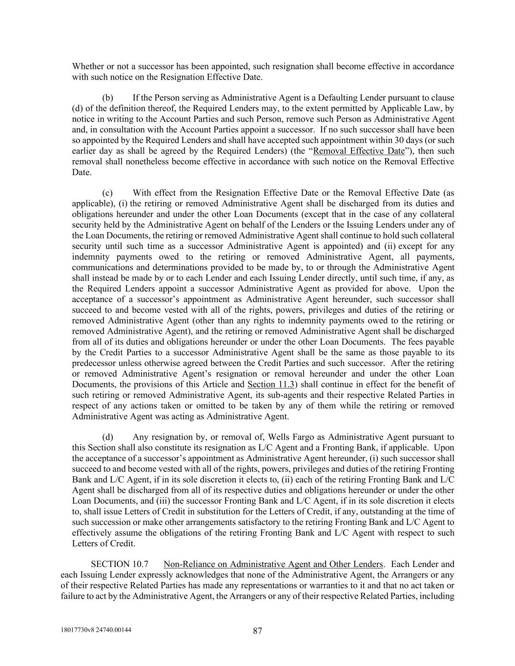 18017730v8 24740.00144 87 Whether or not a successor has been appointed, such resignation shall become effective in accordance with such notice on the Resignation Effective Date. (b) If the Person serving as Administrative Agent is a Defaulting Lender pursuant to clause (d) of the definition thereof, the Required Lenders may, to the extent permitted by Applicable Law, by notice in writing to the Account Parties and such Person, remove such Person as Administrative Agent and, in consultation with the Account Parties appoint a successor. If no such successor shall have been so appointed by the Required Lenders and shall have accepted such appointment within 30 days (or such earlier day as shall be agreed by the Required Lenders) (the “Removal Effective Date”), then such removal shall nonetheless become effective in accordance with such notice on the Removal Effective Date. (c) With effect from the Resignation Effective Date or the Removal Effective Date (as applicable), (i) the retiring or removed Administrative Agent shall be discharged from its duties and obligations hereunder and under the other Loan Documents (except that in the case of any collateral security held by the Administrative Agent on behalf of the Lenders or the Issuing Lenders under any of the Loan Documents, the retiring or removed Administrative Agent shall continue to hold such collateral security until such time as a successor Administrative Agent is appointed) and (ii) except for any indemnity payments owed to the retiring or removed Administrative Agent, all payments, communications and determinations provided to be made by, to or through the Administrative Agent shall instead be made by or to each Lender and each Issuing Lender directly, until such time, if any, as the Required Lenders appoint a successor Administrative Agent as provided for above. Upon the acceptance of a successor’s appointment as Administrative Agent hereunder, such successor shall succeed to and become vested with all of the rights, powers, privileges and duties of the retiring or removed Administrative Agent (other than any rights to indemnity payments owed to the retiring or removed Administrative Agent), and the retiring or removed Administrative Agent shall be discharged from all of its duties and obligations hereunder or under the other Loan Documents. The fees payable by the Credit Parties to a successor Administrative Agent shall be the same as those payable to its predecessor unless otherwise agreed between the Credit Parties and such successor. After the retiring or removed Administrative Agent’s resignation or removal hereunder and under the other Loan Documents, the provisions of this Article and Section 11.3) shall continue in effect for the benefit of such retiring or removed Administrative Agent, its sub-agents and their respective Related Parties in respect of any actions taken or omitted to be taken by any of them while the retiring or removed Administrative Agent was acting as Administrative Agent. (d) Any resignation by, or removal of, Wells Fargo as Administrative Agent pursuant to this Section shall also constitute its resignation as L/C Agent and a Fronting Bank, if applicable. Upon the acceptance of a successor’s appointment as Administrative Agent hereunder, (i) such successor shall succeed to and become vested with all of the rights, powers, privileges and duties of the retiring Fronting Bank and L/C Agent, if in its sole discretion it elects to, (ii) each of the retiring Fronting Bank and L/C Agent shall be discharged from all of its respective duties and obligations hereunder or under the other Loan Documents, and (iii) the successor Fronting Bank and L/C Agent, if in its sole discretion it elects to, shall issue Letters of Credit in substitution for the Letters of Credit, if any, outstanding at the time of such succession or make other arrangements satisfactory to the retiring Fronting Bank and L/C Agent to effectively assume the obligations of the retiring Fronting Bank and L/C Agent with respect to such Letters of Credit. SECTION 10.7 Non-Reliance on Administrative Agent and Other Lenders. Each Lender and each Issuing Lender expressly acknowledges that none of the Administrative Agent, the Arrangers or any of their respective Related Parties has made any representations or warranties to it and that no act taken or failure to act by the Administrative Agent, the Arrangers or any of their respective Related Parties, including