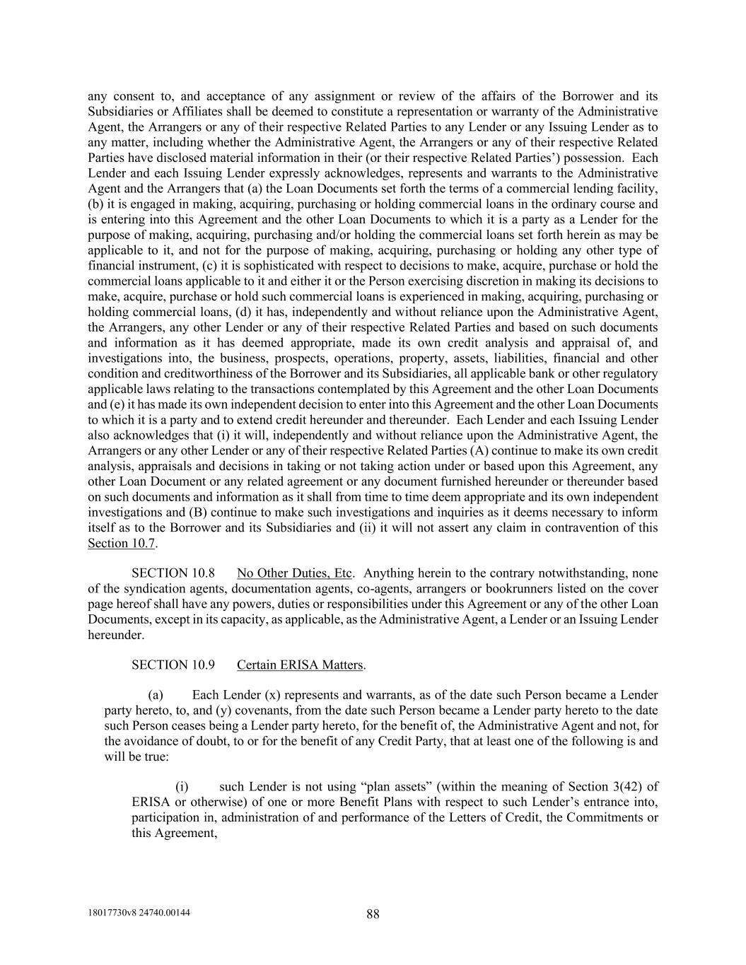 18017730v8 24740.00144 88 any consent to, and acceptance of any assignment or review of the affairs of the Borrower and its Subsidiaries or Affiliates shall be deemed to constitute a representation or warranty of the Administrative Agent, the Arrangers or any of their respective Related Parties to any Lender or any Issuing Lender as to any matter, including whether the Administrative Agent, the Arrangers or any of their respective Related Parties have disclosed material information in their (or their respective Related Parties’) possession. Each Lender and each Issuing Lender expressly acknowledges, represents and warrants to the Administrative Agent and the Arrangers that (a) the Loan Documents set forth the terms of a commercial lending facility, (b) it is engaged in making, acquiring, purchasing or holding commercial loans in the ordinary course and is entering into this Agreement and the other Loan Documents to which it is a party as a Lender for the purpose of making, acquiring, purchasing and/or holding the commercial loans set forth herein as may be applicable to it, and not for the purpose of making, acquiring, purchasing or holding any other type of financial instrument, (c) it is sophisticated with respect to decisions to make, acquire, purchase or hold the commercial loans applicable to it and either it or the Person exercising discretion in making its decisions to make, acquire, purchase or hold such commercial loans is experienced in making, acquiring, purchasing or holding commercial loans, (d) it has, independently and without reliance upon the Administrative Agent, the Arrangers, any other Lender or any of their respective Related Parties and based on such documents and information as it has deemed appropriate, made its own credit analysis and appraisal of, and investigations into, the business, prospects, operations, property, assets, liabilities, financial and other condition and creditworthiness of the Borrower and its Subsidiaries, all applicable bank or other regulatory applicable laws relating to the transactions contemplated by this Agreement and the other Loan Documents and (e) it has made its own independent decision to enter into this Agreement and the other Loan Documents to which it is a party and to extend credit hereunder and thereunder. Each Lender and each Issuing Lender also acknowledges that (i) it will, independently and without reliance upon the Administrative Agent, the Arrangers or any other Lender or any of their respective Related Parties (A) continue to make its own credit analysis, appraisals and decisions in taking or not taking action under or based upon this Agreement, any other Loan Document or any related agreement or any document furnished hereunder or thereunder based on such documents and information as it shall from time to time deem appropriate and its own independent investigations and (B) continue to make such investigations and inquiries as it deems necessary to inform itself as to the Borrower and its Subsidiaries and (ii) it will not assert any claim in contravention of this Section 10.7. SECTION 10.8 No Other Duties, Etc. Anything herein to the contrary notwithstanding, none of the syndication agents, documentation agents, co-agents, arrangers or bookrunners listed on the cover page hereof shall have any powers, duties or responsibilities under this Agreement or any of the other Loan Documents, except in its capacity, as applicable, as the Administrative Agent, a Lender or an Issuing Lender hereunder. SECTION 10.9 Certain ERISA Matters. (a) Each Lender (x) represents and warrants, as of the date such Person became a Lender party hereto, to, and (y) covenants, from the date such Person became a Lender party hereto to the date such Person ceases being a Lender party hereto, for the benefit of, the Administrative Agent and not, for the avoidance of doubt, to or for the benefit of any Credit Party, that at least one of the following is and will be true: (i) such Lender is not using “plan assets” (within the meaning of Section 3(42) of ERISA or otherwise) of one or more Benefit Plans with respect to such Lender’s entrance into, participation in, administration of and performance of the Letters of Credit, the Commitments or this Agreement,