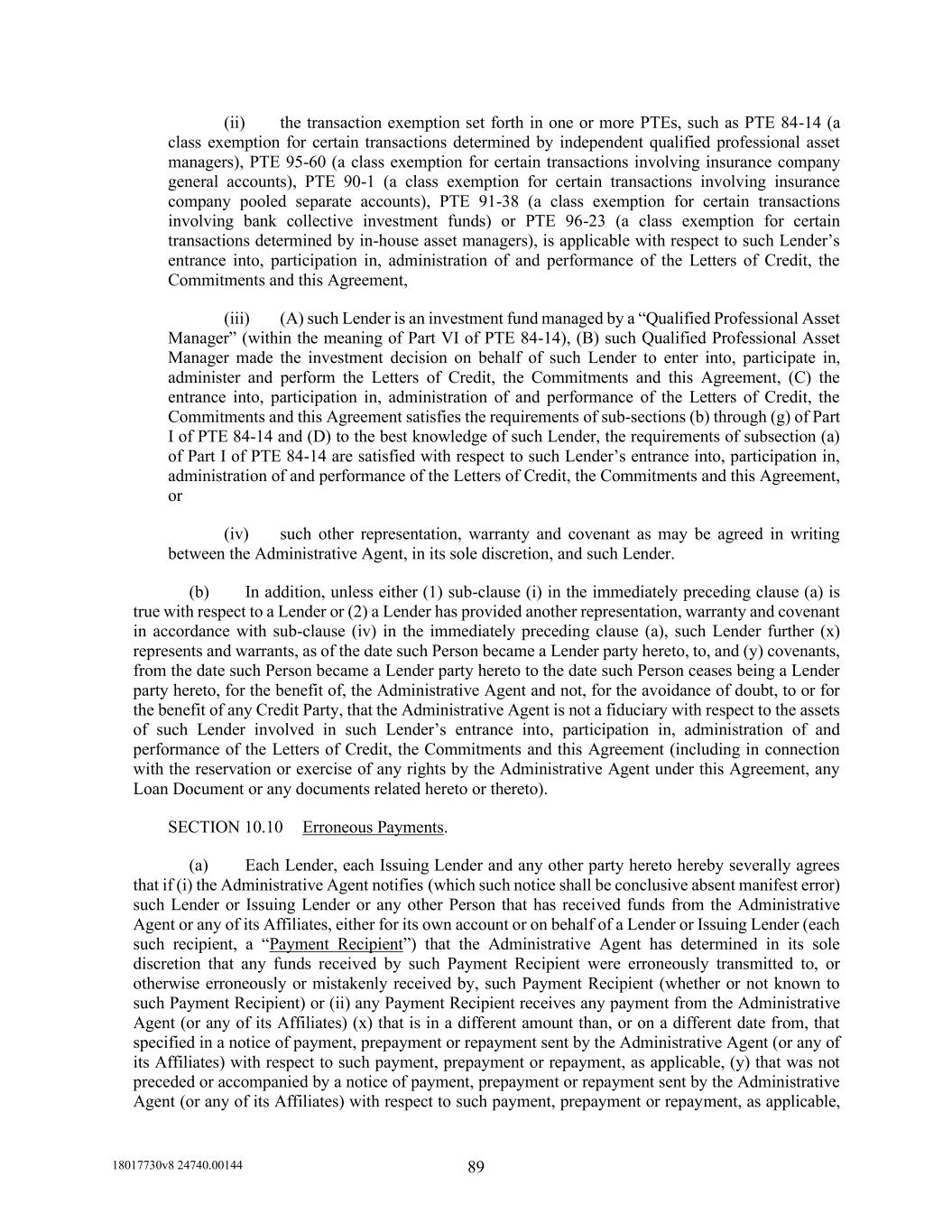 18017730v8 24740.00144 89 (ii) the transaction exemption set forth in one or more PTEs, such as PTE 84-14 (a class exemption for certain transactions determined by independent qualified professional asset managers), PTE 95-60 (a class exemption for certain transactions involving insurance company general accounts), PTE 90-1 (a class exemption for certain transactions involving insurance company pooled separate accounts), PTE 91-38 (a class exemption for certain transactions involving bank collective investment funds) or PTE 96-23 (a class exemption for certain transactions determined by in-house asset managers), is applicable with respect to such Lender’s entrance into, participation in, administration of and performance of the Letters of Credit, the Commitments and this Agreement, (iii) (A) such Lender is an investment fund managed by a “Qualified Professional Asset Manager” (within the meaning of Part VI of PTE 84-14), (B) such Qualified Professional Asset Manager made the investment decision on behalf of such Lender to enter into, participate in, administer and perform the Letters of Credit, the Commitments and this Agreement, (C) the entrance into, participation in, administration of and performance of the Letters of Credit, the Commitments and this Agreement satisfies the requirements of sub-sections (b) through (g) of Part I of PTE 84-14 and (D) to the best knowledge of such Lender, the requirements of subsection (a) of Part I of PTE 84-14 are satisfied with respect to such Lender’s entrance into, participation in, administration of and performance of the Letters of Credit, the Commitments and this Agreement, or (iv) such other representation, warranty and covenant as may be agreed in writing between the Administrative Agent, in its sole discretion, and such Lender. (b) In addition, unless either (1) sub-clause (i) in the immediately preceding clause (a) is true with respect to a Lender or (2) a Lender has provided another representation, warranty and covenant in accordance with sub-clause (iv) in the immediately preceding clause (a), such Lender further (x) represents and warrants, as of the date such Person became a Lender party hereto, to, and (y) covenants, from the date such Person became a Lender party hereto to the date such Person ceases being a Lender party hereto, for the benefit of, the Administrative Agent and not, for the avoidance of doubt, to or for the benefit of any Credit Party, that the Administrative Agent is not a fiduciary with respect to the assets of such Lender involved in such Lender’s entrance into, participation in, administration of and performance of the Letters of Credit, the Commitments and this Agreement (including in connection with the reservation or exercise of any rights by the Administrative Agent under this Agreement, any Loan Document or any documents related hereto or thereto). SECTION 10.10 Erroneous Payments. (a) Each Lender, each Issuing Lender and any other party hereto hereby severally agrees that if (i) the Administrative Agent notifies (which such notice shall be conclusive absent manifest error) such Lender or Issuing Lender or any other Person that has received funds from the Administrative Agent or any of its Affiliates, either for its own account or on behalf of a Lender or Issuing Lender (each such recipient, a “Payment Recipient”) that the Administrative Agent has determined in its sole discretion that any funds received by such Payment Recipient were erroneously transmitted to, or otherwise erroneously or mistakenly received by, such Payment Recipient (whether or not known to such Payment Recipient) or (ii) any Payment Recipient receives any payment from the Administrative Agent (or any of its Affiliates) (x) that is in a different amount than, or on a different date from, that specified in a notice of payment, prepayment or repayment sent by the Administrative Agent (or any of its Affiliates) with respect to such payment, prepayment or repayment, as applicable, (y) that was not preceded or accompanied by a notice of payment, prepayment or repayment sent by the Administrative Agent (or any of its Affiliates) with respect to such payment, prepayment or repayment, as applicable,