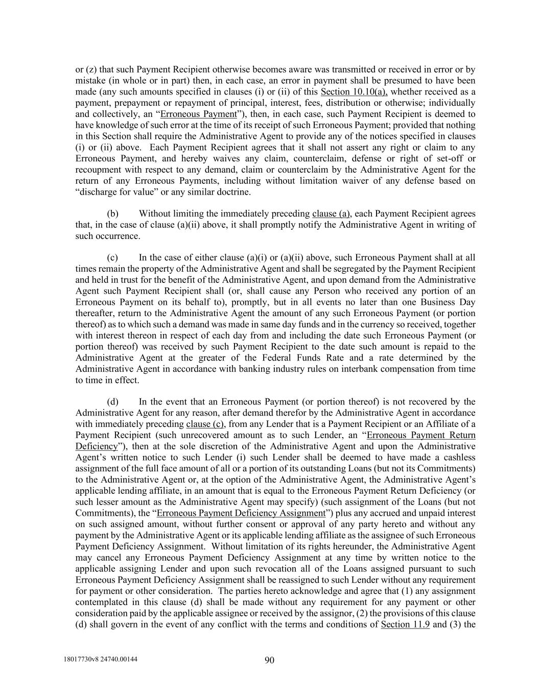 18017730v8 24740.00144 90 or (z) that such Payment Recipient otherwise becomes aware was transmitted or received in error or by mistake (in whole or in part) then, in each case, an error in payment shall be presumed to have been made (any such amounts specified in clauses (i) or (ii) of this Section 10.10(a), whether received as a payment, prepayment or repayment of principal, interest, fees, distribution or otherwise; individually and collectively, an “Erroneous Payment”), then, in each case, such Payment Recipient is deemed to have knowledge of such error at the time of its receipt of such Erroneous Payment; provided that nothing in this Section shall require the Administrative Agent to provide any of the notices specified in clauses (i) or (ii) above. Each Payment Recipient agrees that it shall not assert any right or claim to any Erroneous Payment, and hereby waives any claim, counterclaim, defense or right of set-off or recoupment with respect to any demand, claim or counterclaim by the Administrative Agent for the return of any Erroneous Payments, including without limitation waiver of any defense based on “discharge for value” or any similar doctrine. (b) Without limiting the immediately preceding clause (a), each Payment Recipient agrees that, in the case of clause (a)(ii) above, it shall promptly notify the Administrative Agent in writing of such occurrence. (c) In the case of either clause (a)(i) or (a)(ii) above, such Erroneous Payment shall at all times remain the property of the Administrative Agent and shall be segregated by the Payment Recipient and held in trust for the benefit of the Administrative Agent, and upon demand from the Administrative Agent such Payment Recipient shall (or, shall cause any Person who received any portion of an Erroneous Payment on its behalf to), promptly, but in all events no later than one Business Day thereafter, return to the Administrative Agent the amount of any such Erroneous Payment (or portion thereof) as to which such a demand was made in same day funds and in the currency so received, together with interest thereon in respect of each day from and including the date such Erroneous Payment (or portion thereof) was received by such Payment Recipient to the date such amount is repaid to the Administrative Agent at the greater of the Federal Funds Rate and a rate determined by the Administrative Agent in accordance with banking industry rules on interbank compensation from time to time in effect. (d) In the event that an Erroneous Payment (or portion thereof) is not recovered by the Administrative Agent for any reason, after demand therefor by the Administrative Agent in accordance with immediately preceding clause (c), from any Lender that is a Payment Recipient or an Affiliate of a Payment Recipient (such unrecovered amount as to such Lender, an “Erroneous Payment Return Deficiency”), then at the sole discretion of the Administrative Agent and upon the Administrative Agent’s written notice to such Lender (i) such Lender shall be deemed to have made a cashless assignment of the full face amount of all or a portion of its outstanding Loans (but not its Commitments) to the Administrative Agent or, at the option of the Administrative Agent, the Administrative Agent’s applicable lending affiliate, in an amount that is equal to the Erroneous Payment Return Deficiency (or such lesser amount as the Administrative Agent may specify) (such assignment of the Loans (but not Commitments), the “Erroneous Payment Deficiency Assignment”) plus any accrued and unpaid interest on such assigned amount, without further consent or approval of any party hereto and without any payment by the Administrative Agent or its applicable lending affiliate as the assignee of such Erroneous Payment Deficiency Assignment. Without limitation of its rights hereunder, the Administrative Agent may cancel any Erroneous Payment Deficiency Assignment at any time by written notice to the applicable assigning Lender and upon such revocation all of the Loans assigned pursuant to such Erroneous Payment Deficiency Assignment shall be reassigned to such Lender without any requirement for payment or other consideration. The parties hereto acknowledge and agree that (1) any assignment contemplated in this clause (d) shall be made without any requirement for any payment or other consideration paid by the applicable assignee or received by the assignor, (2) the provisions of this clause (d) shall govern in the event of any conflict with the terms and conditions of Section 11.9 and (3) the