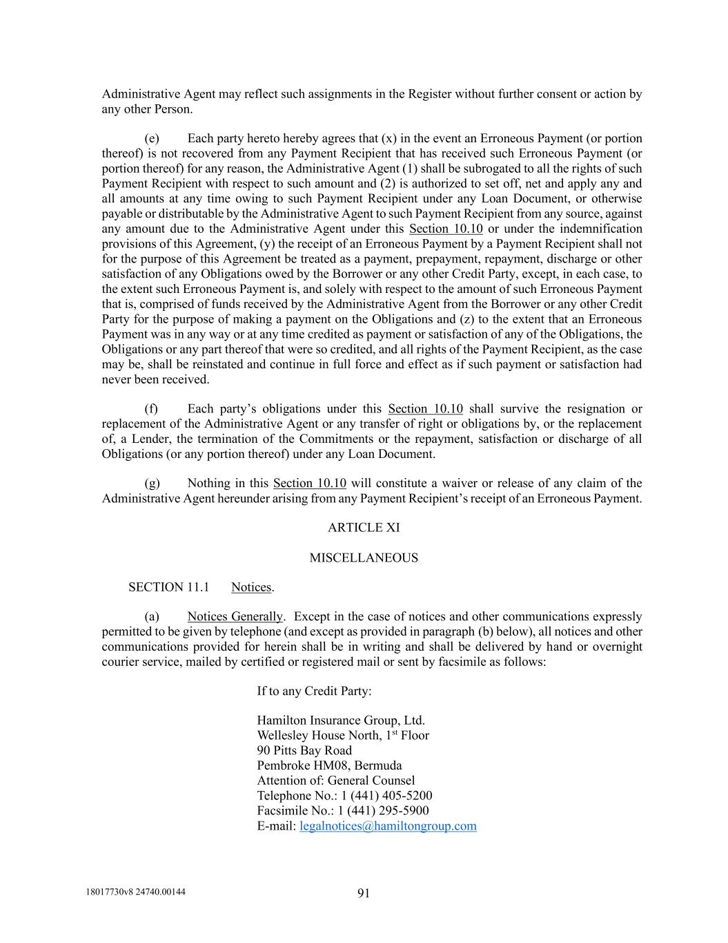 18017730v8 24740.00144 91 Administrative Agent may reflect such assignments in the Register without further consent or action by any other Person. (e) Each party hereto hereby agrees that (x) in the event an Erroneous Payment (or portion thereof) is not recovered from any Payment Recipient that has received such Erroneous Payment (or portion thereof) for any reason, the Administrative Agent (1) shall be subrogated to all the rights of such Payment Recipient with respect to such amount and (2) is authorized to set off, net and apply any and all amounts at any time owing to such Payment Recipient under any Loan Document, or otherwise payable or distributable by the Administrative Agent to such Payment Recipient from any source, against any amount due to the Administrative Agent under this Section 10.10 or under the indemnification provisions of this Agreement, (y) the receipt of an Erroneous Payment by a Payment Recipient shall not for the purpose of this Agreement be treated as a payment, prepayment, repayment, discharge or other satisfaction of any Obligations owed by the Borrower or any other Credit Party, except, in each case, to the extent such Erroneous Payment is, and solely with respect to the amount of such Erroneous Payment that is, comprised of funds received by the Administrative Agent from the Borrower or any other Credit Party for the purpose of making a payment on the Obligations and (z) to the extent that an Erroneous Payment was in any way or at any time credited as payment or satisfaction of any of the Obligations, the Obligations or any part thereof that were so credited, and all rights of the Payment Recipient, as the case may be, shall be reinstated and continue in full force and effect as if such payment or satisfaction had never been received. (f) Each party’s obligations under this Section 10.10 shall survive the resignation or replacement of the Administrative Agent or any transfer of right or obligations by, or the replacement of, a Lender, the termination of the Commitments or the repayment, satisfaction or discharge of all Obligations (or any portion thereof) under any Loan Document. (g) Nothing in this Section 10.10 will constitute a waiver or release of any claim of the Administrative Agent hereunder arising from any Payment Recipient’s receipt of an Erroneous Payment. ARTICLE XI MISCELLANEOUS SECTION 11.1 Notices. (a) Notices Generally. Except in the case of notices and other communications expressly permitted to be given by telephone (and except as provided in paragraph (b) below), all notices and other communications provided for herein shall be in writing and shall be delivered by hand or overnight courier service, mailed by certified or registered mail or sent by facsimile as follows: If to any Credit Party: Hamilton Insurance Group, Ltd. Wellesley House North, 1st Floor 90 Pitts Bay Road Pembroke HM08, Bermuda Attention of: General Counsel Telephone No.: 1 (441) 405-5200 Facsimile No.: 1 (441) 295-5900 E-mail: legalnotices@hamiltongroup.com
