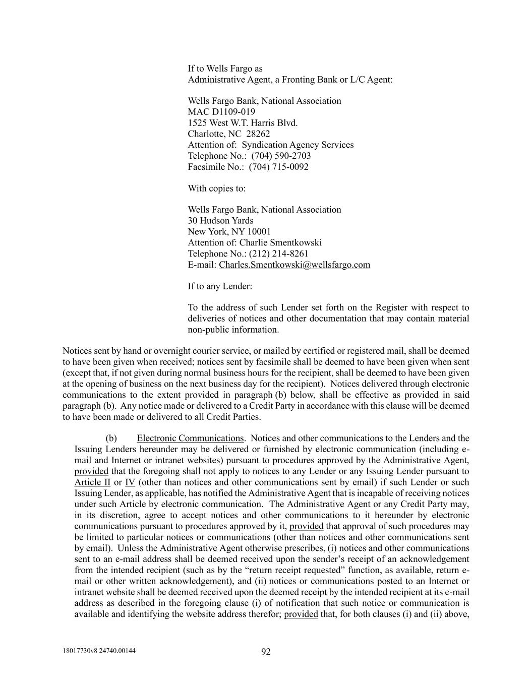 18017730v8 24740.00144 92 If to Wells Fargo as Administrative Agent, a Fronting Bank or L/C Agent: Wells Fargo Bank, National Association MAC D1109-019 1525 West W.T. Harris Blvd. Charlotte, NC 28262 Attention of: Syndication Agency Services Telephone No.: (704) 590-2703 Facsimile No.: (704) 715-0092 With copies to: Wells Fargo Bank, National Association 30 Hudson Yards New York, NY 10001 Attention of: Charlie Smentkowski Telephone No.: (212) 214-8261 E-mail: Charles.Smentkowski@wellsfargo.com If to any Lender: To the address of such Lender set forth on the Register with respect to deliveries of notices and other documentation that may contain material non-public information. Notices sent by hand or overnight courier service, or mailed by certified or registered mail, shall be deemed to have been given when received; notices sent by facsimile shall be deemed to have been given when sent (except that, if not given during normal business hours for the recipient, shall be deemed to have been given at the opening of business on the next business day for the recipient). Notices delivered through electronic communications to the extent provided in paragraph (b) below, shall be effective as provided in said paragraph (b). Any notice made or delivered to a Credit Party in accordance with this clause will be deemed to have been made or delivered to all Credit Parties. (b) Electronic Communications. Notices and other communications to the Lenders and the Issuing Lenders hereunder may be delivered or furnished by electronic communication (including e- mail and Internet or intranet websites) pursuant to procedures approved by the Administrative Agent, provided that the foregoing shall not apply to notices to any Lender or any Issuing Lender pursuant to Article II or IV (other than notices and other communications sent by email) if such Lender or such Issuing Lender, as applicable, has notified the Administrative Agent that is incapable of receiving notices under such Article by electronic communication. The Administrative Agent or any Credit Party may, in its discretion, agree to accept notices and other communications to it hereunder by electronic communications pursuant to procedures approved by it, provided that approval of such procedures may be limited to particular notices or communications (other than notices and other communications sent by email). Unless the Administrative Agent otherwise prescribes, (i) notices and other communications sent to an e-mail address shall be deemed received upon the sender’s receipt of an acknowledgement from the intended recipient (such as by the “return receipt requested” function, as available, return e- mail or other written acknowledgement), and (ii) notices or communications posted to an Internet or intranet website shall be deemed received upon the deemed receipt by the intended recipient at its e-mail address as described in the foregoing clause (i) of notification that such notice or communication is available and identifying the website address therefor; provided that, for both clauses (i) and (ii) above,