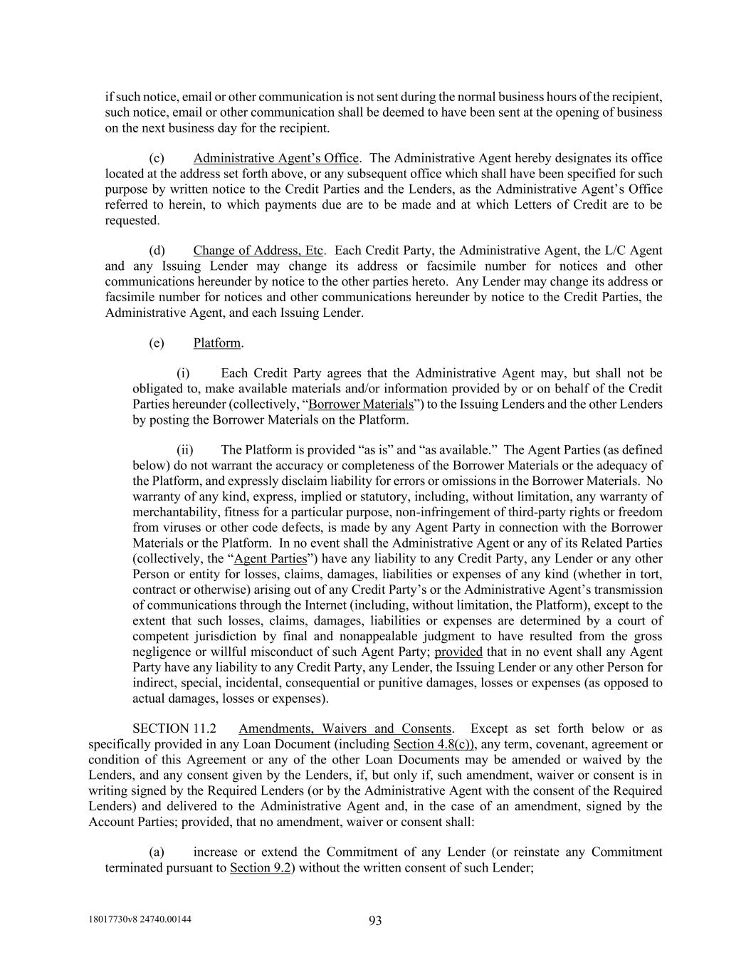 18017730v8 24740.00144 93 if such notice, email or other communication is not sent during the normal business hours of the recipient, such notice, email or other communication shall be deemed to have been sent at the opening of business on the next business day for the recipient. (c) Administrative Agent’s Office. The Administrative Agent hereby designates its office located at the address set forth above, or any subsequent office which shall have been specified for such purpose by written notice to the Credit Parties and the Lenders, as the Administrative Agent’s Office referred to herein, to which payments due are to be made and at which Letters of Credit are to be requested. (d) Change of Address, Etc. Each Credit Party, the Administrative Agent, the L/C Agent and any Issuing Lender may change its address or facsimile number for notices and other communications hereunder by notice to the other parties hereto. Any Lender may change its address or facsimile number for notices and other communications hereunder by notice to the Credit Parties, the Administrative Agent, and each Issuing Lender. (e) Platform. (i) Each Credit Party agrees that the Administrative Agent may, but shall not be obligated to, make available materials and/or information provided by or on behalf of the Credit Parties hereunder (collectively, “Borrower Materials”) to the Issuing Lenders and the other Lenders by posting the Borrower Materials on the Platform. (ii) The Platform is provided “as is” and “as available.” The Agent Parties (as defined below) do not warrant the accuracy or completeness of the Borrower Materials or the adequacy of the Platform, and expressly disclaim liability for errors or omissions in the Borrower Materials. No warranty of any kind, express, implied or statutory, including, without limitation, any warranty of merchantability, fitness for a particular purpose, non-infringement of third-party rights or freedom from viruses or other code defects, is made by any Agent Party in connection with the Borrower Materials or the Platform. In no event shall the Administrative Agent or any of its Related Parties (collectively, the “Agent Parties”) have any liability to any Credit Party, any Lender or any other Person or entity for losses, claims, damages, liabilities or expenses of any kind (whether in tort, contract or otherwise) arising out of any Credit Party’s or the Administrative Agent’s transmission of communications through the Internet (including, without limitation, the Platform), except to the extent that such losses, claims, damages, liabilities or expenses are determined by a court of competent jurisdiction by final and nonappealable judgment to have resulted from the gross negligence or willful misconduct of such Agent Party; provided that in no event shall any Agent Party have any liability to any Credit Party, any Lender, the Issuing Lender or any other Person for indirect, special, incidental, consequential or punitive damages, losses or expenses (as opposed to actual damages, losses or expenses). SECTION 11.2 Amendments, Waivers and Consents. Except as set forth below or as specifically provided in any Loan Document (including Section 4.8(c)), any term, covenant, agreement or condition of this Agreement or any of the other Loan Documents may be amended or waived by the Lenders, and any consent given by the Lenders, if, but only if, such amendment, waiver or consent is in writing signed by the Required Lenders (or by the Administrative Agent with the consent of the Required Lenders) and delivered to the Administrative Agent and, in the case of an amendment, signed by the Account Parties; provided, that no amendment, waiver or consent shall: (a) increase or extend the Commitment of any Lender (or reinstate any Commitment terminated pursuant to Section 9.2) without the written consent of such Lender;