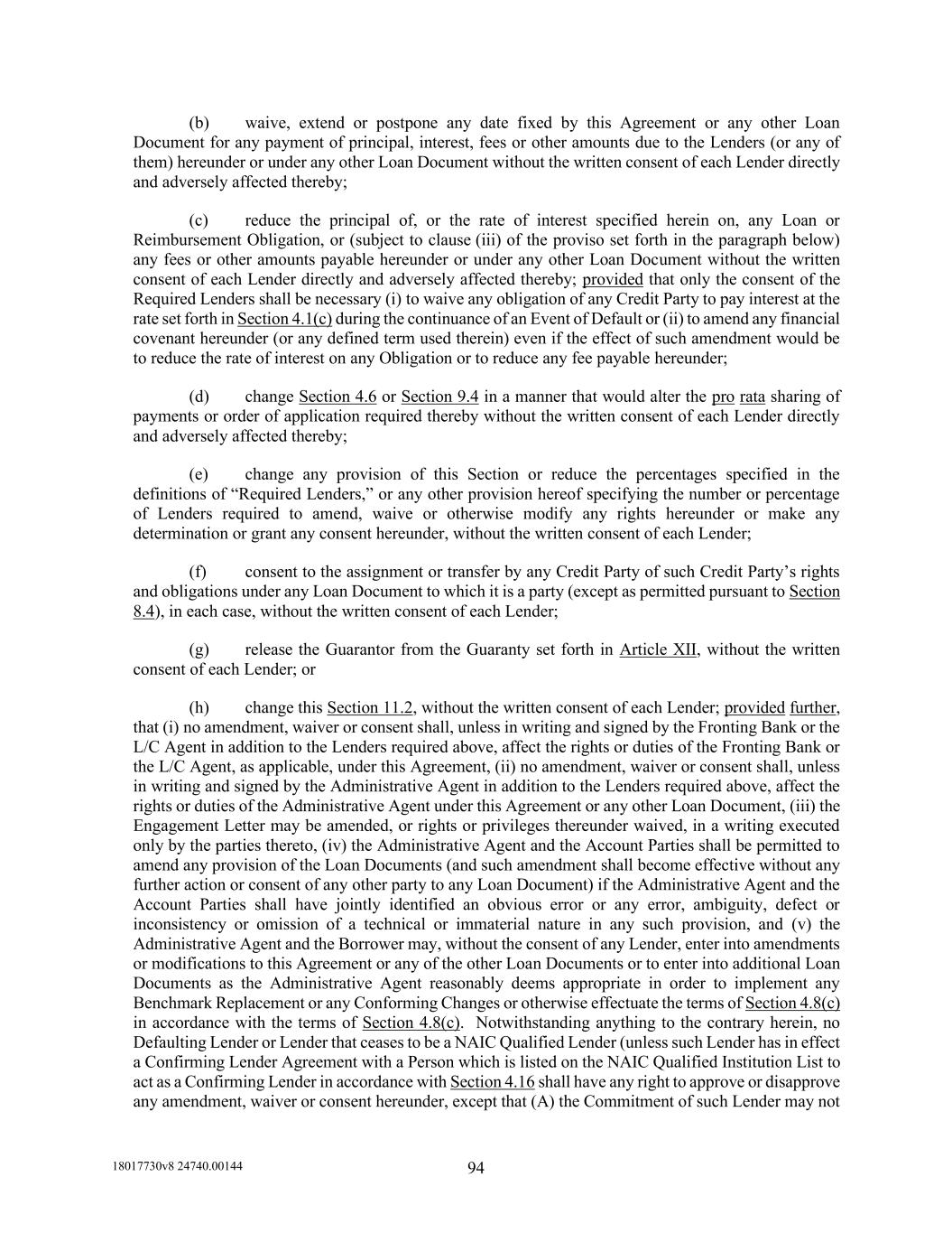 18017730v8 24740.00144 94 (b) waive, extend or postpone any date fixed by this Agreement or any other Loan Document for any payment of principal, interest, fees or other amounts due to the Lenders (or any of them) hereunder or under any other Loan Document without the written consent of each Lender directly and adversely affected thereby; (c) reduce the principal of, or the rate of interest specified herein on, any Loan or Reimbursement Obligation, or (subject to clause (iii) of the proviso set forth in the paragraph below) any fees or other amounts payable hereunder or under any other Loan Document without the written consent of each Lender directly and adversely affected thereby; provided that only the consent of the Required Lenders shall be necessary (i) to waive any obligation of any Credit Party to pay interest at the rate set forth in Section 4.1(c) during the continuance of an Event of Default or (ii) to amend any financial covenant hereunder (or any defined term used therein) even if the effect of such amendment would be to reduce the rate of interest on any Obligation or to reduce any fee payable hereunder; (d) change Section 4.6 or Section 9.4 in a manner that would alter the pro rata sharing of payments or order of application required thereby without the written consent of each Lender directly and adversely affected thereby; (e) change any provision of this Section or reduce the percentages specified in the definitions of “Required Lenders,” or any other provision hereof specifying the number or percentage of Lenders required to amend, waive or otherwise modify any rights hereunder or make any determination or grant any consent hereunder, without the written consent of each Lender; (f) consent to the assignment or transfer by any Credit Party of such Credit Party’s rights and obligations under any Loan Document to which it is a party (except as permitted pursuant to Section 8.4), in each case, without the written consent of each Lender; (g) release the Guarantor from the Guaranty set forth in Article XII, without the written consent of each Lender; or (h) change this Section 11.2, without the written consent of each Lender; provided further, that (i) no amendment, waiver or consent shall, unless in writing and signed by the Fronting Bank or the L/C Agent in addition to the Lenders required above, affect the rights or duties of the Fronting Bank or the L/C Agent, as applicable, under this Agreement, (ii) no amendment, waiver or consent shall, unless in writing and signed by the Administrative Agent in addition to the Lenders required above, affect the rights or duties of the Administrative Agent under this Agreement or any other Loan Document, (iii) the Engagement Letter may be amended, or rights or privileges thereunder waived, in a writing executed only by the parties thereto, (iv) the Administrative Agent and the Account Parties shall be permitted to amend any provision of the Loan Documents (and such amendment shall become effective without any further action or consent of any other party to any Loan Document) if the Administrative Agent and the Account Parties shall have jointly identified an obvious error or any error, ambiguity, defect or inconsistency or omission of a technical or immaterial nature in any such provision, and (v) the Administrative Agent and the Borrower may, without the consent of any Lender, enter into amendments or modifications to this Agreement or any of the other Loan Documents or to enter into additional Loan Documents as the Administrative Agent reasonably deems appropriate in order to implement any Benchmark Replacement or any Conforming Changes or otherwise effectuate the terms of Section 4.8(c) in accordance with the terms of Section 4.8(c). Notwithstanding anything to the contrary herein, no Defaulting Lender or Lender that ceases to be a NAIC Qualified Lender (unless such Lender has in effect a Confirming Lender Agreement with a Person which is listed on the NAIC Qualified Institution List to act as a Confirming Lender in accordance with Section 4.16 shall have any right to approve or disapprove any amendment, waiver or consent hereunder, except that (A) the Commitment of such Lender may not