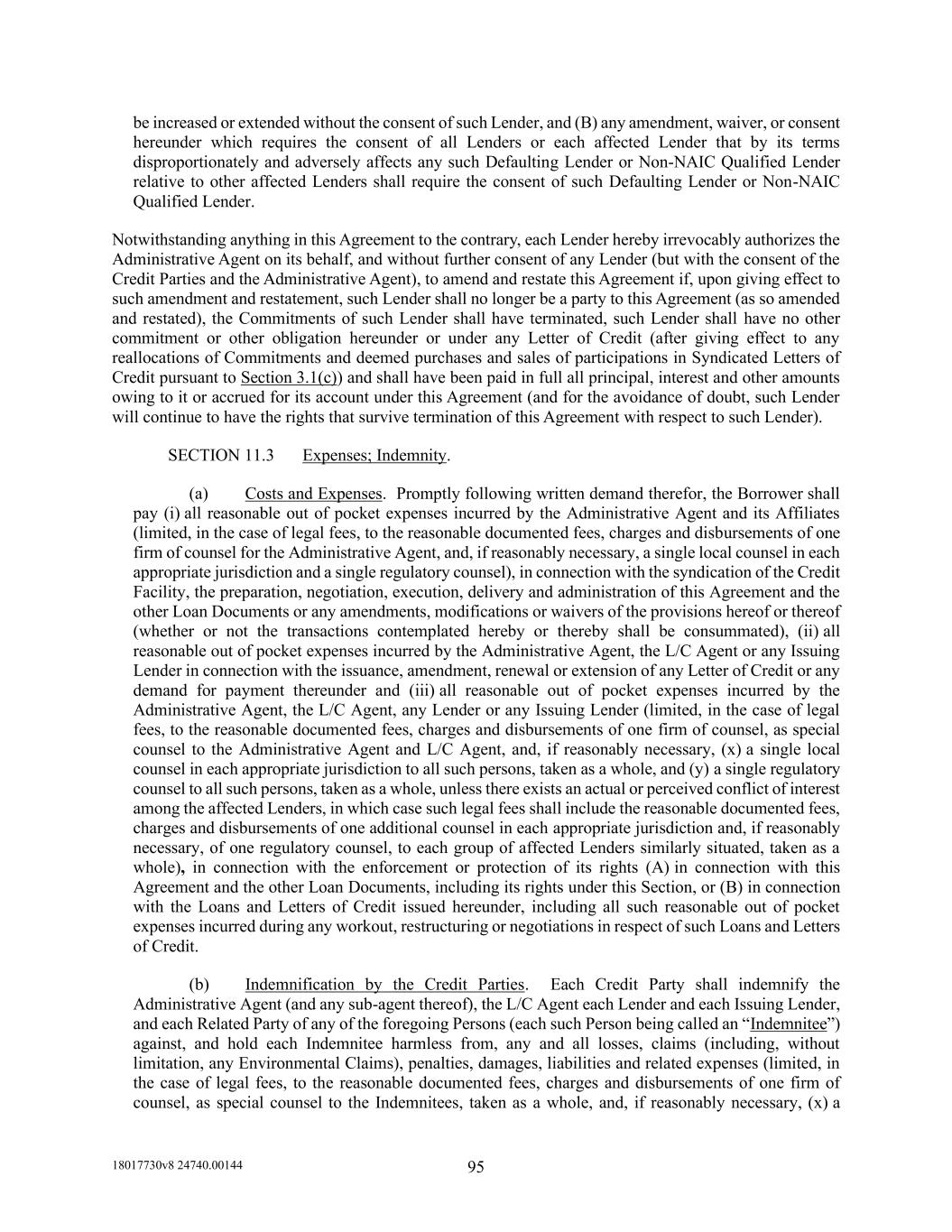 18017730v8 24740.00144 95 be increased or extended without the consent of such Lender, and (B) any amendment, waiver, or consent hereunder which requires the consent of all Lenders or each affected Lender that by its terms disproportionately and adversely affects any such Defaulting Lender or Non-NAIC Qualified Lender relative to other affected Lenders shall require the consent of such Defaulting Lender or Non-NAIC Qualified Lender. Notwithstanding anything in this Agreement to the contrary, each Lender hereby irrevocably authorizes the Administrative Agent on its behalf, and without further consent of any Lender (but with the consent of the Credit Parties and the Administrative Agent), to amend and restate this Agreement if, upon giving effect to such amendment and restatement, such Lender shall no longer be a party to this Agreement (as so amended and restated), the Commitments of such Lender shall have terminated, such Lender shall have no other commitment or other obligation hereunder or under any Letter of Credit (after giving effect to any reallocations of Commitments and deemed purchases and sales of participations in Syndicated Letters of Credit pursuant to Section 3.1(c)) and shall have been paid in full all principal, interest and other amounts owing to it or accrued for its account under this Agreement (and for the avoidance of doubt, such Lender will continue to have the rights that survive termination of this Agreement with respect to such Lender). SECTION 11.3 Expenses; Indemnity. (a) Costs and Expenses. Promptly following written demand therefor, the Borrower shall pay (i) all reasonable out of pocket expenses incurred by the Administrative Agent and its Affiliates (limited, in the case of legal fees, to the reasonable documented fees, charges and disbursements of one firm of counsel for the Administrative Agent, and, if reasonably necessary, a single local counsel in each appropriate jurisdiction and a single regulatory counsel), in connection with the syndication of the Credit Facility, the preparation, negotiation, execution, delivery and administration of this Agreement and the other Loan Documents or any amendments, modifications or waivers of the provisions hereof or thereof (whether or not the transactions contemplated hereby or thereby shall be consummated), (ii) all reasonable out of pocket expenses incurred by the Administrative Agent, the L/C Agent or any Issuing Lender in connection with the issuance, amendment, renewal or extension of any Letter of Credit or any demand for payment thereunder and (iii) all reasonable out of pocket expenses incurred by the Administrative Agent, the L/C Agent, any Lender or any Issuing Lender (limited, in the case of legal fees, to the reasonable documented fees, charges and disbursements of one firm of counsel, as special counsel to the Administrative Agent and L/C Agent, and, if reasonably necessary, (x) a single local counsel in each appropriate jurisdiction to all such persons, taken as a whole, and (y) a single regulatory counsel to all such persons, taken as a whole, unless there exists an actual or perceived conflict of interest among the affected Lenders, in which case such legal fees shall include the reasonable documented fees, charges and disbursements of one additional counsel in each appropriate jurisdiction and, if reasonably necessary, of one regulatory counsel, to each group of affected Lenders similarly situated, taken as a whole), in connection with the enforcement or protection of its rights (A) in connection with this Agreement and the other Loan Documents, including its rights under this Section, or (B) in connection with the Loans and Letters of Credit issued hereunder, including all such reasonable out of pocket expenses incurred during any workout, restructuring or negotiations in respect of such Loans and Letters of Credit. (b) Indemnification by the Credit Parties. Each Credit Party shall indemnify the Administrative Agent (and any sub-agent thereof), the L/C Agent each Lender and each Issuing Lender, and each Related Party of any of the foregoing Persons (each such Person being called an “Indemnitee”) against, and hold each Indemnitee harmless from, any and all losses, claims (including, without limitation, any Environmental Claims), penalties, damages, liabilities and related expenses (limited, in the case of legal fees, to the reasonable documented fees, charges and disbursements of one firm of counsel, as special counsel to the Indemnitees, taken as a whole, and, if reasonably necessary, (x) a