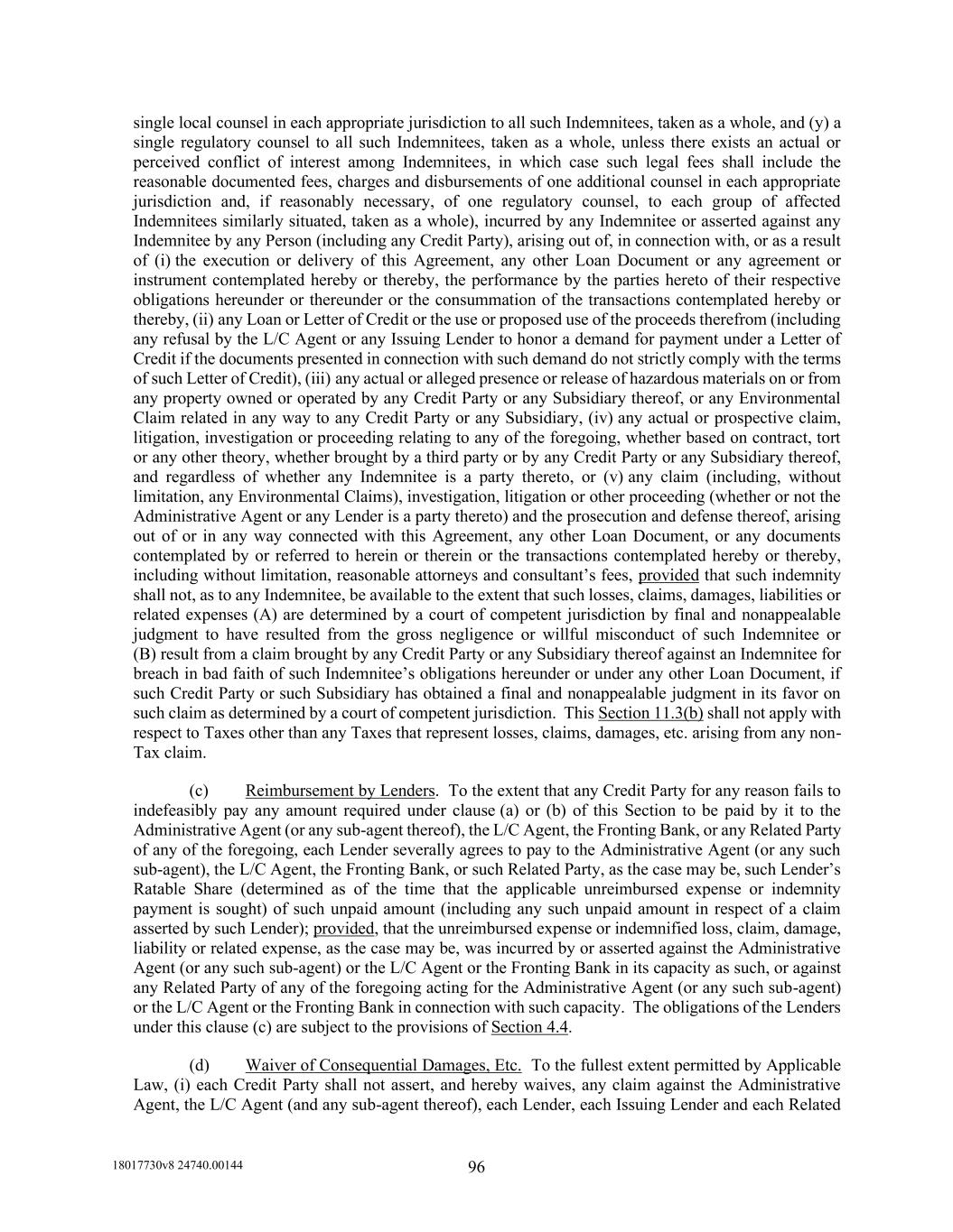 18017730v8 24740.00144 96 single local counsel in each appropriate jurisdiction to all such Indemnitees, taken as a whole, and (y) a single regulatory counsel to all such Indemnitees, taken as a whole, unless there exists an actual or perceived conflict of interest among Indemnitees, in which case such legal fees shall include the reasonable documented fees, charges and disbursements of one additional counsel in each appropriate jurisdiction and, if reasonably necessary, of one regulatory counsel, to each group of affected Indemnitees similarly situated, taken as a whole), incurred by any Indemnitee or asserted against any Indemnitee by any Person (including any Credit Party), arising out of, in connection with, or as a result of (i) the execution or delivery of this Agreement, any other Loan Document or any agreement or instrument contemplated hereby or thereby, the performance by the parties hereto of their respective obligations hereunder or thereunder or the consummation of the transactions contemplated hereby or thereby, (ii) any Loan or Letter of Credit or the use or proposed use of the proceeds therefrom (including any refusal by the L/C Agent or any Issuing Lender to honor a demand for payment under a Letter of Credit if the documents presented in connection with such demand do not strictly comply with the terms of such Letter of Credit), (iii) any actual or alleged presence or release of hazardous materials on or from any property owned or operated by any Credit Party or any Subsidiary thereof, or any Environmental Claim related in any way to any Credit Party or any Subsidiary, (iv) any actual or prospective claim, litigation, investigation or proceeding relating to any of the foregoing, whether based on contract, tort or any other theory, whether brought by a third party or by any Credit Party or any Subsidiary thereof, and regardless of whether any Indemnitee is a party thereto, or (v) any claim (including, without limitation, any Environmental Claims), investigation, litigation or other proceeding (whether or not the Administrative Agent or any Lender is a party thereto) and the prosecution and defense thereof, arising out of or in any way connected with this Agreement, any other Loan Document, or any documents contemplated by or referred to herein or therein or the transactions contemplated hereby or thereby, including without limitation, reasonable attorneys and consultant’s fees, provided that such indemnity shall not, as to any Indemnitee, be available to the extent that such losses, claims, damages, liabilities or related expenses (A) are determined by a court of competent jurisdiction by final and nonappealable judgment to have resulted from the gross negligence or willful misconduct of such Indemnitee or (B) result from a claim brought by any Credit Party or any Subsidiary thereof against an Indemnitee for breach in bad faith of such Indemnitee’s obligations hereunder or under any other Loan Document, if such Credit Party or such Subsidiary has obtained a final and nonappealable judgment in its favor on such claim as determined by a court of competent jurisdiction. This Section 11.3(b) shall not apply with respect to Taxes other than any Taxes that represent losses, claims, damages, etc. arising from any non- Tax claim. (c) Reimbursement by Lenders. To the extent that any Credit Party for any reason fails to indefeasibly pay any amount required under clause (a) or (b) of this Section to be paid by it to the Administrative Agent (or any sub-agent thereof), the L/C Agent, the Fronting Bank, or any Related Party of any of the foregoing, each Lender severally agrees to pay to the Administrative Agent (or any such sub-agent), the L/C Agent, the Fronting Bank, or such Related Party, as the case may be, such Lender’s Ratable Share (determined as of the time that the applicable unreimbursed expense or indemnity payment is sought) of such unpaid amount (including any such unpaid amount in respect of a claim asserted by such Lender); provided, that the unreimbursed expense or indemnified loss, claim, damage, liability or related expense, as the case may be, was incurred by or asserted against the Administrative Agent (or any such sub-agent) or the L/C Agent or the Fronting Bank in its capacity as such, or against any Related Party of any of the foregoing acting for the Administrative Agent (or any such sub-agent) or the L/C Agent or the Fronting Bank in connection with such capacity. The obligations of the Lenders under this clause (c) are subject to the provisions of Section 4.4. (d) Waiver of Consequential Damages, Etc. To the fullest extent permitted by Applicable Law, (i) each Credit Party shall not assert, and hereby waives, any claim against the Administrative Agent, the L/C Agent (and any sub-agent thereof), each Lender, each Issuing Lender and each Related