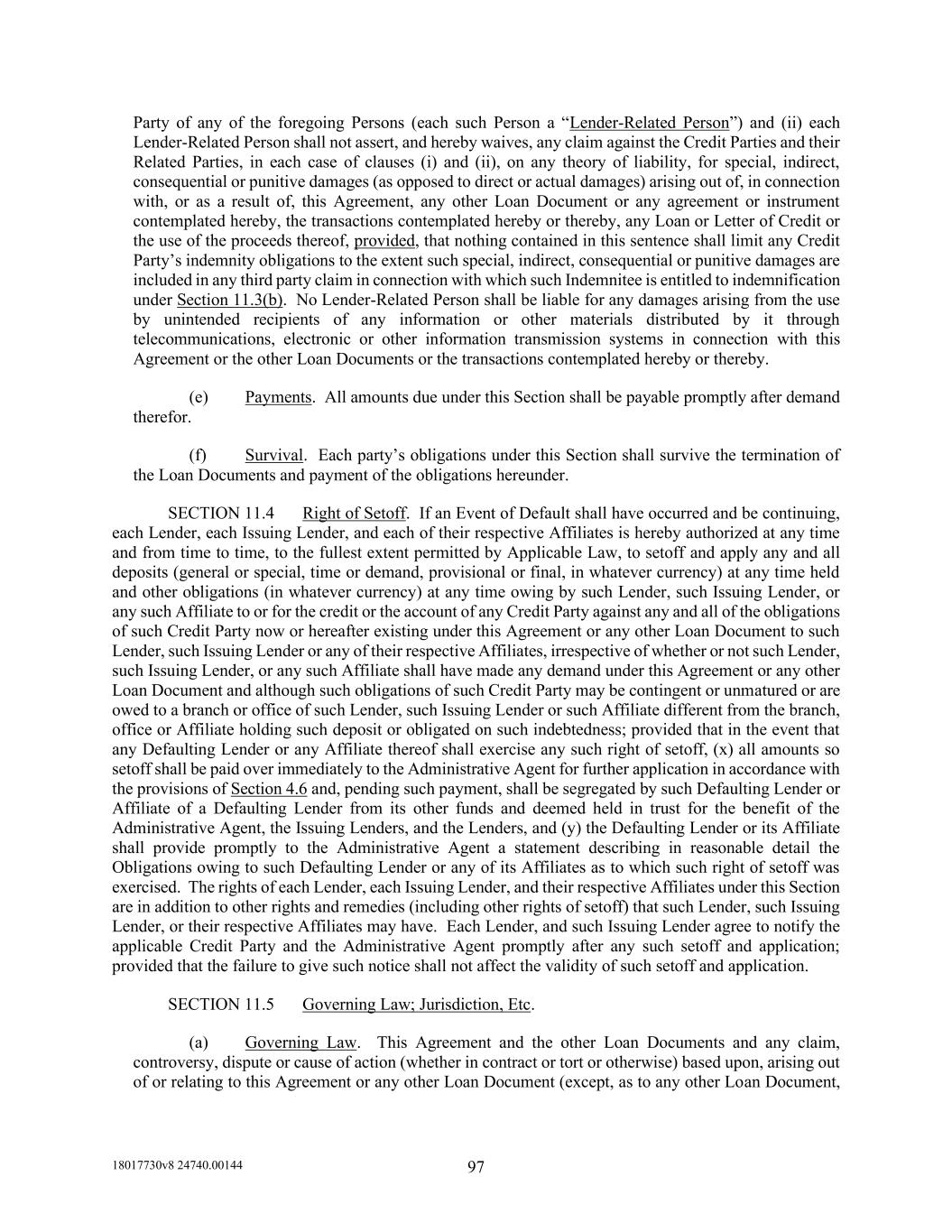 18017730v8 24740.00144 97 Party of any of the foregoing Persons (each such Person a “Lender-Related Person”) and (ii) each Lender-Related Person shall not assert, and hereby waives, any claim against the Credit Parties and their Related Parties, in each case of clauses (i) and (ii), on any theory of liability, for special, indirect, consequential or punitive damages (as opposed to direct or actual damages) arising out of, in connection with, or as a result of, this Agreement, any other Loan Document or any agreement or instrument contemplated hereby, the transactions contemplated hereby or thereby, any Loan or Letter of Credit or the use of the proceeds thereof, provided, that nothing contained in this sentence shall limit any Credit Party’s indemnity obligations to the extent such special, indirect, consequential or punitive damages are included in any third party claim in connection with which such Indemnitee is entitled to indemnification under Section 11.3(b). No Lender-Related Person shall be liable for any damages arising from the use by unintended recipients of any information or other materials distributed by it through telecommunications, electronic or other information transmission systems in connection with this Agreement or the other Loan Documents or the transactions contemplated hereby or thereby. (e) Payments. All amounts due under this Section shall be payable promptly after demand therefor. (f) Survival. Each party’s obligations under this Section shall survive the termination of the Loan Documents and payment of the obligations hereunder. SECTION 11.4 Right of Setoff. If an Event of Default shall have occurred and be continuing, each Lender, each Issuing Lender, and each of their respective Affiliates is hereby authorized at any time and from time to time, to the fullest extent permitted by Applicable Law, to setoff and apply any and all deposits (general or special, time or demand, provisional or final, in whatever currency) at any time held and other obligations (in whatever currency) at any time owing by such Lender, such Issuing Lender, or any such Affiliate to or for the credit or the account of any Credit Party against any and all of the obligations of such Credit Party now or hereafter existing under this Agreement or any other Loan Document to such Lender, such Issuing Lender or any of their respective Affiliates, irrespective of whether or not such Lender, such Issuing Lender, or any such Affiliate shall have made any demand under this Agreement or any other Loan Document and although such obligations of such Credit Party may be contingent or unmatured or are owed to a branch or office of such Lender, such Issuing Lender or such Affiliate different from the branch, office or Affiliate holding such deposit or obligated on such indebtedness; provided that in the event that any Defaulting Lender or any Affiliate thereof shall exercise any such right of setoff, (x) all amounts so setoff shall be paid over immediately to the Administrative Agent for further application in accordance with the provisions of Section 4.6 and, pending such payment, shall be segregated by such Defaulting Lender or Affiliate of a Defaulting Lender from its other funds and deemed held in trust for the benefit of the Administrative Agent, the Issuing Lenders, and the Lenders, and (y) the Defaulting Lender or its Affiliate shall provide promptly to the Administrative Agent a statement describing in reasonable detail the Obligations owing to such Defaulting Lender or any of its Affiliates as to which such right of setoff was exercised. The rights of each Lender, each Issuing Lender, and their respective Affiliates under this Section are in addition to other rights and remedies (including other rights of setoff) that such Lender, such Issuing Lender, or their respective Affiliates may have. Each Lender, and such Issuing Lender agree to notify the applicable Credit Party and the Administrative Agent promptly after any such setoff and application; provided that the failure to give such notice shall not affect the validity of such setoff and application. SECTION 11.5 Governing Law; Jurisdiction, Etc. (a) Governing Law. This Agreement and the other Loan Documents and any claim, controversy, dispute or cause of action (whether in contract or tort or otherwise) based upon, arising out of or relating to this Agreement or any other Loan Document (except, as to any other Loan Document,