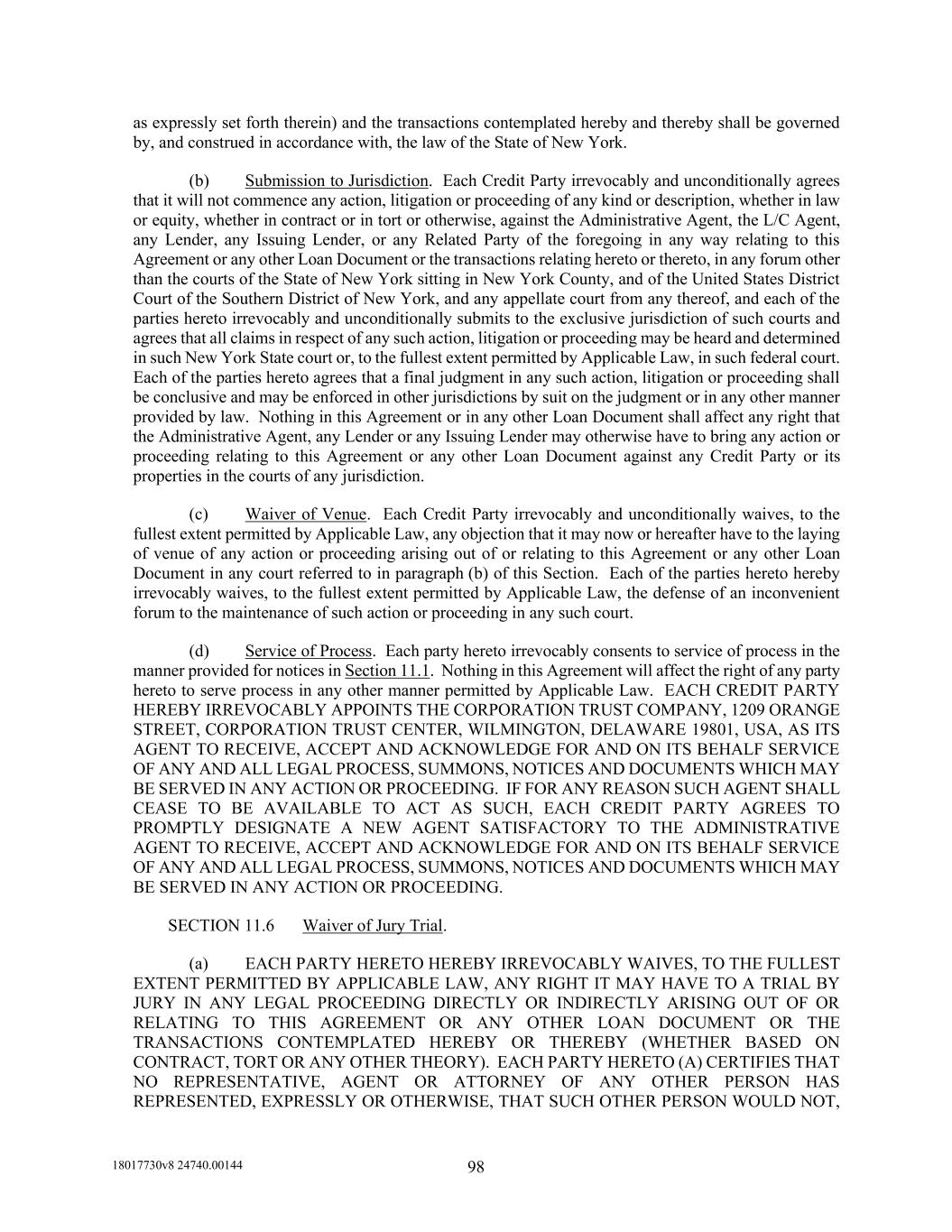 18017730v8 24740.00144 98 as expressly set forth therein) and the transactions contemplated hereby and thereby shall be governed by, and construed in accordance with, the law of the State of New York. (b) Submission to Jurisdiction. Each Credit Party irrevocably and unconditionally agrees that it will not commence any action, litigation or proceeding of any kind or description, whether in law or equity, whether in contract or in tort or otherwise, against the Administrative Agent, the L/C Agent, any Lender, any Issuing Lender, or any Related Party of the foregoing in any way relating to this Agreement or any other Loan Document or the transactions relating hereto or thereto, in any forum other than the courts of the State of New York sitting in New York County, and of the United States District Court of the Southern District of New York, and any appellate court from any thereof, and each of the parties hereto irrevocably and unconditionally submits to the exclusive jurisdiction of such courts and agrees that all claims in respect of any such action, litigation or proceeding may be heard and determined in such New York State court or, to the fullest extent permitted by Applicable Law, in such federal court. Each of the parties hereto agrees that a final judgment in any such action, litigation or proceeding shall be conclusive and may be enforced in other jurisdictions by suit on the judgment or in any other manner provided by law. Nothing in this Agreement or in any other Loan Document shall affect any right that the Administrative Agent, any Lender or any Issuing Lender may otherwise have to bring any action or proceeding relating to this Agreement or any other Loan Document against any Credit Party or its properties in the courts of any jurisdiction. (c) Waiver of Venue. Each Credit Party irrevocably and unconditionally waives, to the fullest extent permitted by Applicable Law, any objection that it may now or hereafter have to the laying of venue of any action or proceeding arising out of or relating to this Agreement or any other Loan Document in any court referred to in paragraph (b) of this Section. Each of the parties hereto hereby irrevocably waives, to the fullest extent permitted by Applicable Law, the defense of an inconvenient forum to the maintenance of such action or proceeding in any such court. (d) Service of Process. Each party hereto irrevocably consents to service of process in the manner provided for notices in Section 11.1. Nothing in this Agreement will affect the right of any party hereto to serve process in any other manner permitted by Applicable Law. EACH CREDIT PARTY HEREBY IRREVOCABLY APPOINTS THE CORPORATION TRUST COMPANY, 1209 ORANGE STREET, CORPORATION TRUST CENTER, WILMINGTON, DELAWARE 19801, USA, AS ITS AGENT TO RECEIVE, ACCEPT AND ACKNOWLEDGE FOR AND ON ITS BEHALF SERVICE OF ANY AND ALL LEGAL PROCESS, SUMMONS, NOTICES AND DOCUMENTS WHICH MAY BE SERVED IN ANY ACTION OR PROCEEDING. IF FOR ANY REASON SUCH AGENT SHALL CEASE TO BE AVAILABLE TO ACT AS SUCH, EACH CREDIT PARTY AGREES TO PROMPTLY DESIGNATE A NEW AGENT SATISFACTORY TO THE ADMINISTRATIVE AGENT TO RECEIVE, ACCEPT AND ACKNOWLEDGE FOR AND ON ITS BEHALF SERVICE OF ANY AND ALL LEGAL PROCESS, SUMMONS, NOTICES AND DOCUMENTS WHICH MAY BE SERVED IN ANY ACTION OR PROCEEDING. SECTION 11.6 Waiver of Jury Trial. (a) EACH PARTY HERETO HEREBY IRREVOCABLY WAIVES, TO THE FULLEST EXTENT PERMITTED BY APPLICABLE LAW, ANY RIGHT IT MAY HAVE TO A TRIAL BY JURY IN ANY LEGAL PROCEEDING DIRECTLY OR INDIRECTLY ARISING OUT OF OR RELATING TO THIS AGREEMENT OR ANY OTHER LOAN DOCUMENT OR THE TRANSACTIONS CONTEMPLATED HEREBY OR THEREBY (WHETHER BASED ON CONTRACT, TORT OR ANY OTHER THEORY). EACH PARTY HERETO (A) CERTIFIES THAT NO REPRESENTATIVE, AGENT OR ATTORNEY OF ANY OTHER PERSON HAS REPRESENTED, EXPRESSLY OR OTHERWISE, THAT SUCH OTHER PERSON WOULD NOT,