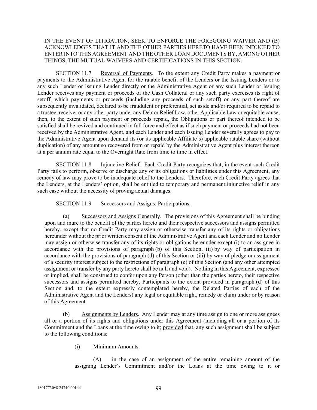 18017730v8 24740.00144 99 IN THE EVENT OF LITIGATION, SEEK TO ENFORCE THE FOREGOING WAIVER AND (B) ACKNOWLEDGES THAT IT AND THE OTHER PARTIES HERETO HAVE BEEN INDUCED TO ENTER INTO THIS AGREEMENT AND THE OTHER LOAN DOCUMENTS BY, AMONG OTHER THINGS, THE MUTUAL WAIVERS AND CERTIFICATIONS IN THIS SECTION. SECTION 11.7 Reversal of Payments. To the extent any Credit Party makes a payment or payments to the Administrative Agent for the ratable benefit of the Lenders or the Issuing Lenders or to any such Lender or Issuing Lender directly or the Administrative Agent or any such Lender or Issuing Lender receives any payment or proceeds of the Cash Collateral or any such party exercises its right of setoff, which payments or proceeds (including any proceeds of such setoff) or any part thereof are subsequently invalidated, declared to be fraudulent or preferential, set aside and/or required to be repaid to a trustee, receiver or any other party under any Debtor Relief Law, other Applicable Law or equitable cause, then, to the extent of such payment or proceeds repaid, the Obligations or part thereof intended to be satisfied shall be revived and continued in full force and effect as if such payment or proceeds had not been received by the Administrative Agent, and each Lender and each Issuing Lender severally agrees to pay to the Administrative Agent upon demand its (or its applicable Affiliate’s) applicable ratable share (without duplication) of any amount so recovered from or repaid by the Administrative Agent plus interest thereon at a per annum rate equal to the Overnight Rate from time to time in effect. SECTION 11.8 Injunctive Relief. Each Credit Party recognizes that, in the event such Credit Party fails to perform, observe or discharge any of its obligations or liabilities under this Agreement, any remedy of law may prove to be inadequate relief to the Lenders. Therefore, each Credit Party agrees that the Lenders, at the Lenders’ option, shall be entitled to temporary and permanent injunctive relief in any such case without the necessity of proving actual damages. SECTION 11.9 Successors and Assigns; Participations. (a) Successors and Assigns Generally. The provisions of this Agreement shall be binding upon and inure to the benefit of the parties hereto and their respective successors and assigns permitted hereby, except that no Credit Party may assign or otherwise transfer any of its rights or obligations hereunder without the prior written consent of the Administrative Agent and each Lender and no Lender may assign or otherwise transfer any of its rights or obligations hereunder except (i) to an assignee in accordance with the provisions of paragraph (b) of this Section, (ii) by way of participation in accordance with the provisions of paragraph (d) of this Section or (iii) by way of pledge or assignment of a security interest subject to the restrictions of paragraph (e) of this Section (and any other attempted assignment or transfer by any party hereto shall be null and void). Nothing in this Agreement, expressed or implied, shall be construed to confer upon any Person (other than the parties hereto, their respective successors and assigns permitted hereby, Participants to the extent provided in paragraph (d) of this Section and, to the extent expressly contemplated hereby, the Related Parties of each of the Administrative Agent and the Lenders) any legal or equitable right, remedy or claim under or by reason of this Agreement. (b) Assignments by Lenders. Any Lender may at any time assign to one or more assignees all or a portion of its rights and obligations under this Agreement (including all or a portion of its Commitment and the Loans at the time owing to it; provided that, any such assignment shall be subject to the following conditions: (i) Minimum Amounts. (A) in the case of an assignment of the entire remaining amount of the assigning Lender’s Commitment and/or the Loans at the time owing to it or