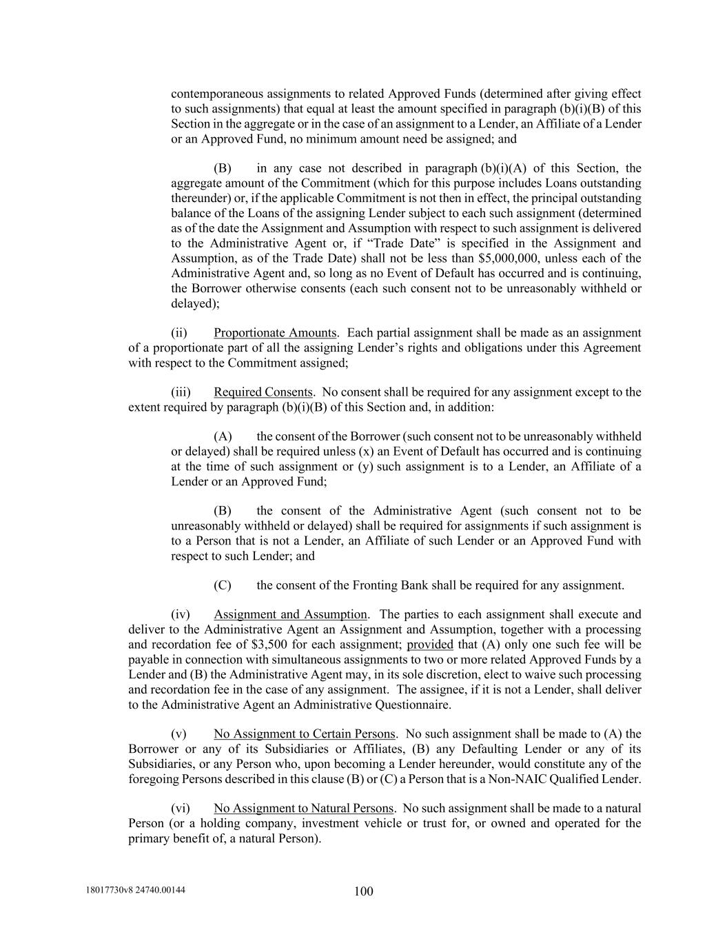 18017730v8 24740.00144 100 contemporaneous assignments to related Approved Funds (determined after giving effect to such assignments) that equal at least the amount specified in paragraph (b)(i)(B) of this Section in the aggregate or in the case of an assignment to a Lender, an Affiliate of a Lender or an Approved Fund, no minimum amount need be assigned; and (B) in any case not described in paragraph (b)(i)(A) of this Section, the aggregate amount of the Commitment (which for this purpose includes Loans outstanding thereunder) or, if the applicable Commitment is not then in effect, the principal outstanding balance of the Loans of the assigning Lender subject to each such assignment (determined as of the date the Assignment and Assumption with respect to such assignment is delivered to the Administrative Agent or, if “Trade Date” is specified in the Assignment and Assumption, as of the Trade Date) shall not be less than $5,000,000, unless each of the Administrative Agent and, so long as no Event of Default has occurred and is continuing, the Borrower otherwise consents (each such consent not to be unreasonably withheld or delayed); (ii) Proportionate Amounts. Each partial assignment shall be made as an assignment of a proportionate part of all the assigning Lender’s rights and obligations under this Agreement with respect to the Commitment assigned; (iii) Required Consents. No consent shall be required for any assignment except to the extent required by paragraph (b)(i)(B) of this Section and, in addition: (A) the consent of the Borrower (such consent not to be unreasonably withheld or delayed) shall be required unless (x) an Event of Default has occurred and is continuing at the time of such assignment or (y) such assignment is to a Lender, an Affiliate of a Lender or an Approved Fund; (B) the consent of the Administrative Agent (such consent not to be unreasonably withheld or delayed) shall be required for assignments if such assignment is to a Person that is not a Lender, an Affiliate of such Lender or an Approved Fund with respect to such Lender; and (C) the consent of the Fronting Bank shall be required for any assignment. (iv) Assignment and Assumption. The parties to each assignment shall execute and deliver to the Administrative Agent an Assignment and Assumption, together with a processing and recordation fee of $3,500 for each assignment; provided that (A) only one such fee will be payable in connection with simultaneous assignments to two or more related Approved Funds by a Lender and (B) the Administrative Agent may, in its sole discretion, elect to waive such processing and recordation fee in the case of any assignment. The assignee, if it is not a Lender, shall deliver to the Administrative Agent an Administrative Questionnaire. (v) No Assignment to Certain Persons. No such assignment shall be made to (A) the Borrower or any of its Subsidiaries or Affiliates, (B) any Defaulting Lender or any of its Subsidiaries, or any Person who, upon becoming a Lender hereunder, would constitute any of the foregoing Persons described in this clause (B) or (C) a Person that is a Non-NAIC Qualified Lender. (vi) No Assignment to Natural Persons. No such assignment shall be made to a natural Person (or a holding company, investment vehicle or trust for, or owned and operated for the primary benefit of, a natural Person).