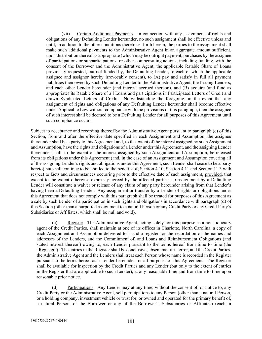 18017730v8 24740.00144 101 (vii) Certain Additional Payments. In connection with any assignment of rights and obligations of any Defaulting Lender hereunder, no such assignment shall be effective unless and until, in addition to the other conditions thereto set forth herein, the parties to the assignment shall make such additional payments to the Administrative Agent in an aggregate amount sufficient, upon distribution thereof as appropriate (which may be outright payment, purchases by the assignee of participations or subparticipations, or other compensating actions, including funding, with the consent of the Borrower and the Administrative Agent, the applicable Ratable Share of Loans previously requested, but not funded by, the Defaulting Lender, to each of which the applicable assignee and assignor hereby irrevocably consent), to (A) pay and satisfy in full all payment liabilities then owed by such Defaulting Lender to the Administrative Agent, the Issuing Lenders, and each other Lender hereunder (and interest accrued thereon), and (B) acquire (and fund as appropriate) its Ratable Share of all Loans and participations in Participated Letters of Credit and drawn Syndicated Letters of Credit. Notwithstanding the foregoing, in the event that any assignment of rights and obligations of any Defaulting Lender hereunder shall become effective under Applicable Law without compliance with the provisions of this paragraph, then the assignee of such interest shall be deemed to be a Defaulting Lender for all purposes of this Agreement until such compliance occurs. Subject to acceptance and recording thereof by the Administrative Agent pursuant to paragraph (c) of this Section, from and after the effective date specified in each Assignment and Assumption, the assignee thereunder shall be a party to this Agreement and, to the extent of the interest assigned by such Assignment and Assumption, have the rights and obligations of a Lender under this Agreement, and the assigning Lender thereunder shall, to the extent of the interest assigned by such Assignment and Assumption, be released from its obligations under this Agreement (and, in the case of an Assignment and Assumption covering all of the assigning Lender’s rights and obligations under this Agreement, such Lender shall cease to be a party hereto) but shall continue to be entitled to the benefits of, Section 4.10, Section 4.11 and Section 11.3 with respect to facts and circumstances occurring prior to the effective date of such assignment; provided, that except to the extent otherwise expressly agreed by the affected parties, no assignment by a Defaulting Lender will constitute a waiver or release of any claim of any party hereunder arising from that Lender’s having been a Defaulting Lender. Any assignment or transfer by a Lender of rights or obligations under this Agreement that does not comply with this paragraph shall be treated for purposes of this Agreement as a sale by such Lender of a participation in such rights and obligations in accordance with paragraph (d) of this Section (other than a purported assignment to a natural Person or any Credit Party or any Credit Party’s Subsidiaries or Affiliates, which shall be null and void). (c) Register. The Administrative Agent, acting solely for this purpose as a non-fiduciary agent of the Credit Parties, shall maintain at one of its offices in Charlotte, North Carolina, a copy of each Assignment and Assumption delivered to it and a register for the recordation of the names and addresses of the Lenders, and the Commitment of, and Loans and Reimbursement Obligations (and stated interest thereon) owing to, each Lender pursuant to the terms hereof from time to time (the “Register”). The entries in the Register shall be conclusive, absent manifest error, and the Credit Parties, the Administrative Agent and the Lenders shall treat each Person whose name is recorded in the Register pursuant to the terms hereof as a Lender hereunder for all purposes of this Agreement. The Register shall be available for inspection by the Credit Parties and any Lender (but only to the extent of entries in the Register that are applicable to such Lender), at any reasonable time and from time to time upon reasonable prior notice. (d) Participations. Any Lender may at any time, without the consent of, or notice to, any Credit Party or the Administrative Agent, sell participations to any Person (other than a natural Person, or a holding company, investment vehicle or trust for, or owned and operated for the primary benefit of, a natural Person, or the Borrower or any of the Borrower’s Subsidiaries or Affiliates) (each, a