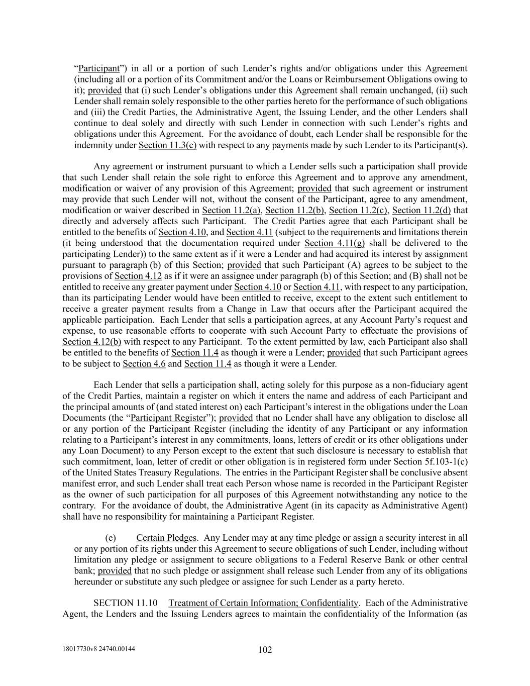 18017730v8 24740.00144 102 “Participant”) in all or a portion of such Lender’s rights and/or obligations under this Agreement (including all or a portion of its Commitment and/or the Loans or Reimbursement Obligations owing to it); provided that (i) such Lender’s obligations under this Agreement shall remain unchanged, (ii) such Lender shall remain solely responsible to the other parties hereto for the performance of such obligations and (iii) the Credit Parties, the Administrative Agent, the Issuing Lender, and the other Lenders shall continue to deal solely and directly with such Lender in connection with such Lender’s rights and obligations under this Agreement. For the avoidance of doubt, each Lender shall be responsible for the indemnity under Section 11.3(c) with respect to any payments made by such Lender to its Participant(s). Any agreement or instrument pursuant to which a Lender sells such a participation shall provide that such Lender shall retain the sole right to enforce this Agreement and to approve any amendment, modification or waiver of any provision of this Agreement; provided that such agreement or instrument may provide that such Lender will not, without the consent of the Participant, agree to any amendment, modification or waiver described in Section 11.2(a), Section 11.2(b), Section 11.2(c), Section 11.2(d) that directly and adversely affects such Participant. The Credit Parties agree that each Participant shall be entitled to the benefits of Section 4.10, and Section 4.11 (subject to the requirements and limitations therein (it being understood that the documentation required under Section 4.11(g) shall be delivered to the participating Lender)) to the same extent as if it were a Lender and had acquired its interest by assignment pursuant to paragraph (b) of this Section; provided that such Participant (A) agrees to be subject to the provisions of Section 4.12 as if it were an assignee under paragraph (b) of this Section; and (B) shall not be entitled to receive any greater payment under Section 4.10 or Section 4.11, with respect to any participation, than its participating Lender would have been entitled to receive, except to the extent such entitlement to receive a greater payment results from a Change in Law that occurs after the Participant acquired the applicable participation. Each Lender that sells a participation agrees, at any Account Party’s request and expense, to use reasonable efforts to cooperate with such Account Party to effectuate the provisions of Section 4.12(b) with respect to any Participant. To the extent permitted by law, each Participant also shall be entitled to the benefits of Section 11.4 as though it were a Lender; provided that such Participant agrees to be subject to Section 4.6 and Section 11.4 as though it were a Lender. Each Lender that sells a participation shall, acting solely for this purpose as a non-fiduciary agent of the Credit Parties, maintain a register on which it enters the name and address of each Participant and the principal amounts of (and stated interest on) each Participant’s interest in the obligations under the Loan Documents (the “Participant Register”); provided that no Lender shall have any obligation to disclose all or any portion of the Participant Register (including the identity of any Participant or any information relating to a Participant’s interest in any commitments, loans, letters of credit or its other obligations under any Loan Document) to any Person except to the extent that such disclosure is necessary to establish that such commitment, loan, letter of credit or other obligation is in registered form under Section 5f.103-1(c) of the United States Treasury Regulations. The entries in the Participant Register shall be conclusive absent manifest error, and such Lender shall treat each Person whose name is recorded in the Participant Register as the owner of such participation for all purposes of this Agreement notwithstanding any notice to the contrary. For the avoidance of doubt, the Administrative Agent (in its capacity as Administrative Agent) shall have no responsibility for maintaining a Participant Register. (e) Certain Pledges. Any Lender may at any time pledge or assign a security interest in all or any portion of its rights under this Agreement to secure obligations of such Lender, including without limitation any pledge or assignment to secure obligations to a Federal Reserve Bank or other central bank; provided that no such pledge or assignment shall release such Lender from any of its obligations hereunder or substitute any such pledgee or assignee for such Lender as a party hereto. SECTION 11.10 Treatment of Certain Information; Confidentiality. Each of the Administrative Agent, the Lenders and the Issuing Lenders agrees to maintain the confidentiality of the Information (as