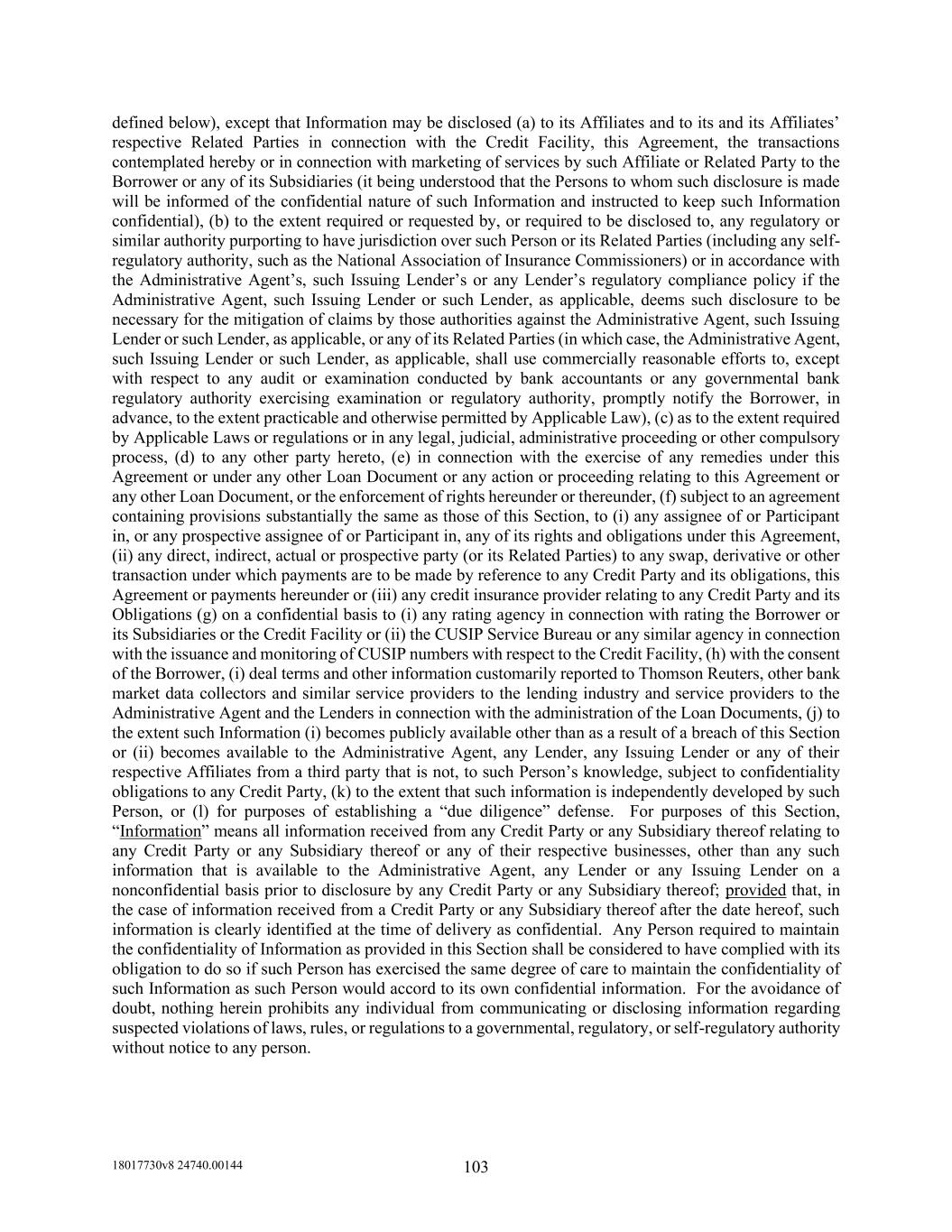 18017730v8 24740.00144 103 defined below), except that Information may be disclosed (a) to its Affiliates and to its and its Affiliates’ respective Related Parties in connection with the Credit Facility, this Agreement, the transactions contemplated hereby or in connection with marketing of services by such Affiliate or Related Party to the Borrower or any of its Subsidiaries (it being understood that the Persons to whom such disclosure is made will be informed of the confidential nature of such Information and instructed to keep such Information confidential), (b) to the extent required or requested by, or required to be disclosed to, any regulatory or similar authority purporting to have jurisdiction over such Person or its Related Parties (including any self- regulatory authority, such as the National Association of Insurance Commissioners) or in accordance with the Administrative Agent’s, such Issuing Lender’s or any Lender’s regulatory compliance policy if the Administrative Agent, such Issuing Lender or such Lender, as applicable, deems such disclosure to be necessary for the mitigation of claims by those authorities against the Administrative Agent, such Issuing Lender or such Lender, as applicable, or any of its Related Parties (in which case, the Administrative Agent, such Issuing Lender or such Lender, as applicable, shall use commercially reasonable efforts to, except with respect to any audit or examination conducted by bank accountants or any governmental bank regulatory authority exercising examination or regulatory authority, promptly notify the Borrower, in advance, to the extent practicable and otherwise permitted by Applicable Law), (c) as to the extent required by Applicable Laws or regulations or in any legal, judicial, administrative proceeding or other compulsory process, (d) to any other party hereto, (e) in connection with the exercise of any remedies under this Agreement or under any other Loan Document or any action or proceeding relating to this Agreement or any other Loan Document, or the enforcement of rights hereunder or thereunder, (f) subject to an agreement containing provisions substantially the same as those of this Section, to (i) any assignee of or Participant in, or any prospective assignee of or Participant in, any of its rights and obligations under this Agreement, (ii) any direct, indirect, actual or prospective party (or its Related Parties) to any swap, derivative or other transaction under which payments are to be made by reference to any Credit Party and its obligations, this Agreement or payments hereunder or (iii) any credit insurance provider relating to any Credit Party and its Obligations (g) on a confidential basis to (i) any rating agency in connection with rating the Borrower or its Subsidiaries or the Credit Facility or (ii) the CUSIP Service Bureau or any similar agency in connection with the issuance and monitoring of CUSIP numbers with respect to the Credit Facility, (h) with the consent of the Borrower, (i) deal terms and other information customarily reported to Thomson Reuters, other bank market data collectors and similar service providers to the lending industry and service providers to the Administrative Agent and the Lenders in connection with the administration of the Loan Documents, (j) to the extent such Information (i) becomes publicly available other than as a result of a breach of this Section or (ii) becomes available to the Administrative Agent, any Lender, any Issuing Lender or any of their respective Affiliates from a third party that is not, to such Person’s knowledge, subject to confidentiality obligations to any Credit Party, (k) to the extent that such information is independently developed by such Person, or (l) for purposes of establishing a “due diligence” defense. For purposes of this Section, “Information” means all information received from any Credit Party or any Subsidiary thereof relating to any Credit Party or any Subsidiary thereof or any of their respective businesses, other than any such information that is available to the Administrative Agent, any Lender or any Issuing Lender on a nonconfidential basis prior to disclosure by any Credit Party or any Subsidiary thereof; provided that, in the case of information received from a Credit Party or any Subsidiary thereof after the date hereof, such information is clearly identified at the time of delivery as confidential. Any Person required to maintain the confidentiality of Information as provided in this Section shall be considered to have complied with its obligation to do so if such Person has exercised the same degree of care to maintain the confidentiality of such Information as such Person would accord to its own confidential information. For the avoidance of doubt, nothing herein prohibits any individual from communicating or disclosing information regarding suspected violations of laws, rules, or regulations to a governmental, regulatory, or self-regulatory authority without notice to any person.