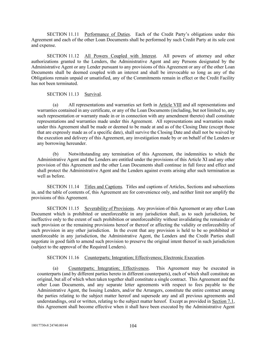 18017730v8 24740.00144 104 SECTION 11.11 Performance of Duties. Each of the Credit Party’s obligations under this Agreement and each of the other Loan Documents shall be performed by such Credit Party at its sole cost and expense. SECTION 11.12 All Powers Coupled with Interest. All powers of attorney and other authorizations granted to the Lenders, the Administrative Agent and any Persons designated by the Administrative Agent or any Lender pursuant to any provisions of this Agreement or any of the other Loan Documents shall be deemed coupled with an interest and shall be irrevocable so long as any of the Obligations remain unpaid or unsatisfied, any of the Commitments remain in effect or the Credit Facility has not been terminated. SECTION 11.13 Survival. (a) All representations and warranties set forth in Article VIII and all representations and warranties contained in any certificate, or any of the Loan Documents (including, but not limited to, any such representation or warranty made in or in connection with any amendment thereto) shall constitute representations and warranties made under this Agreement. All representations and warranties made under this Agreement shall be made or deemed to be made at and as of the Closing Date (except those that are expressly made as of a specific date), shall survive the Closing Date and shall not be waived by the execution and delivery of this Agreement, any investigation made by or on behalf of the Lenders or any borrowing hereunder. (b) Notwithstanding any termination of this Agreement, the indemnities to which the Administrative Agent and the Lenders are entitled under the provisions of this Article XI and any other provision of this Agreement and the other Loan Documents shall continue in full force and effect and shall protect the Administrative Agent and the Lenders against events arising after such termination as well as before. SECTION 11.14 Titles and Captions. Titles and captions of Articles, Sections and subsections in, and the table of contents of, this Agreement are for convenience only, and neither limit nor amplify the provisions of this Agreement. SECTION 11.15 Severability of Provisions. Any provision of this Agreement or any other Loan Document which is prohibited or unenforceable in any jurisdiction shall, as to such jurisdiction, be ineffective only to the extent of such prohibition or unenforceability without invalidating the remainder of such provision or the remaining provisions hereof or thereof or affecting the validity or enforceability of such provision in any other jurisdiction. In the event that any provision is held to be so prohibited or unenforceable in any jurisdiction, the Administrative Agent, the Lenders and the Credit Parties shall negotiate in good faith to amend such provision to preserve the original intent thereof in such jurisdiction (subject to the approval of the Required Lenders). SECTION 11.16 Counterparts; Integration; Effectiveness; Electronic Execution. (a) Counterparts; Integration; Effectiveness. This Agreement may be executed in counterparts (and by different parties hereto in different counterparts), each of which shall constitute an original, but all of which when taken together shall constitute a single contract. This Agreement and the other Loan Documents, and any separate letter agreements with respect to fees payable to the Administrative Agent, the Issuing Lenders, and/or the Arrangers, constitute the entire contract among the parties relating to the subject matter hereof and supersede any and all previous agreements and understandings, oral or written, relating to the subject matter hereof. Except as provided in Section 7.1, this Agreement shall become effective when it shall have been executed by the Administrative Agent