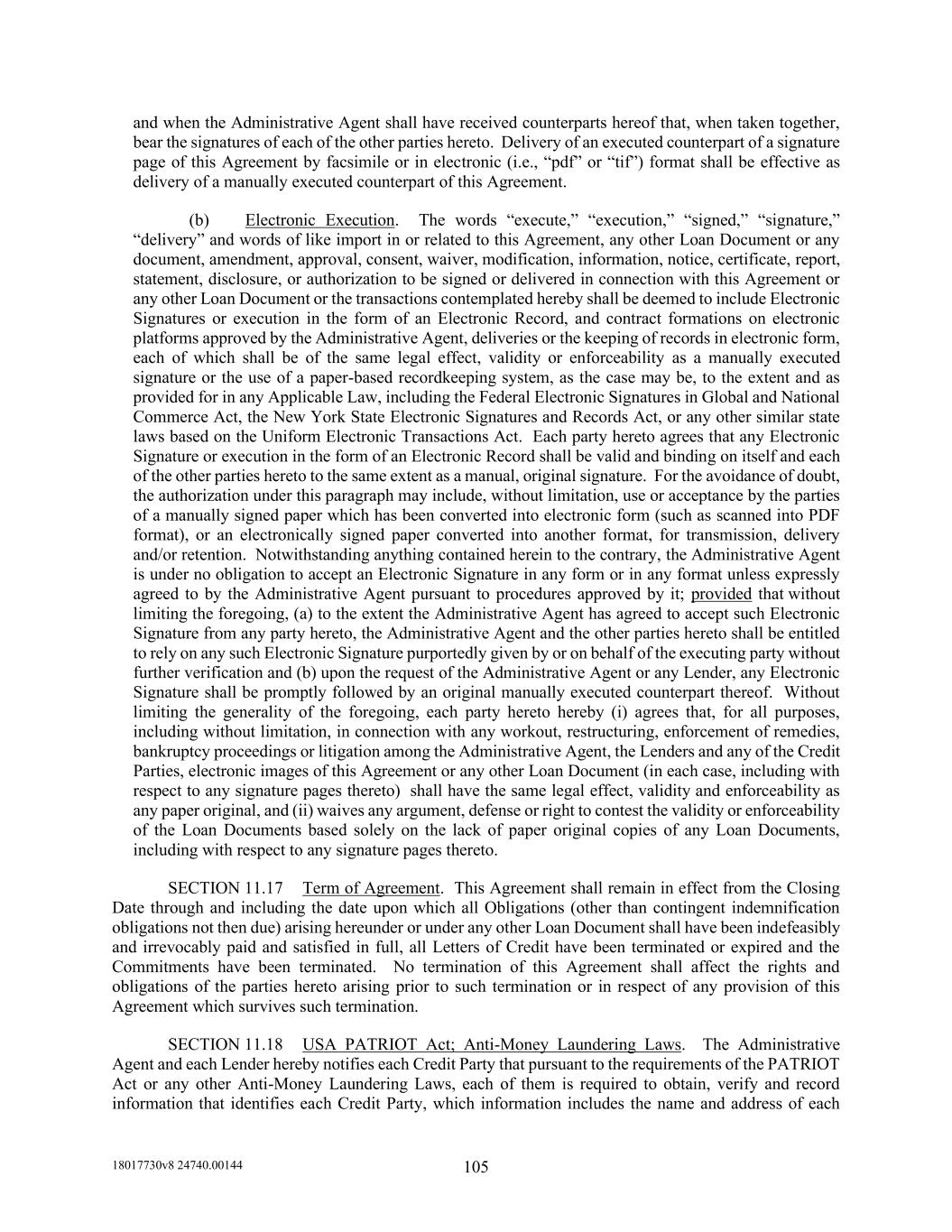 18017730v8 24740.00144 105 and when the Administrative Agent shall have received counterparts hereof that, when taken together, bear the signatures of each of the other parties hereto. Delivery of an executed counterpart of a signature page of this Agreement by facsimile or in electronic (i.e., “pdf” or “tif”) format shall be effective as delivery of a manually executed counterpart of this Agreement. (b) Electronic Execution. The words “execute,” “execution,” “signed,” “signature,” “delivery” and words of like import in or related to this Agreement, any other Loan Document or any document, amendment, approval, consent, waiver, modification, information, notice, certificate, report, statement, disclosure, or authorization to be signed or delivered in connection with this Agreement or any other Loan Document or the transactions contemplated hereby shall be deemed to include Electronic Signatures or execution in the form of an Electronic Record, and contract formations on electronic platforms approved by the Administrative Agent, deliveries or the keeping of records in electronic form, each of which shall be of the same legal effect, validity or enforceability as a manually executed signature or the use of a paper-based recordkeeping system, as the case may be, to the extent and as provided for in any Applicable Law, including the Federal Electronic Signatures in Global and National Commerce Act, the New York State Electronic Signatures and Records Act, or any other similar state laws based on the Uniform Electronic Transactions Act. Each party hereto agrees that any Electronic Signature or execution in the form of an Electronic Record shall be valid and binding on itself and each of the other parties hereto to the same extent as a manual, original signature. For the avoidance of doubt, the authorization under this paragraph may include, without limitation, use or acceptance by the parties of a manually signed paper which has been converted into electronic form (such as scanned into PDF format), or an electronically signed paper converted into another format, for transmission, delivery and/or retention. Notwithstanding anything contained herein to the contrary, the Administrative Agent is under no obligation to accept an Electronic Signature in any form or in any format unless expressly agreed to by the Administrative Agent pursuant to procedures approved by it; provided that without limiting the foregoing, (a) to the extent the Administrative Agent has agreed to accept such Electronic Signature from any party hereto, the Administrative Agent and the other parties hereto shall be entitled to rely on any such Electronic Signature purportedly given by or on behalf of the executing party without further verification and (b) upon the request of the Administrative Agent or any Lender, any Electronic Signature shall be promptly followed by an original manually executed counterpart thereof. Without limiting the generality of the foregoing, each party hereto hereby (i) agrees that, for all purposes, including without limitation, in connection with any workout, restructuring, enforcement of remedies, bankruptcy proceedings or litigation among the Administrative Agent, the Lenders and any of the Credit Parties, electronic images of this Agreement or any other Loan Document (in each case, including with respect to any signature pages thereto) shall have the same legal effect, validity and enforceability as any paper original, and (ii) waives any argument, defense or right to contest the validity or enforceability of the Loan Documents based solely on the lack of paper original copies of any Loan Documents, including with respect to any signature pages thereto. SECTION 11.17 Term of Agreement. This Agreement shall remain in effect from the Closing Date through and including the date upon which all Obligations (other than contingent indemnification obligations not then due) arising hereunder or under any other Loan Document shall have been indefeasibly and irrevocably paid and satisfied in full, all Letters of Credit have been terminated or expired and the Commitments have been terminated. No termination of this Agreement shall affect the rights and obligations of the parties hereto arising prior to such termination or in respect of any provision of this Agreement which survives such termination. SECTION 11.18 USA PATRIOT Act; Anti-Money Laundering Laws. The Administrative Agent and each Lender hereby notifies each Credit Party that pursuant to the requirements of the PATRIOT Act or any other Anti-Money Laundering Laws, each of them is required to obtain, verify and record information that identifies each Credit Party, which information includes the name and address of each