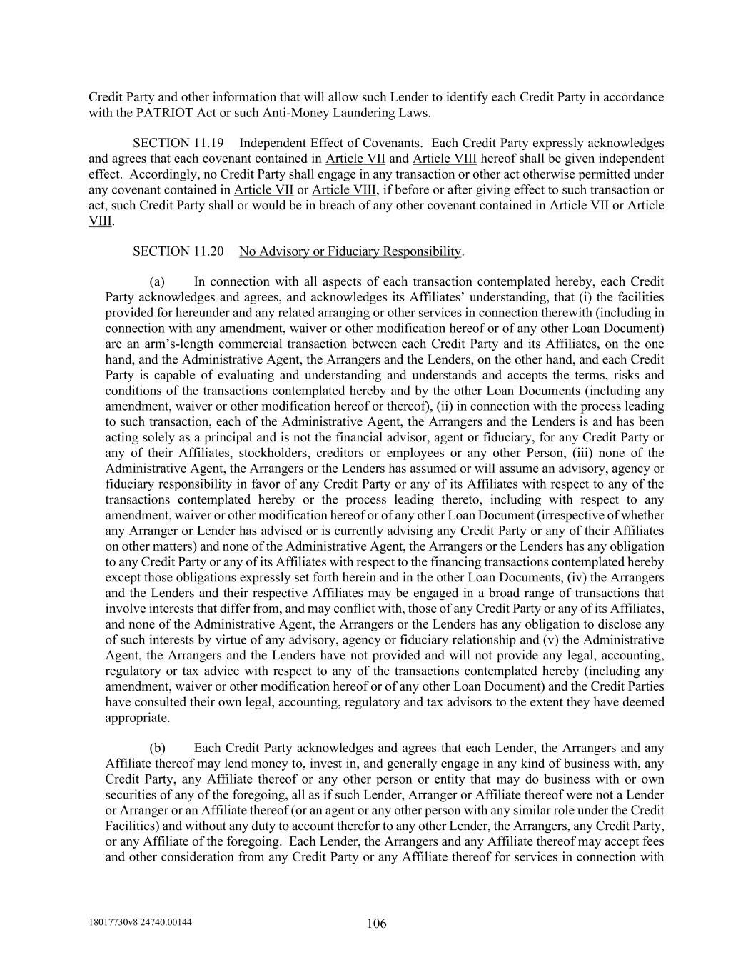 18017730v8 24740.00144 106 Credit Party and other information that will allow such Lender to identify each Credit Party in accordance with the PATRIOT Act or such Anti-Money Laundering Laws. SECTION 11.19 Independent Effect of Covenants. Each Credit Party expressly acknowledges and agrees that each covenant contained in Article VII and Article VIII hereof shall be given independent effect. Accordingly, no Credit Party shall engage in any transaction or other act otherwise permitted under any covenant contained in Article VII or Article VIII, if before or after giving effect to such transaction or act, such Credit Party shall or would be in breach of any other covenant contained in Article VII or Article VIII. SECTION 11.20 No Advisory or Fiduciary Responsibility. (a) In connection with all aspects of each transaction contemplated hereby, each Credit Party acknowledges and agrees, and acknowledges its Affiliates’ understanding, that (i) the facilities provided for hereunder and any related arranging or other services in connection therewith (including in connection with any amendment, waiver or other modification hereof or of any other Loan Document) are an arm’s-length commercial transaction between each Credit Party and its Affiliates, on the one hand, and the Administrative Agent, the Arrangers and the Lenders, on the other hand, and each Credit Party is capable of evaluating and understanding and understands and accepts the terms, risks and conditions of the transactions contemplated hereby and by the other Loan Documents (including any amendment, waiver or other modification hereof or thereof), (ii) in connection with the process leading to such transaction, each of the Administrative Agent, the Arrangers and the Lenders is and has been acting solely as a principal and is not the financial advisor, agent or fiduciary, for any Credit Party or any of their Affiliates, stockholders, creditors or employees or any other Person, (iii) none of the Administrative Agent, the Arrangers or the Lenders has assumed or will assume an advisory, agency or fiduciary responsibility in favor of any Credit Party or any of its Affiliates with respect to any of the transactions contemplated hereby or the process leading thereto, including with respect to any amendment, waiver or other modification hereof or of any other Loan Document (irrespective of whether any Arranger or Lender has advised or is currently advising any Credit Party or any of their Affiliates on other matters) and none of the Administrative Agent, the Arrangers or the Lenders has any obligation to any Credit Party or any of its Affiliates with respect to the financing transactions contemplated hereby except those obligations expressly set forth herein and in the other Loan Documents, (iv) the Arrangers and the Lenders and their respective Affiliates may be engaged in a broad range of transactions that involve interests that differ from, and may conflict with, those of any Credit Party or any of its Affiliates, and none of the Administrative Agent, the Arrangers or the Lenders has any obligation to disclose any of such interests by virtue of any advisory, agency or fiduciary relationship and (v) the Administrative Agent, the Arrangers and the Lenders have not provided and will not provide any legal, accounting, regulatory or tax advice with respect to any of the transactions contemplated hereby (including any amendment, waiver or other modification hereof or of any other Loan Document) and the Credit Parties have consulted their own legal, accounting, regulatory and tax advisors to the extent they have deemed appropriate. (b) Each Credit Party acknowledges and agrees that each Lender, the Arrangers and any Affiliate thereof may lend money to, invest in, and generally engage in any kind of business with, any Credit Party, any Affiliate thereof or any other person or entity that may do business with or own securities of any of the foregoing, all as if such Lender, Arranger or Affiliate thereof were not a Lender or Arranger or an Affiliate thereof (or an agent or any other person with any similar role under the Credit Facilities) and without any duty to account therefor to any other Lender, the Arrangers, any Credit Party, or any Affiliate of the foregoing. Each Lender, the Arrangers and any Affiliate thereof may accept fees and other consideration from any Credit Party or any Affiliate thereof for services in connection with