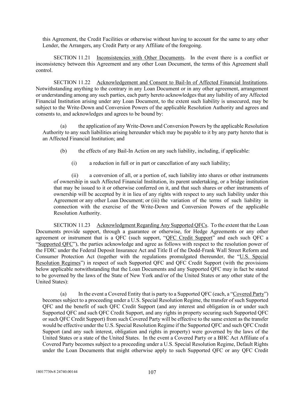 18017730v8 24740.00144 107 this Agreement, the Credit Facilities or otherwise without having to account for the same to any other Lender, the Arrangers, any Credit Party or any Affiliate of the foregoing. SECTION 11.21 Inconsistencies with Other Documents. In the event there is a conflict or inconsistency between this Agreement and any other Loan Document, the terms of this Agreement shall control. SECTION 11.22 Acknowledgement and Consent to Bail-In of Affected Financial Institutions. Notwithstanding anything to the contrary in any Loan Document or in any other agreement, arrangement or understanding among any such parties, each party hereto acknowledges that any liability of any Affected Financial Institution arising under any Loan Document, to the extent such liability is unsecured, may be subject to the Write-Down and Conversion Powers of the applicable Resolution Authority and agrees and consents to, and acknowledges and agrees to be bound by: (a) the application of any Write-Down and Conversion Powers by the applicable Resolution Authority to any such liabilities arising hereunder which may be payable to it by any party hereto that is an Affected Financial Institution; and (b) the effects of any Bail-In Action on any such liability, including, if applicable: (i) a reduction in full or in part or cancellation of any such liability; (ii) a conversion of all, or a portion of, such liability into shares or other instruments of ownership in such Affected Financial Institution, its parent undertaking, or a bridge institution that may be issued to it or otherwise conferred on it, and that such shares or other instruments of ownership will be accepted by it in lieu of any rights with respect to any such liability under this Agreement or any other Loan Document; or (iii) the variation of the terms of such liability in connection with the exercise of the Write-Down and Conversion Powers of the applicable Resolution Authority. SECTION 11.23 Acknowledgment Regarding Any Supported QFCs. To the extent that the Loan Documents provide support, through a guarantee or otherwise, for Hedge Agreements or any other agreement or instrument that is a QFC (such support, “QFC Credit Support” and each such QFC a “Supported QFC”), the parties acknowledge and agree as follows with respect to the resolution power of the FDIC under the Federal Deposit Insurance Act and Title II of the Dodd-Frank Wall Street Reform and Consumer Protection Act (together with the regulations promulgated thereunder, the “U.S. Special Resolution Regimes”) in respect of such Supported QFC and QFC Credit Support (with the provisions below applicable notwithstanding that the Loan Documents and any Supported QFC may in fact be stated to be governed by the laws of the State of New York and/or of the United States or any other state of the United States): (a) In the event a Covered Entity that is party to a Supported QFC (each, a “Covered Party”) becomes subject to a proceeding under a U.S. Special Resolution Regime, the transfer of such Supported QFC and the benefit of such QFC Credit Support (and any interest and obligation in or under such Supported QFC and such QFC Credit Support, and any rights in property securing such Supported QFC or such QFC Credit Support) from such Covered Party will be effective to the same extent as the transfer would be effective under the U.S. Special Resolution Regime if the Supported QFC and such QFC Credit Support (and any such interest, obligation and rights in property) were governed by the laws of the United States or a state of the United States. In the event a Covered Party or a BHC Act Affiliate of a Covered Party becomes subject to a proceeding under a U.S. Special Resolution Regime, Default Rights under the Loan Documents that might otherwise apply to such Supported QFC or any QFC Credit