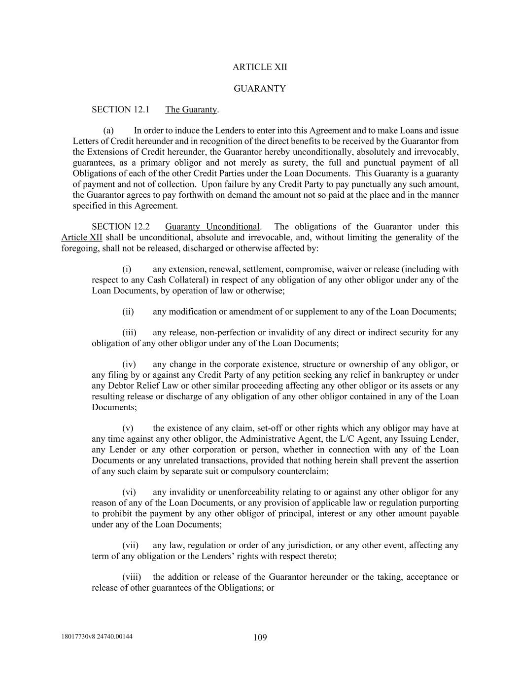 18017730v8 24740.00144 109 ARTICLE XII GUARANTY SECTION 12.1 The Guaranty. (a) In order to induce the Lenders to enter into this Agreement and to make Loans and issue Letters of Credit hereunder and in recognition of the direct benefits to be received by the Guarantor from the Extensions of Credit hereunder, the Guarantor hereby unconditionally, absolutely and irrevocably, guarantees, as a primary obligor and not merely as surety, the full and punctual payment of all Obligations of each of the other Credit Parties under the Loan Documents. This Guaranty is a guaranty of payment and not of collection. Upon failure by any Credit Party to pay punctually any such amount, the Guarantor agrees to pay forthwith on demand the amount not so paid at the place and in the manner specified in this Agreement. SECTION 12.2 Guaranty Unconditional. The obligations of the Guarantor under this Article XII shall be unconditional, absolute and irrevocable, and, without limiting the generality of the foregoing, shall not be released, discharged or otherwise affected by: (i) any extension, renewal, settlement, compromise, waiver or release (including with respect to any Cash Collateral) in respect of any obligation of any other obligor under any of the Loan Documents, by operation of law or otherwise; (ii) any modification or amendment of or supplement to any of the Loan Documents; (iii) any release, non-perfection or invalidity of any direct or indirect security for any obligation of any other obligor under any of the Loan Documents; (iv) any change in the corporate existence, structure or ownership of any obligor, or any filing by or against any Credit Party of any petition seeking any relief in bankruptcy or under any Debtor Relief Law or other similar proceeding affecting any other obligor or its assets or any resulting release or discharge of any obligation of any other obligor contained in any of the Loan Documents; (v) the existence of any claim, set-off or other rights which any obligor may have at any time against any other obligor, the Administrative Agent, the L/C Agent, any Issuing Lender, any Lender or any other corporation or person, whether in connection with any of the Loan Documents or any unrelated transactions, provided that nothing herein shall prevent the assertion of any such claim by separate suit or compulsory counterclaim; (vi) any invalidity or unenforceability relating to or against any other obligor for any reason of any of the Loan Documents, or any provision of applicable law or regulation purporting to prohibit the payment by any other obligor of principal, interest or any other amount payable under any of the Loan Documents; (vii) any law, regulation or order of any jurisdiction, or any other event, affecting any term of any obligation or the Lenders’ rights with respect thereto; (viii) the addition or release of the Guarantor hereunder or the taking, acceptance or release of other guarantees of the Obligations; or