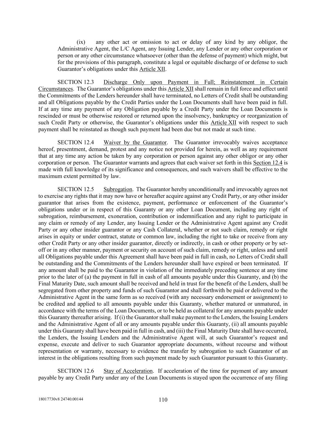 18017730v8 24740.00144 110 (ix) any other act or omission to act or delay of any kind by any obligor, the Administrative Agent, the L/C Agent, any Issuing Lender, any Lender or any other corporation or person or any other circumstance whatsoever (other than the defense of payment) which might, but for the provisions of this paragraph, constitute a legal or equitable discharge of or defense to such Guarantor’s obligations under this Article XII. SECTION 12.3 Discharge Only upon Payment in Full; Reinstatement in Certain Circumstances. The Guarantor’s obligations under this Article XII shall remain in full force and effect until the Commitments of the Lenders hereunder shall have terminated, no Letters of Credit shall be outstanding and all Obligations payable by the Credit Parties under the Loan Documents shall have been paid in full. If at any time any payment of any Obligation payable by a Credit Party under the Loan Documents is rescinded or must be otherwise restored or returned upon the insolvency, bankruptcy or reorganization of such Credit Party or otherwise, the Guarantor’s obligations under this Article XII with respect to such payment shall be reinstated as though such payment had been due but not made at such time. SECTION 12.4 Waiver by the Guarantor. The Guarantor irrevocably waives acceptance hereof, presentment, demand, protest and any notice not provided for herein, as well as any requirement that at any time any action be taken by any corporation or person against any other obligor or any other corporation or person. The Guarantor warrants and agrees that each waiver set forth in this Section 12.4 is made with full knowledge of its significance and consequences, and such waivers shall be effective to the maximum extent permitted by law. SECTION 12.5 Subrogation. The Guarantor hereby unconditionally and irrevocably agrees not to exercise any rights that it may now have or hereafter acquire against any Credit Party, or any other insider guarantor that arises from the existence, payment, performance or enforcement of the Guarantor’s obligations under or in respect of this Guaranty or any other Loan Document, including any right of subrogation, reimbursement, exoneration, contribution or indemnification and any right to participate in any claim or remedy of any Lender, any Issuing Lender or the Administrative Agent against any Credit Party or any other insider guarantor or any Cash Collateral, whether or not such claim, remedy or right arises in equity or under contract, statute or common law, including the right to take or receive from any other Credit Party or any other insider guarantor, directly or indirectly, in cash or other property or by set- off or in any other manner, payment or security on account of such claim, remedy or right, unless and until all Obligations payable under this Agreement shall have been paid in full in cash, no Letters of Credit shall be outstanding and the Commitments of the Lenders hereunder shall have expired or been terminated. If any amount shall be paid to the Guarantor in violation of the immediately preceding sentence at any time prior to the later of (a) the payment in full in cash of all amounts payable under this Guaranty, and (b) the Final Maturity Date, such amount shall be received and held in trust for the benefit of the Lenders, shall be segregated from other property and funds of such Guarantor and shall forthwith be paid or delivered to the Administrative Agent in the same form as so received (with any necessary endorsement or assignment) to be credited and applied to all amounts payable under this Guaranty, whether matured or unmatured, in accordance with the terms of the Loan Documents, or to be held as collateral for any amounts payable under this Guaranty thereafter arising. If (i) the Guarantor shall make payment to the Lenders, the Issuing Lenders and the Administrative Agent of all or any amounts payable under this Guaranty, (ii) all amounts payable under this Guaranty shall have been paid in full in cash, and (iii) the Final Maturity Date shall have occurred, the Lenders, the Issuing Lenders and the Administrative Agent will, at such Guarantor’s request and expense, execute and deliver to such Guarantor appropriate documents, without recourse and without representation or warranty, necessary to evidence the transfer by subrogation to such Guarantor of an interest in the obligations resulting from such payment made by such Guarantor pursuant to this Guaranty. SECTION 12.6 Stay of Acceleration. If acceleration of the time for payment of any amount payable by any Credit Party under any of the Loan Documents is stayed upon the occurrence of any filing