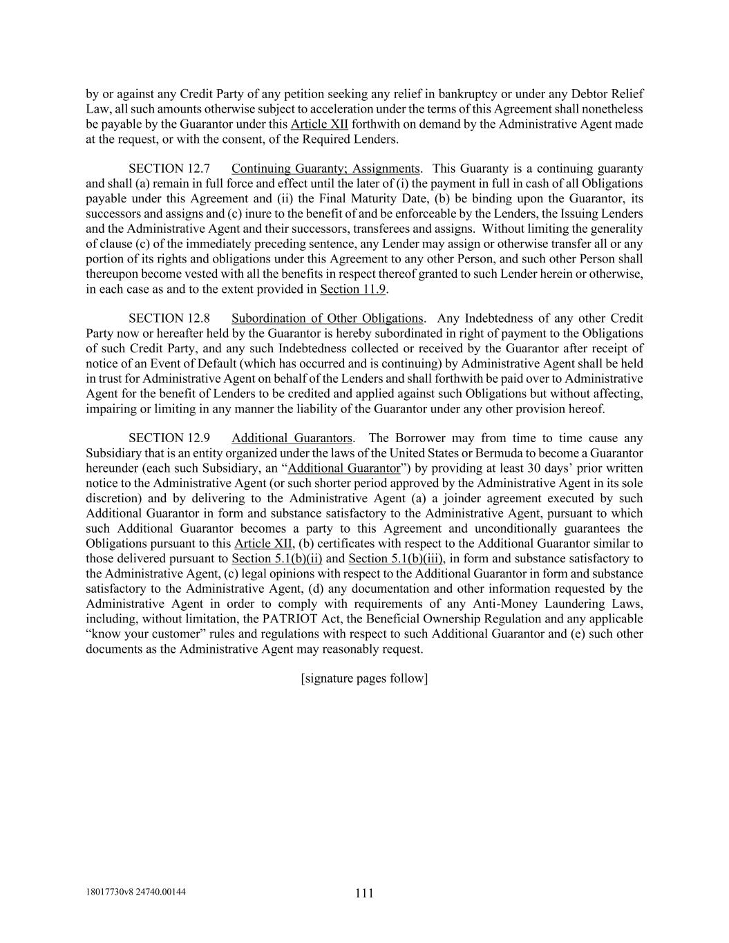 18017730v8 24740.00144 111 by or against any Credit Party of any petition seeking any relief in bankruptcy or under any Debtor Relief Law, all such amounts otherwise subject to acceleration under the terms of this Agreement shall nonetheless be payable by the Guarantor under this Article XII forthwith on demand by the Administrative Agent made at the request, or with the consent, of the Required Lenders. SECTION 12.7 Continuing Guaranty; Assignments. This Guaranty is a continuing guaranty and shall (a) remain in full force and effect until the later of (i) the payment in full in cash of all Obligations payable under this Agreement and (ii) the Final Maturity Date, (b) be binding upon the Guarantor, its successors and assigns and (c) inure to the benefit of and be enforceable by the Lenders, the Issuing Lenders and the Administrative Agent and their successors, transferees and assigns. Without limiting the generality of clause (c) of the immediately preceding sentence, any Lender may assign or otherwise transfer all or any portion of its rights and obligations under this Agreement to any other Person, and such other Person shall thereupon become vested with all the benefits in respect thereof granted to such Lender herein or otherwise, in each case as and to the extent provided in Section 11.9. SECTION 12.8 Subordination of Other Obligations. Any Indebtedness of any other Credit Party now or hereafter held by the Guarantor is hereby subordinated in right of payment to the Obligations of such Credit Party, and any such Indebtedness collected or received by the Guarantor after receipt of notice of an Event of Default (which has occurred and is continuing) by Administrative Agent shall be held in trust for Administrative Agent on behalf of the Lenders and shall forthwith be paid over to Administrative Agent for the benefit of Lenders to be credited and applied against such Obligations but without affecting, impairing or limiting in any manner the liability of the Guarantor under any other provision hereof. SECTION 12.9 Additional Guarantors. The Borrower may from time to time cause any Subsidiary that is an entity organized under the laws of the United States or Bermuda to become a Guarantor hereunder (each such Subsidiary, an “Additional Guarantor”) by providing at least 30 days’ prior written notice to the Administrative Agent (or such shorter period approved by the Administrative Agent in its sole discretion) and by delivering to the Administrative Agent (a) a joinder agreement executed by such Additional Guarantor in form and substance satisfactory to the Administrative Agent, pursuant to which such Additional Guarantor becomes a party to this Agreement and unconditionally guarantees the Obligations pursuant to this Article XII, (b) certificates with respect to the Additional Guarantor similar to those delivered pursuant to Section 5.1(b)(ii) and Section 5.1(b)(iii), in form and substance satisfactory to the Administrative Agent, (c) legal opinions with respect to the Additional Guarantor in form and substance satisfactory to the Administrative Agent, (d) any documentation and other information requested by the Administrative Agent in order to comply with requirements of any Anti-Money Laundering Laws, including, without limitation, the PATRIOT Act, the Beneficial Ownership Regulation and any applicable “know your customer” rules and regulations with respect to such Additional Guarantor and (e) such other documents as the Administrative Agent may reasonably request. [signature pages follow]
