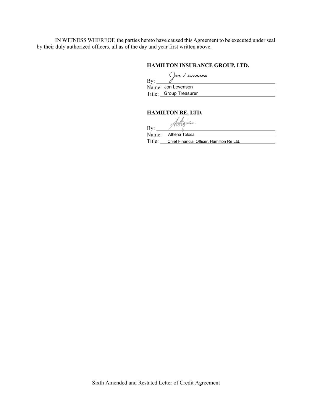 Sixth Amended and Restated Letter of Credit Agreement IN WITNESS WHEREOF, the parties hereto have caused this Agreement to be executed under seal by their duly authorized officers, all as of the day and year first written above. HAMILTON INSURANCE GROUP, LTD. By: Name: Title: HAMILTON RE, LTD. By: Name: Title: Jon Levenson Group Treasurer Athena Tolosa Chief Financial Officer, Hamilton Re Ltd.