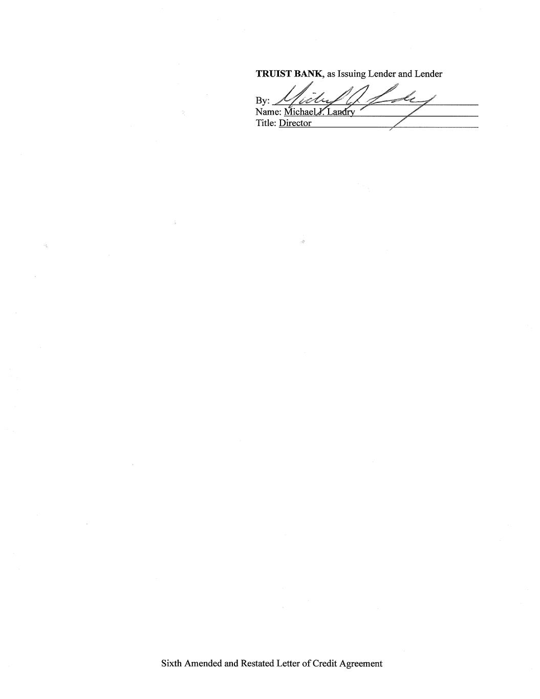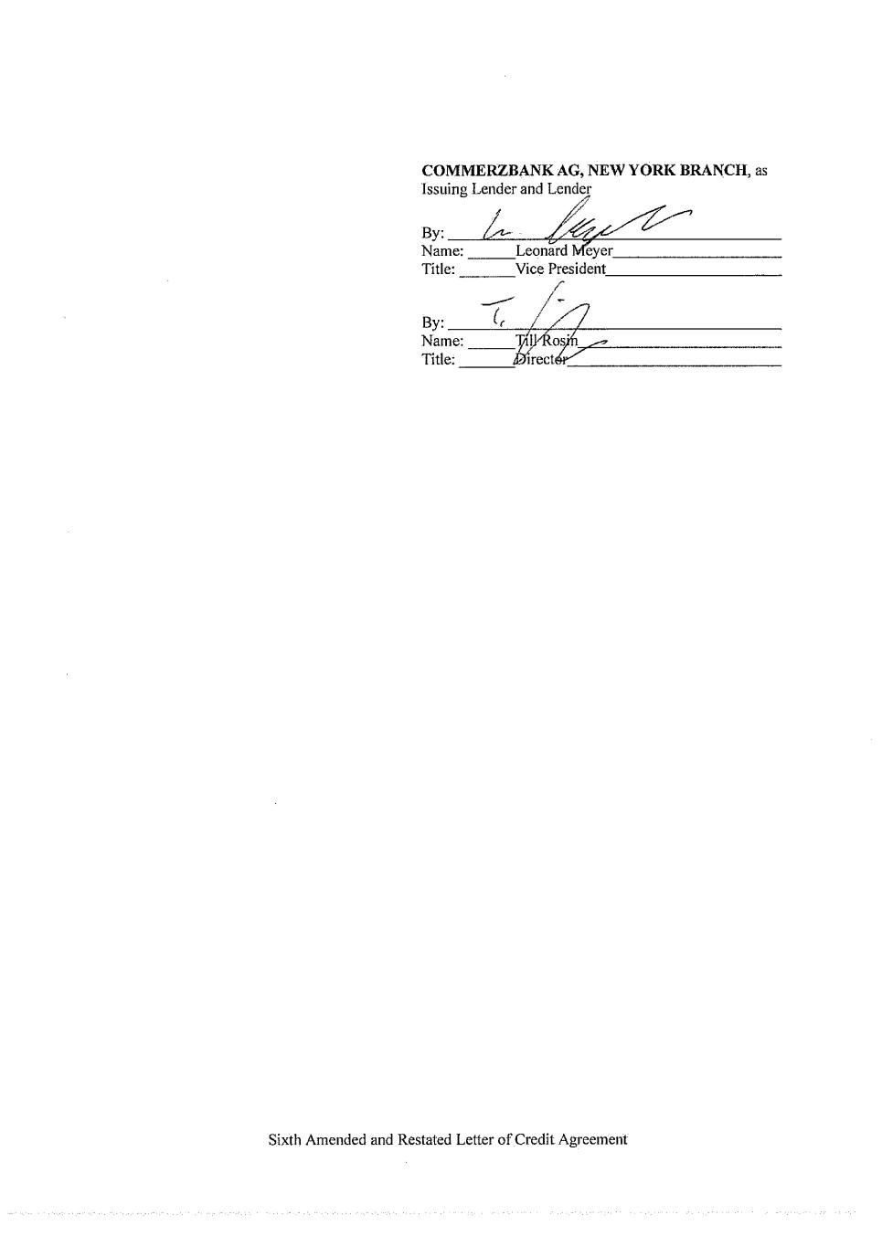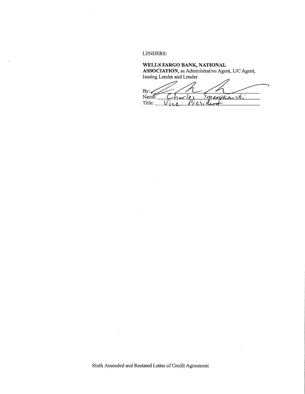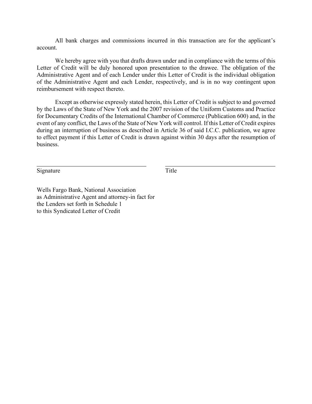 All bank charges and commissions incurred in this transaction are for the applicant’s account. We hereby agree with you that drafts drawn under and in compliance with the terms of this Letter of Credit will be duly honored upon presentation to the drawee. The obligation of the Administrative Agent and of each Lender under this Letter of Credit is the individual obligation of the Administrative Agent and each Lender, respectively, and is in no way contingent upon reimbursement with respect thereto. Except as otherwise expressly stated herein, this Letter of Credit is subject to and governed by the Laws of the State of New York and the 2007 revision of the Uniform Customs and Practice for Documentary Credits of the International Chamber of Commerce (Publication 600) and, in the event of any conflict, the Laws of the State of New York will control. If this Letter of Credit expires during an interruption of business as described in Article 36 of said I.C.C. publication, we agree to effect payment if this Letter of Credit is drawn against within 30 days after the resumption of business. Signature Title Wells Fargo Bank, National Association as Administrative Agent and attorney-in fact for the Lenders set forth in Schedule 1 to this Syndicated Letter of Credit