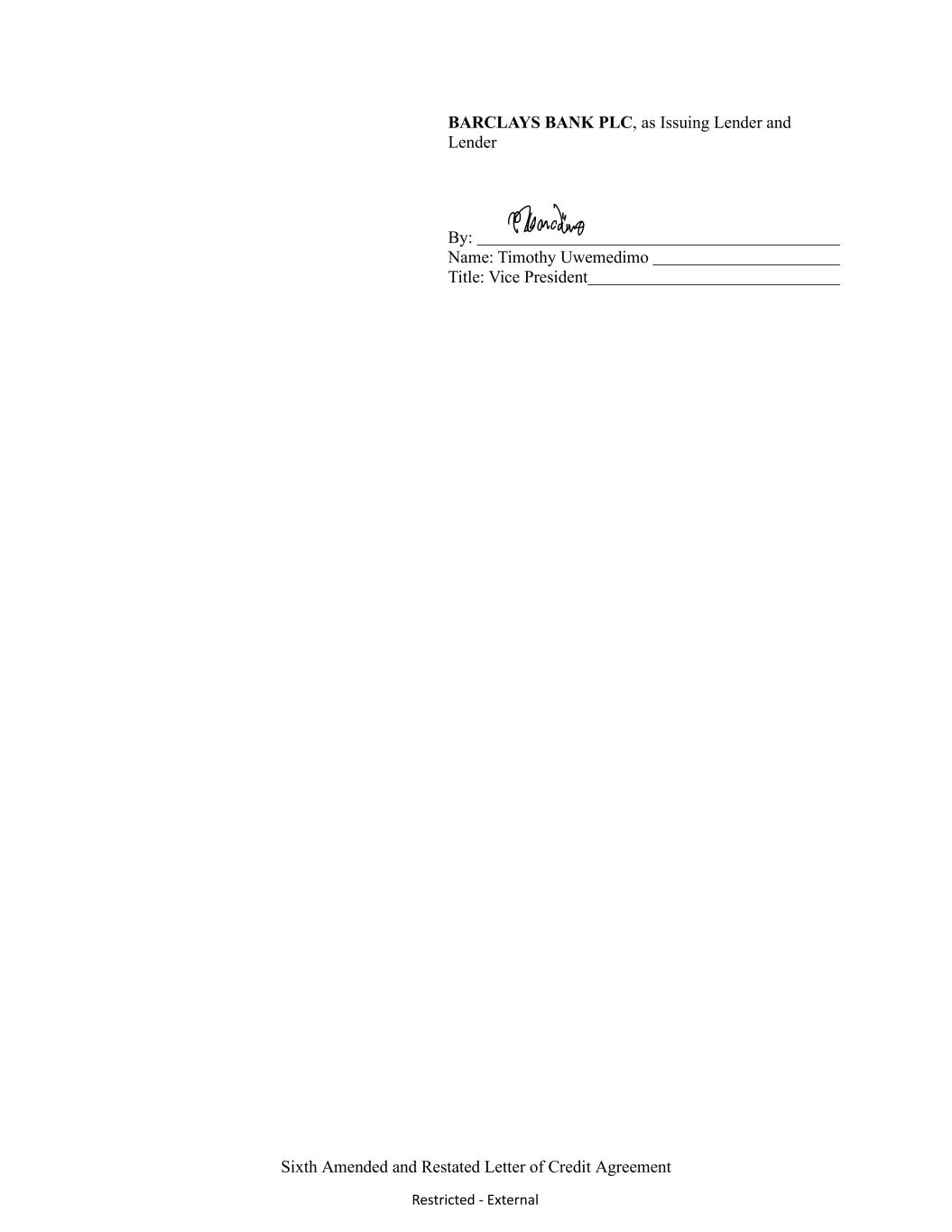 Sixth Amended and Restated Letter of Credit Agreement Restricted - External BARCLAYS BANK PLC, as Issuing Lender and Lender By: Name: Timothy Uwemedimo Title: Vice President
