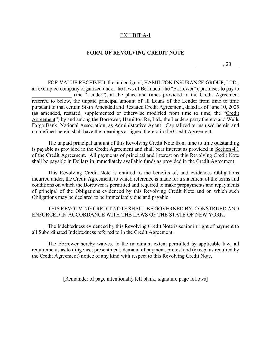 EXHIBIT A-1 FORM OF REVOLVING CREDIT NOTE __________, 20___ FOR VALUE RECEIVED, the undersigned, HAMILTON INSURANCE GROUP, LTD., an exempted company organized under the laws of Bermuda (the “Borrower”), promises to pay to _______________ (the “Lender”), at the place and times provided in the Credit Agreement referred to below, the unpaid principal amount of all Loans of the Lender from time to time pursuant to that certain Sixth Amended and Restated Credit Agreement, dated as of June 10, 2025 (as amended, restated, supplemented or otherwise modified from time to time, the “Credit Agreement”) by and among the Borrower, Hamilton Re, Ltd., the Lenders party thereto and Wells Fargo Bank, National Association, as Administrative Agent. Capitalized terms used herein and not defined herein shall have the meanings assigned thereto in the Credit Agreement. The unpaid principal amount of this Revolving Credit Note from time to time outstanding is payable as provided in the Credit Agreement and shall bear interest as provided in Section 4.1 of the Credit Agreement. All payments of principal and interest on this Revolving Credit Note shall be payable in Dollars in immediately available funds as provided in the Credit Agreement. This Revolving Credit Note is entitled to the benefits of, and evidences Obligations incurred under, the Credit Agreement, to which reference is made for a statement of the terms and conditions on which the Borrower is permitted and required to make prepayments and repayments of principal of the Obligations evidenced by this Revolving Credit Note and on which such Obligations may be declared to be immediately due and payable. THIS REVOLVING CREDIT NOTE SHALL BE GOVERNED BY, CONSTRUED AND ENFORCED IN ACCORDANCE WITH THE LAWS OF THE STATE OF NEW YORK. The Indebtedness evidenced by this Revolving Credit Note is senior in right of payment to all Subordinated Indebtedness referred to in the Credit Agreement. The Borrower hereby waives, to the maximum extent permitted by applicable law, all requirements as to diligence, presentment, demand of payment, protest and (except as required by the Credit Agreement) notice of any kind with respect to this Revolving Credit Note. [Remainder of page intentionally left blank; signature page follows]