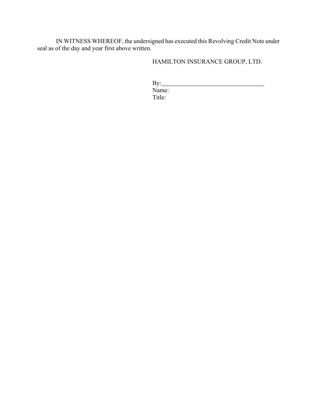 IN WITNESS WHEREOF, the undersigned has executed this Revolving Credit Note under seal as of the day and year first above written. HAMILTON INSURANCE GROUP, LTD. By: Name: Title: