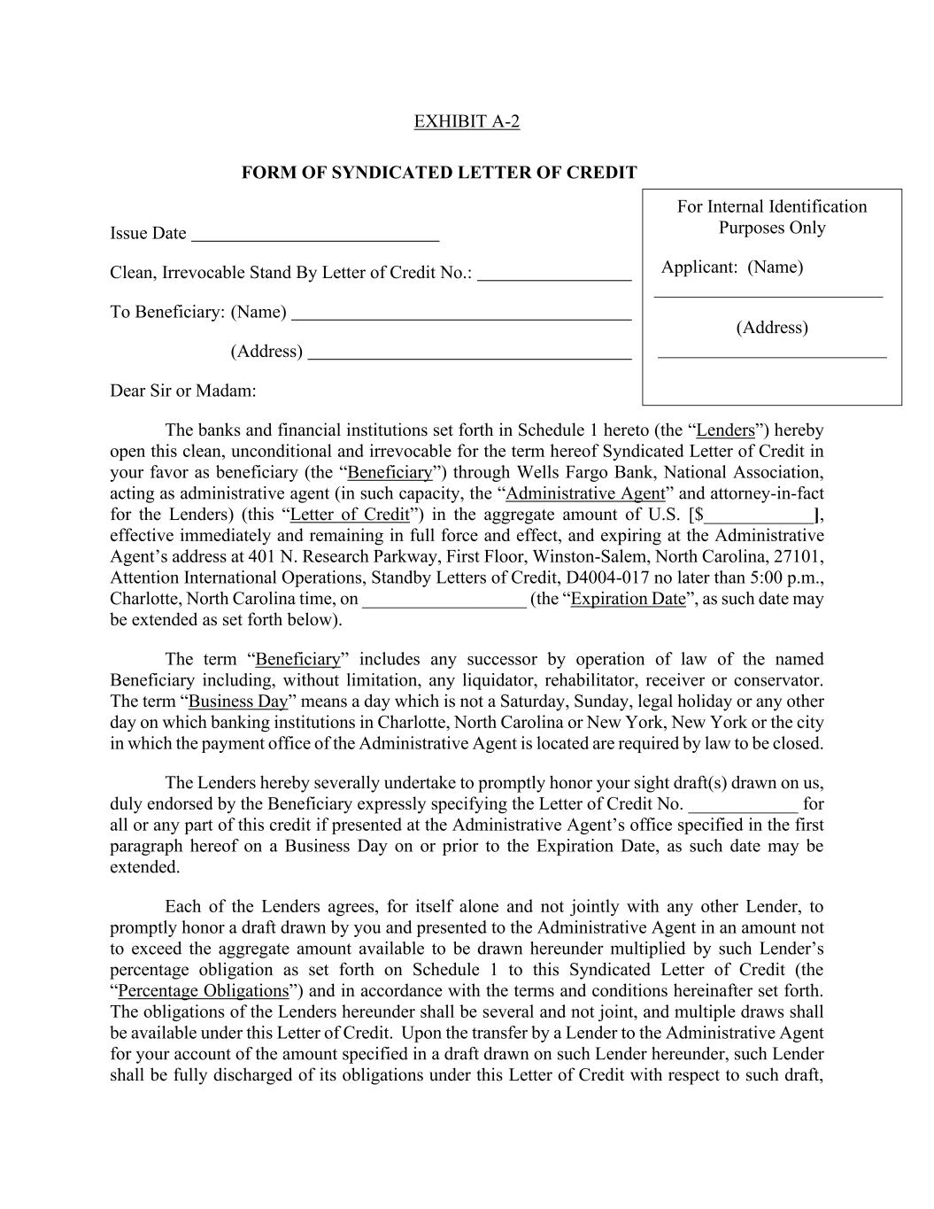 For Internal Identification Purposes Only Applicant: (Name) _________________________ (Address) _________________________ EXHIBIT A-2 FORM OF SYNDICATED LETTER OF CREDIT Issue Date Clean, Irrevocable Stand By Letter of Credit No.: To Beneficiary: (Name) (Address) Dear Sir or Madam: The banks and financial institutions set forth in Schedule 1 hereto (the “Lenders”) hereby open this clean, unconditional and irrevocable for the term hereof Syndicated Letter of Credit in your favor as beneficiary (the “Beneficiary”) through Wells Fargo Bank, National Association, acting as administrative agent (in such capacity, the “Administrative Agent” and attorney-in-fact for the Lenders) (this “Letter of Credit”) in the aggregate amount of U.S. [$____________], effective immediately and remaining in full force and effect, and expiring at the Administrative Agent’s address at 401 N. Research Parkway, First Floor, Winston-Salem, North Carolina, 27101, Attention International Operations, Standby Letters of Credit, D4004-017 no later than 5:00 p.m., Charlotte, North Carolina time, on __________________ (the “Expiration Date”, as such date may be extended as set forth below). The term “Beneficiary” includes any successor by operation of law of the named Beneficiary including, without limitation, any liquidator, rehabilitator, receiver or conservator. The term “Business Day” means a day which is not a Saturday, Sunday, legal holiday or any other day on which banking institutions in Charlotte, North Carolina or New York, New York or the city in which the payment office of the Administrative Agent is located are required by law to be closed. The Lenders hereby severally undertake to promptly honor your sight draft(s) drawn on us, duly endorsed by the Beneficiary expressly specifying the Letter of Credit No. ____________ for all or any part of this credit if presented at the Administrative Agent’s office specified in the first paragraph hereof on a Business Day on or prior to the Expiration Date, as such date may be extended. Each of the Lenders agrees, for itself alone and not jointly with any other Lender, to promptly honor a draft drawn by you and presented to the Administrative Agent in an amount not to exceed the aggregate amount available to be drawn hereunder multiplied by such Lender’s percentage obligation as set forth on Schedule 1 to this Syndicated Letter of Credit (the “Percentage Obligations”) and in accordance with the terms and conditions hereinafter set forth. The obligations of the Lenders hereunder shall be several and not joint, and multiple draws shall be available under this Letter of Credit. Upon the transfer by a Lender to the Administrative Agent for your account of the amount specified in a draft drawn on such Lender hereunder, such Lender shall be fully discharged of its obligations under this Letter of Credit with respect to such draft,