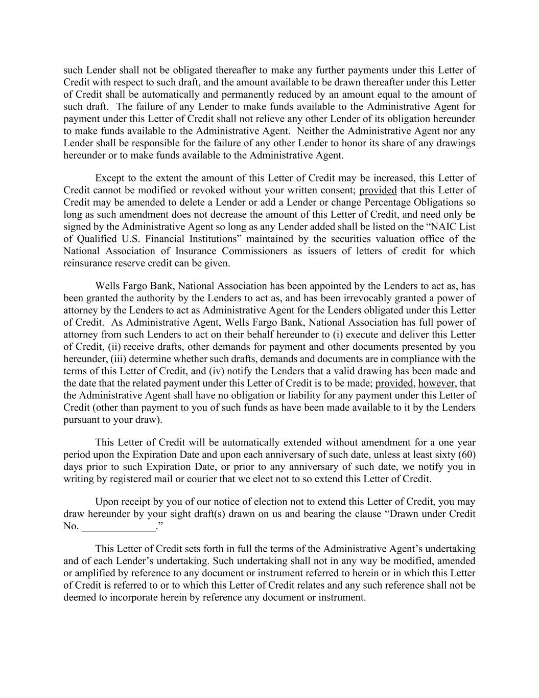 such Lender shall not be obligated thereafter to make any further payments under this Letter of Credit with respect to such draft, and the amount available to be drawn thereafter under this Letter of Credit shall be automatically and permanently reduced by an amount equal to the amount of such draft. The failure of any Lender to make funds available to the Administrative Agent for payment under this Letter of Credit shall not relieve any other Lender of its obligation hereunder to make funds available to the Administrative Agent. Neither the Administrative Agent nor any Lender shall be responsible for the failure of any other Lender to honor its share of any drawings hereunder or to make funds available to the Administrative Agent. Except to the extent the amount of this Letter of Credit may be increased, this Letter of Credit cannot be modified or revoked without your written consent; provided that this Letter of Credit may be amended to delete a Lender or add a Lender or change Percentage Obligations so long as such amendment does not decrease the amount of this Letter of Credit, and need only be signed by the Administrative Agent so long as any Lender added shall be listed on the “NAIC List of Qualified U.S. Financial Institutions” maintained by the securities valuation office of the National Association of Insurance Commissioners as issuers of letters of credit for which reinsurance reserve credit can be given. Wells Fargo Bank, National Association has been appointed by the Lenders to act as, has been granted the authority by the Lenders to act as, and has been irrevocably granted a power of attorney by the Lenders to act as Administrative Agent for the Lenders obligated under this Letter of Credit. As Administrative Agent, Wells Fargo Bank, National Association has full power of attorney from such Lenders to act on their behalf hereunder to (i) execute and deliver this Letter of Credit, (ii) receive drafts, other demands for payment and other documents presented by you hereunder, (iii) determine whether such drafts, demands and documents are in compliance with the terms of this Letter of Credit, and (iv) notify the Lenders that a valid drawing has been made and the date that the related payment under this Letter of Credit is to be made; provided, however, that the Administrative Agent shall have no obligation or liability for any payment under this Letter of Credit (other than payment to you of such funds as have been made available to it by the Lenders pursuant to your draw). This Letter of Credit will be automatically extended without amendment for a one year period upon the Expiration Date and upon each anniversary of such date, unless at least sixty (60) days prior to such Expiration Date, or prior to any anniversary of such date, we notify you in writing by registered mail or courier that we elect not to so extend this Letter of Credit. Upon receipt by you of our notice of election not to extend this Letter of Credit, you may draw hereunder by your sight draft(s) drawn on us and bearing the clause “Drawn under Credit No. ______________.” This Letter of Credit sets forth in full the terms of the Administrative Agent’s undertaking and of each Lender’s undertaking. Such undertaking shall not in any way be modified, amended or amplified by reference to any document or instrument referred to herein or in which this Letter of Credit is referred to or to which this Letter of Credit relates and any such reference shall not be deemed to incorporate herein by reference any document or instrument.