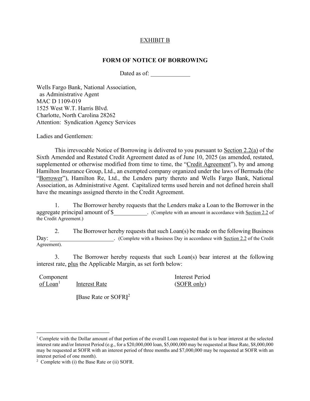 EXHIBIT B FORM OF NOTICE OF BORROWING Dated as of: _____________ Wells Fargo Bank, National Association, as Administrative Agent MAC D 1109-019 1525 West W.T. Harris Blvd. Charlotte, North Carolina 28262 Attention: Syndication Agency Services Ladies and Gentlemen: This irrevocable Notice of Borrowing is delivered to you pursuant to Section 2.2(a) of the Sixth Amended and Restated Credit Agreement dated as of June 10, 2025 (as amended, restated, supplemented or otherwise modified from time to time, the “Credit Agreement”), by and among Hamilton Insurance Group, Ltd., an exempted company organized under the laws of Bermuda (the “Borrower”), Hamilton Re, Ltd., the Lenders party thereto and Wells Fargo Bank, National Association, as Administrative Agent. Capitalized terms used herein and not defined herein shall have the meanings assigned thereto in the Credit Agreement. 1. The Borrower hereby requests that the Lenders make a Loan to the Borrower in the aggregate principal amount of $___________. (Complete with an amount in accordance with Section 2.2 of the Credit Agreement.) 2. The Borrower hereby requests that such Loan(s) be made on the following Business Day: _____________________. (Complete with a Business Day in accordance with Section 2.2 of the Credit Agreement). 3. The Borrower hereby requests that such Loan(s) bear interest at the following interest rate, plus the Applicable Margin, as set forth below: Component of Loan1 Interest Rate Interest Period (SOFR only) [Base Rate or SOFR]2 1 Complete with the Dollar amount of that portion of the overall Loan requested that is to bear interest at the selected interest rate and/or Interest Period (e.g., for a $20,000,000 loan, $5,000,000 may be requested at Base Rate, $8,000,000 may be requested at SOFR with an interest period of three months and $7,000,000 may be requested at SOFR with an interest period of one month). 2 Complete with (i) the Base Rate or (ii) SOFR.