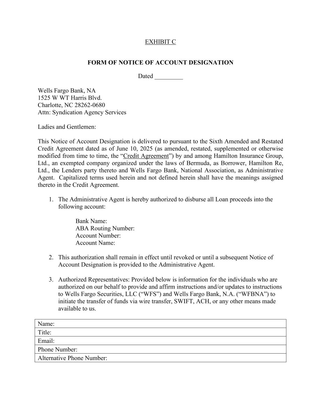 EXHIBIT C FORM OF NOTICE OF ACCOUNT DESIGNATION Dated _________ Wells Fargo Bank, NA 1525 W WT Harris Blvd. Charlotte, NC 28262-0680 Attn: Syndication Agency Services Ladies and Gentlemen: This Notice of Account Designation is delivered to pursuant to the Sixth Amended and Restated Credit Agreement dated as of June 10, 2025 (as amended, restated, supplemented or otherwise modified from time to time, the “Credit Agreement”) by and among Hamilton Insurance Group, Ltd., an exempted company organized under the laws of Bermuda, as Borrower, Hamilton Re, Ltd., the Lenders party thereto and Wells Fargo Bank, National Association, as Administrative Agent. Capitalized terms used herein and not defined herein shall have the meanings assigned thereto in the Credit Agreement. 1. The Administrative Agent is hereby authorized to disburse all Loan proceeds into the following account: Bank Name: ABA Routing Number: Account Number: Account Name: 2. This authorization shall remain in effect until revoked or until a subsequent Notice of Account Designation is provided to the Administrative Agent. 3. Authorized Representatives: Provided below is information for the individuals who are authorized on our behalf to provide and affirm instructions and/or updates to instructions to Wells Fargo Securities, LLC (“WFS”) and Wells Fargo Bank, N.A. (“WFBNA”) to initiate the transfer of funds via wire transfer, SWIFT, ACH, or any other means made available to us. Name: Title: Email: Phone Number: Alternative Phone Number: